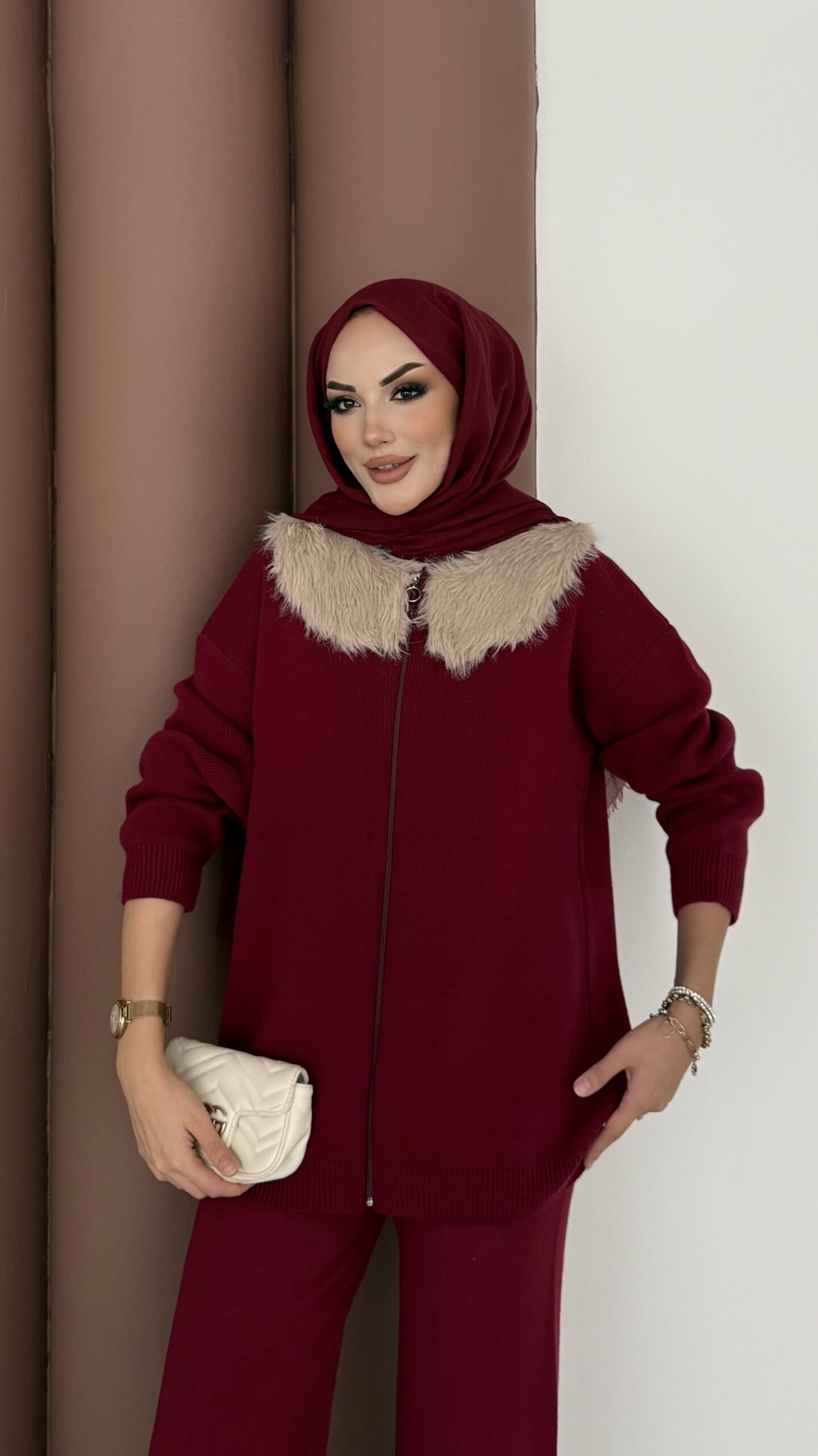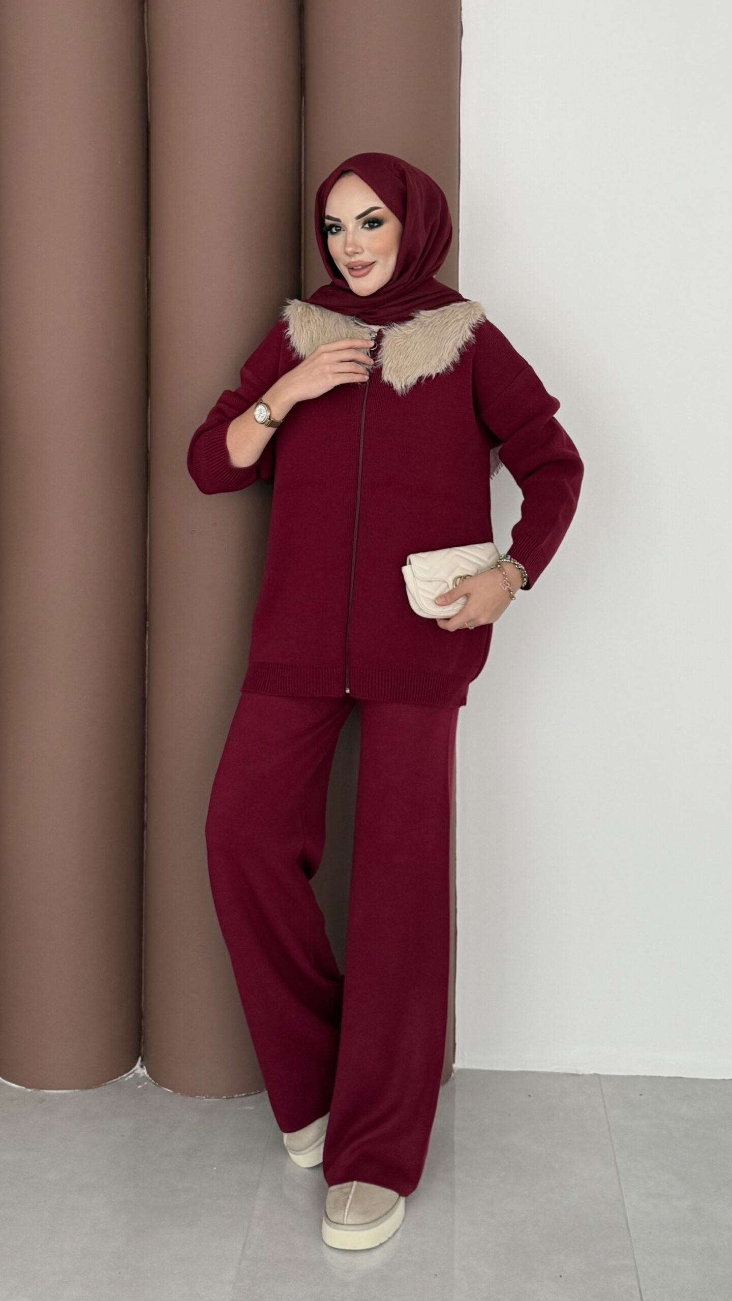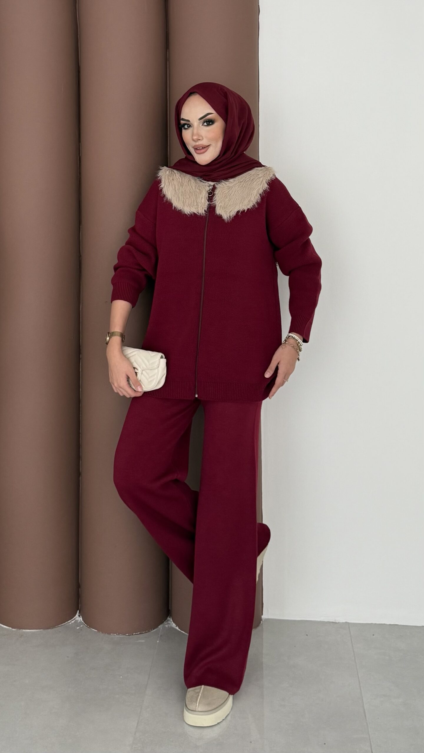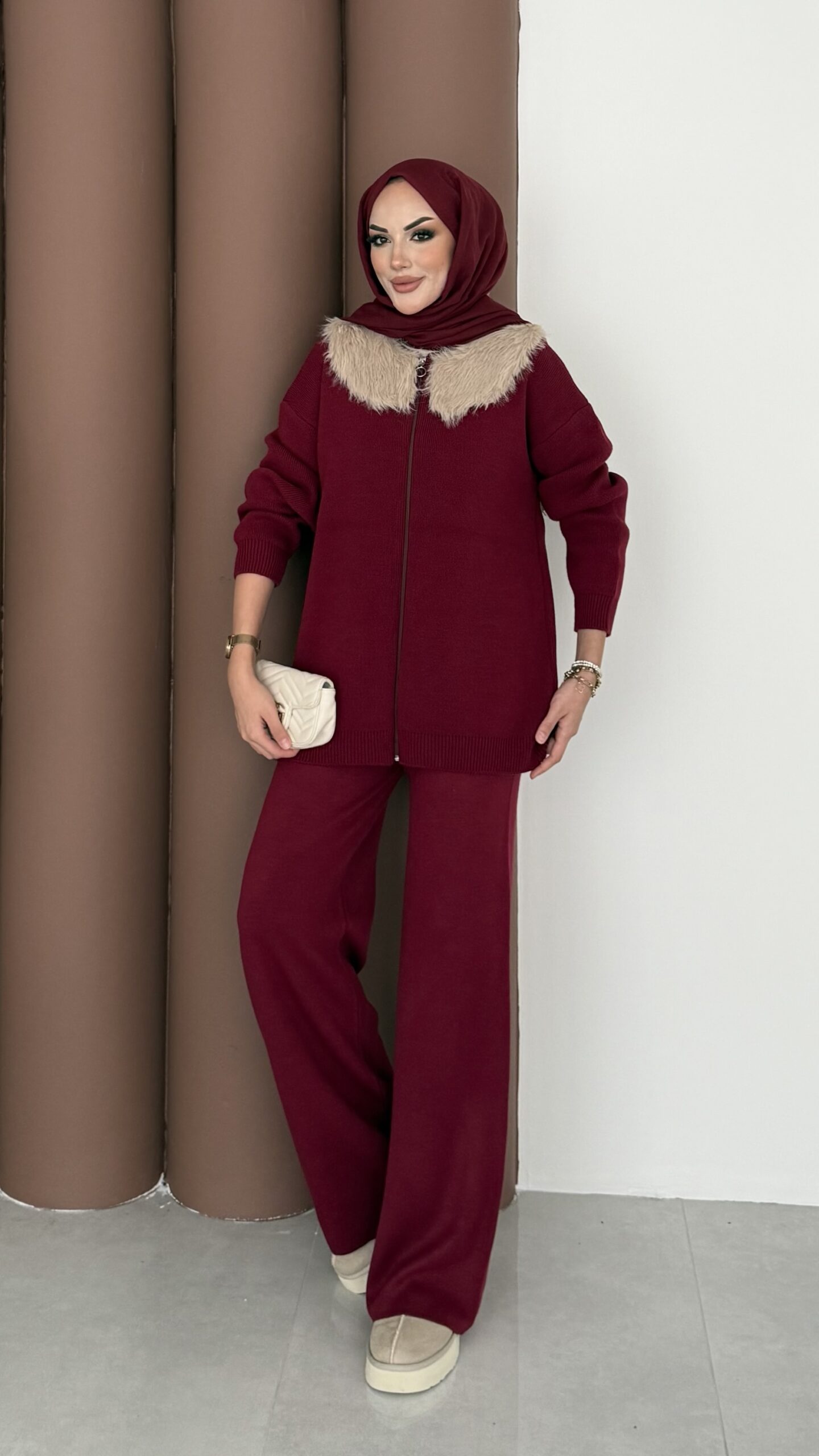 Lolita Çıkarılabilir Kürklü Triko İkili Takım – Bordo