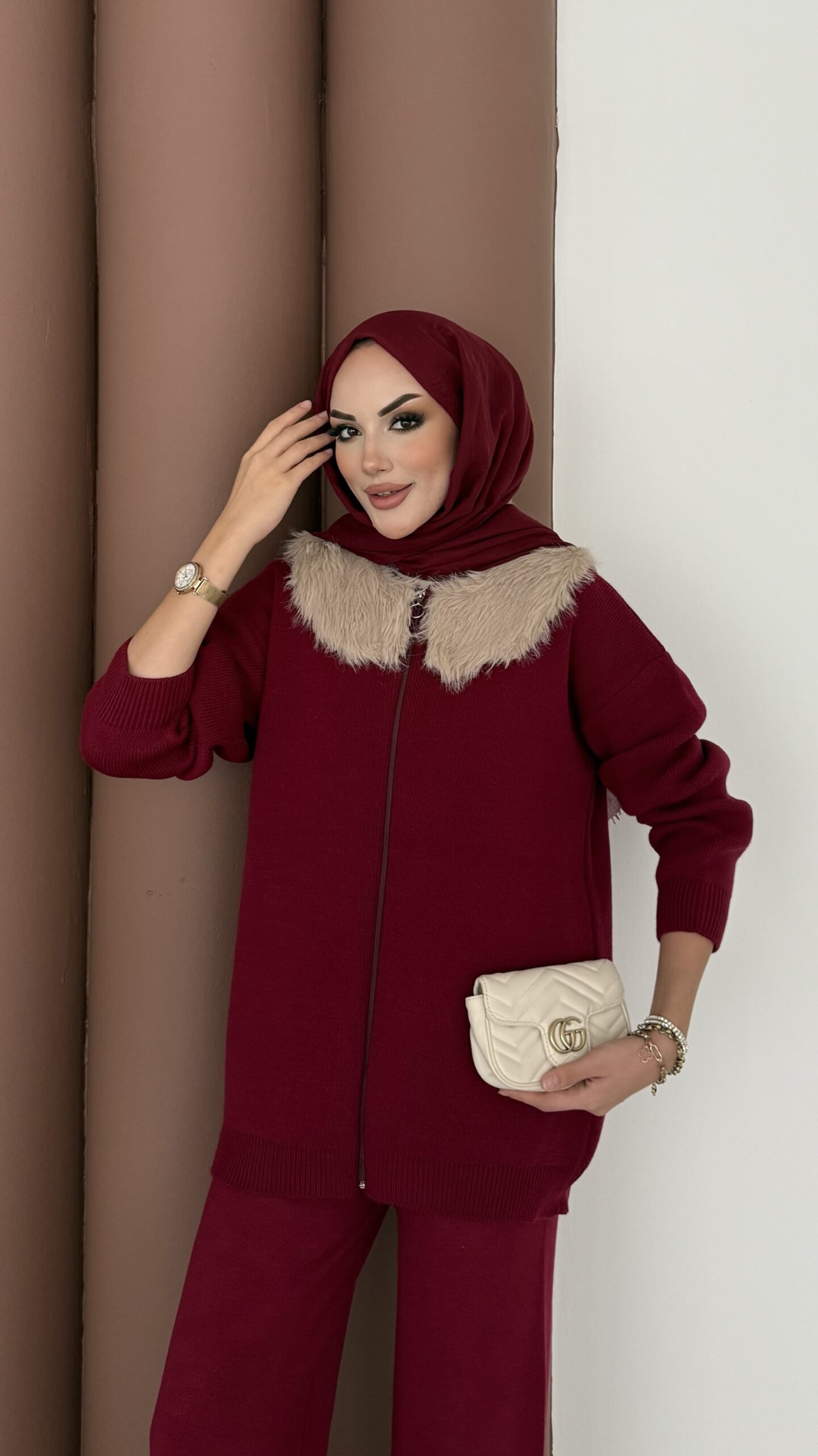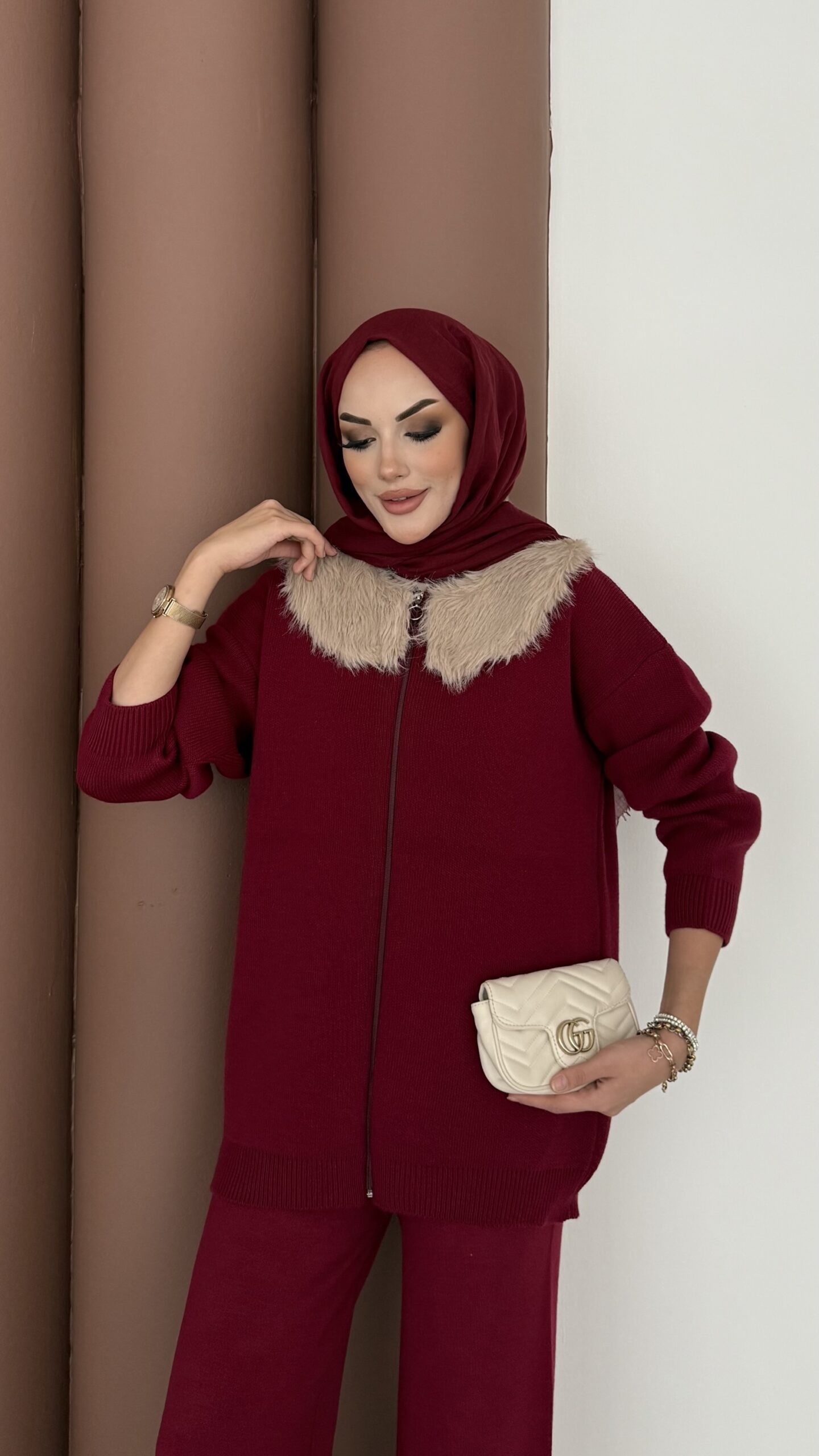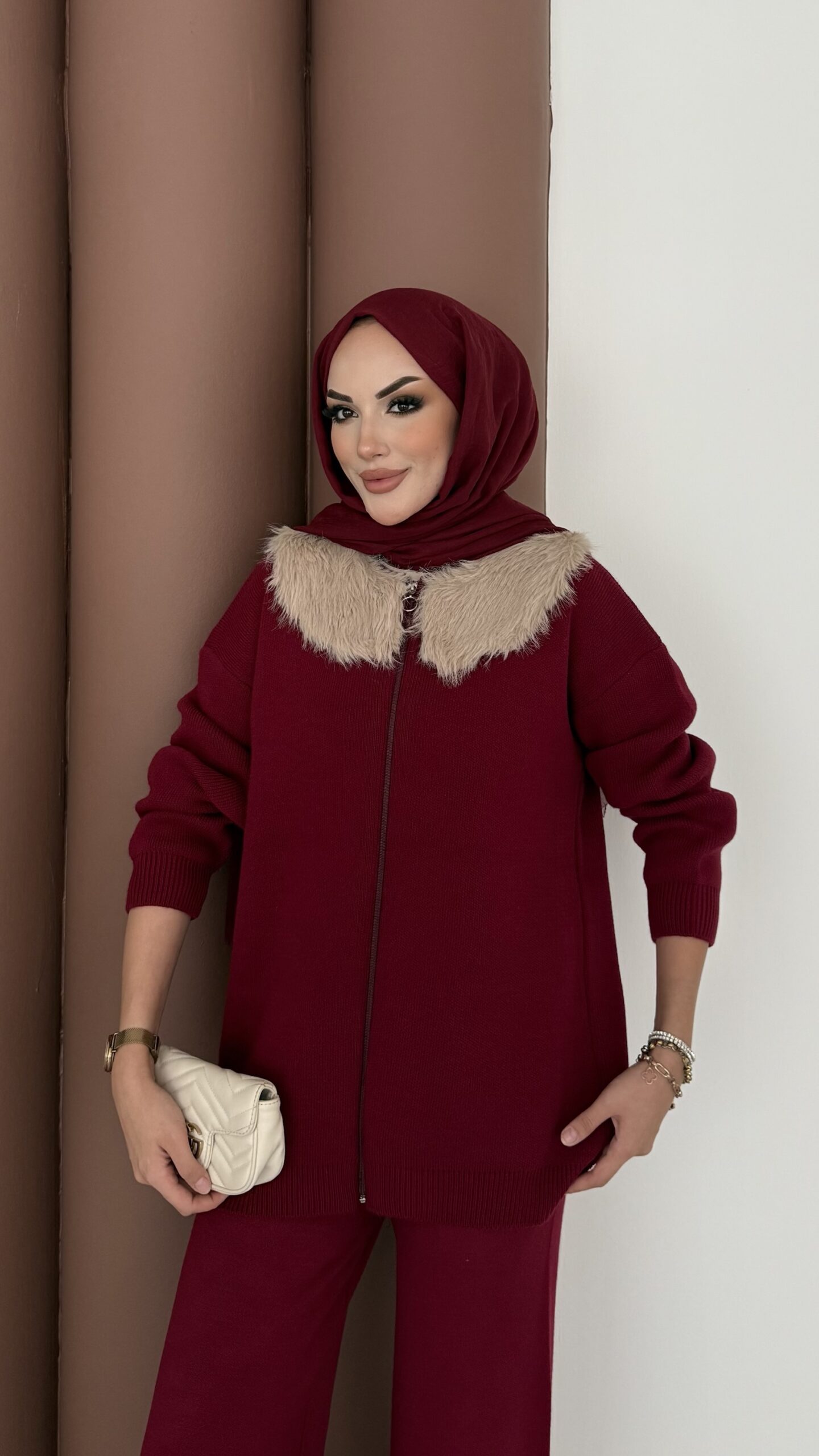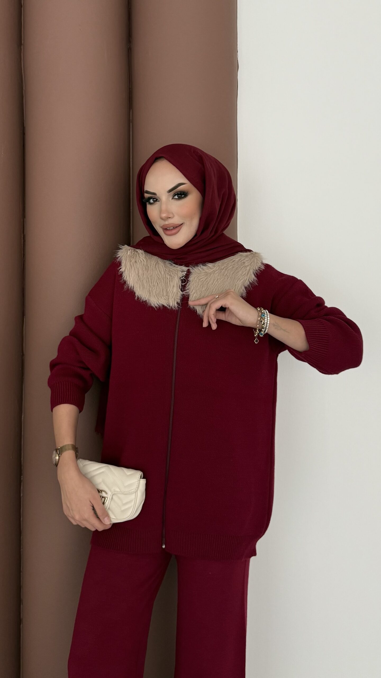 Lolita Çıkarılabilir Kürklü Triko İkili Takım – Bordo