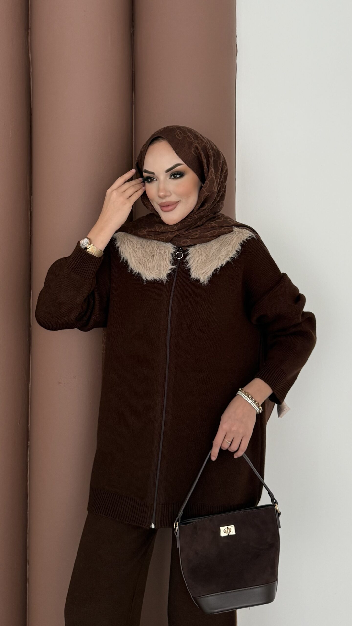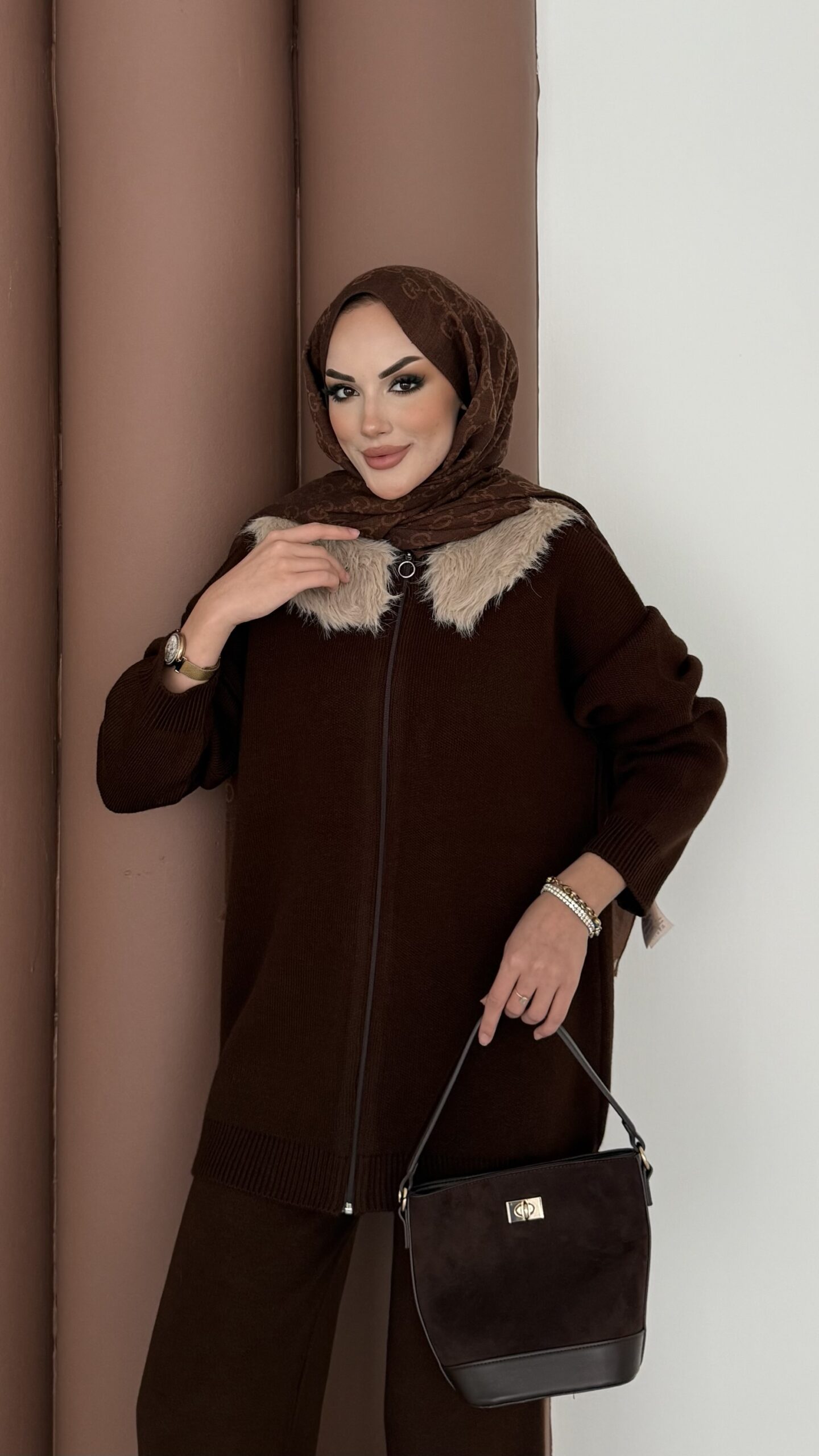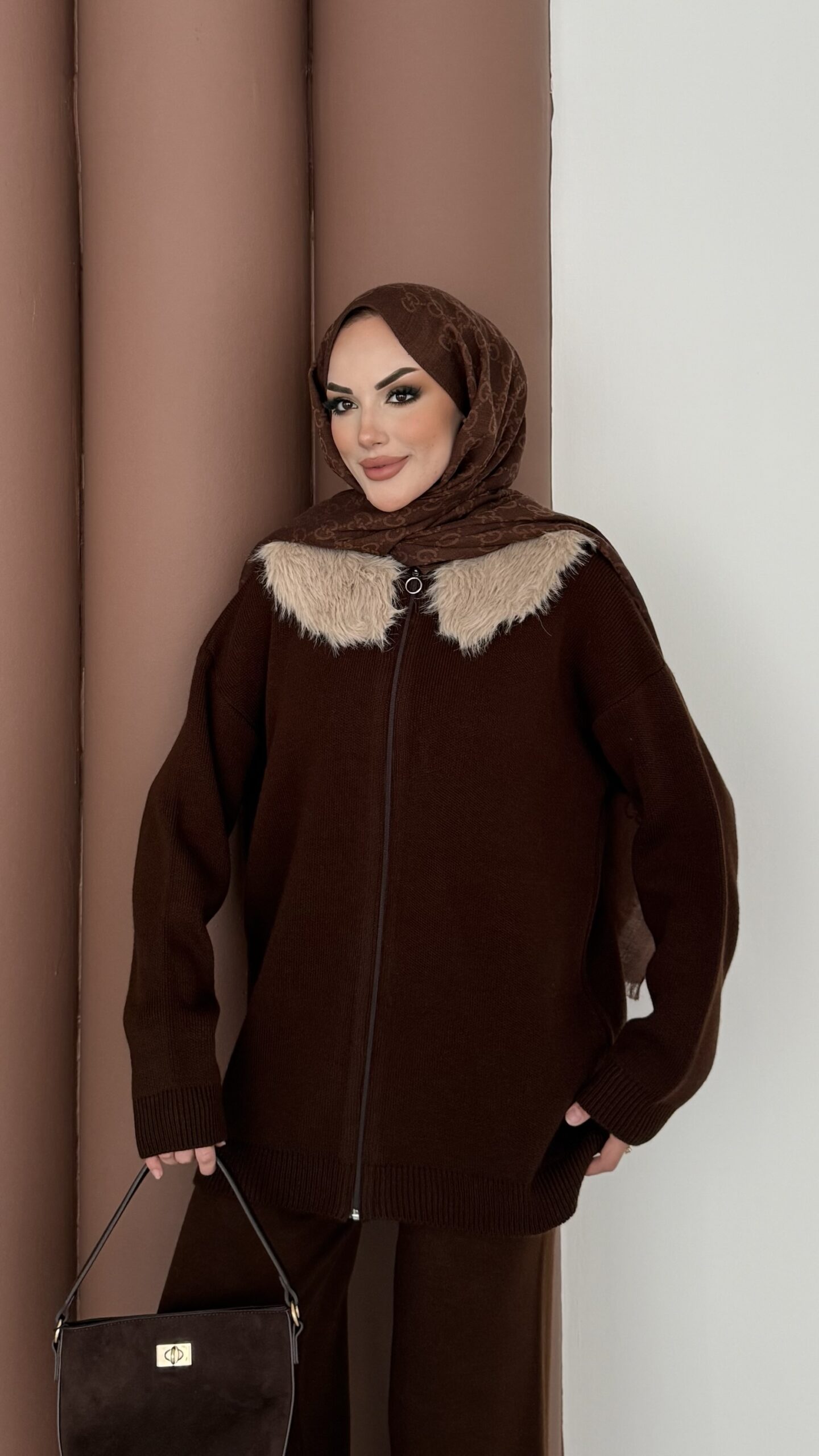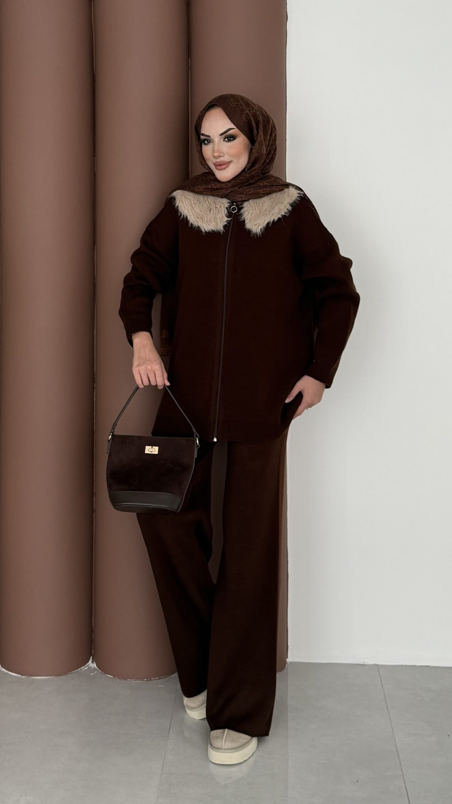 Angora Kürklü Triko İkili Takım – Kahverengi