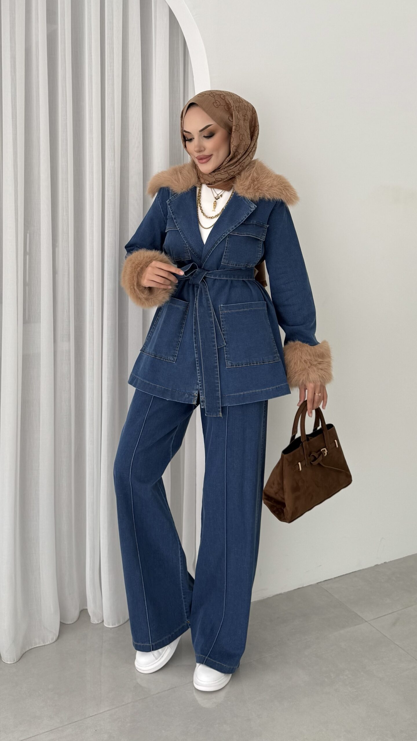 Luxury Kürklü Denim İkili Takım - Koyu Mavi