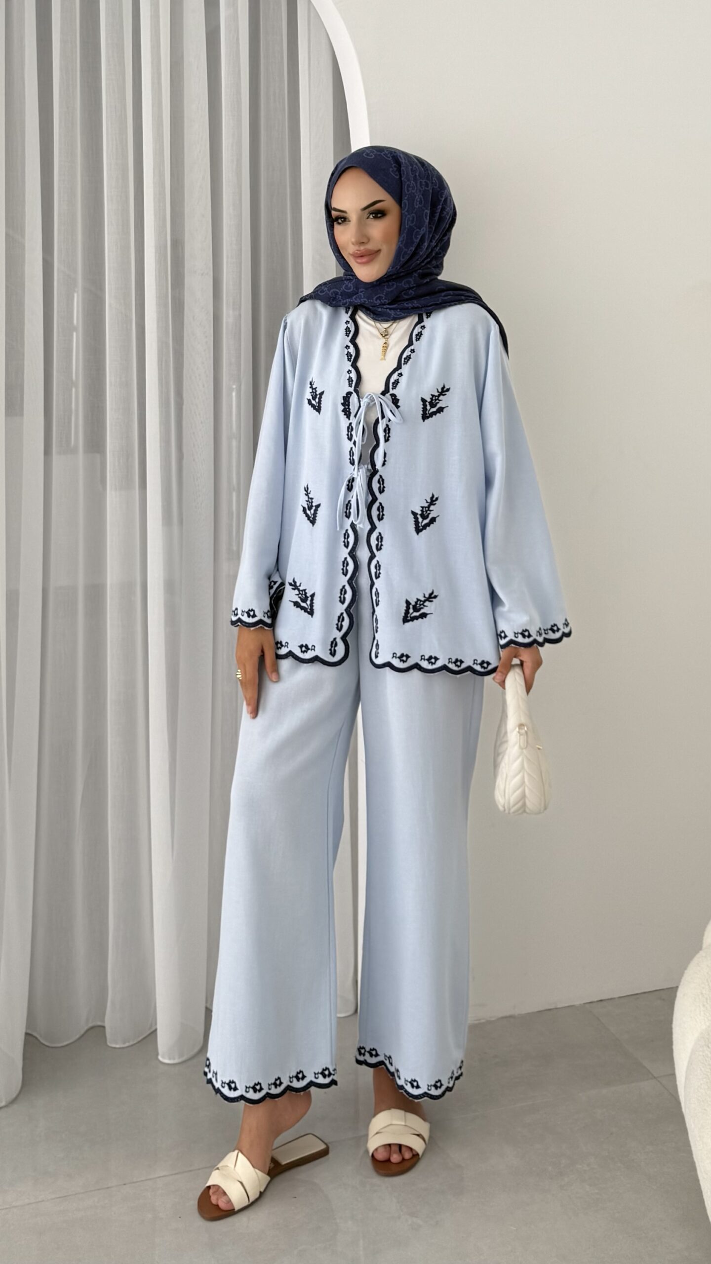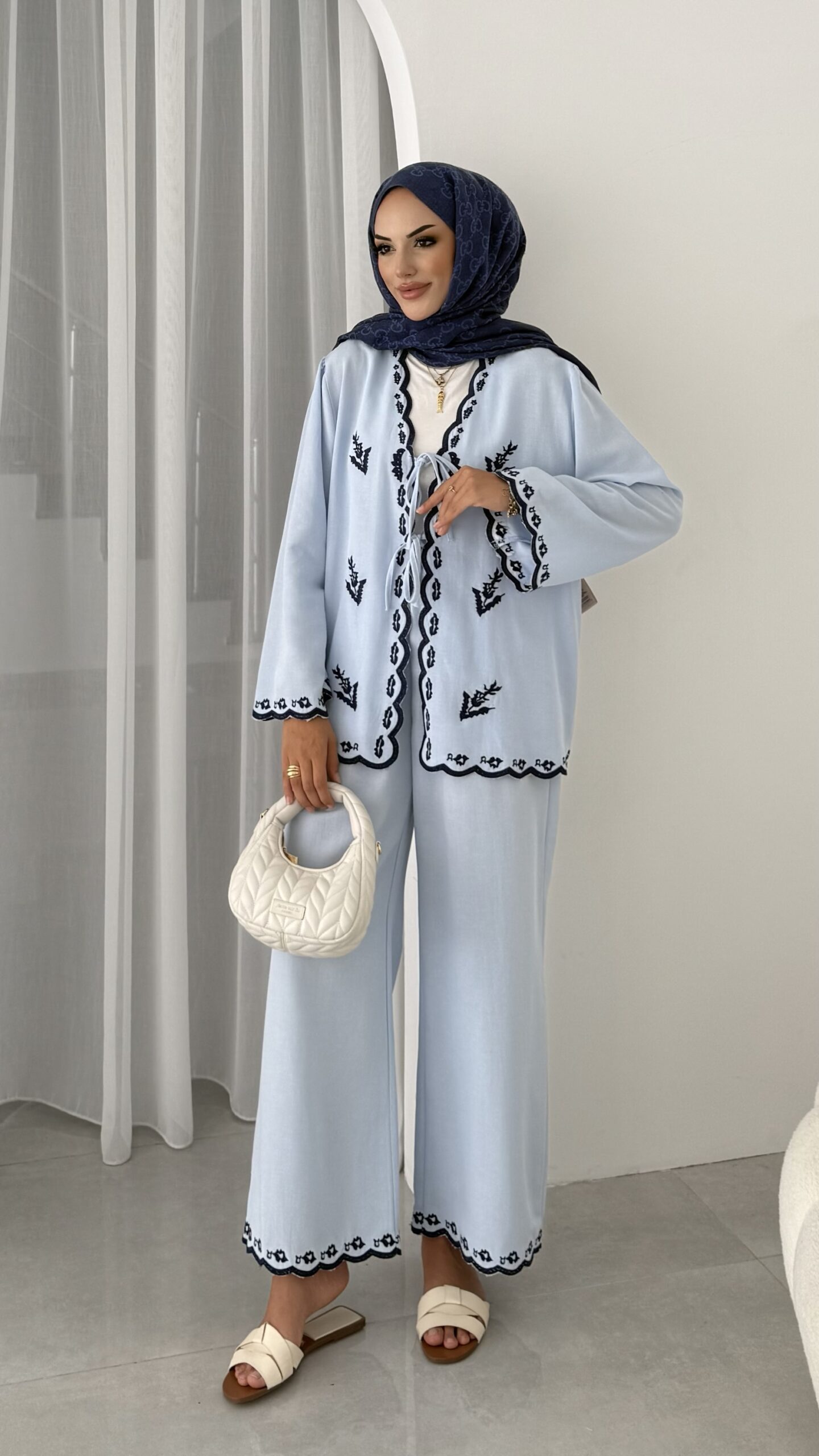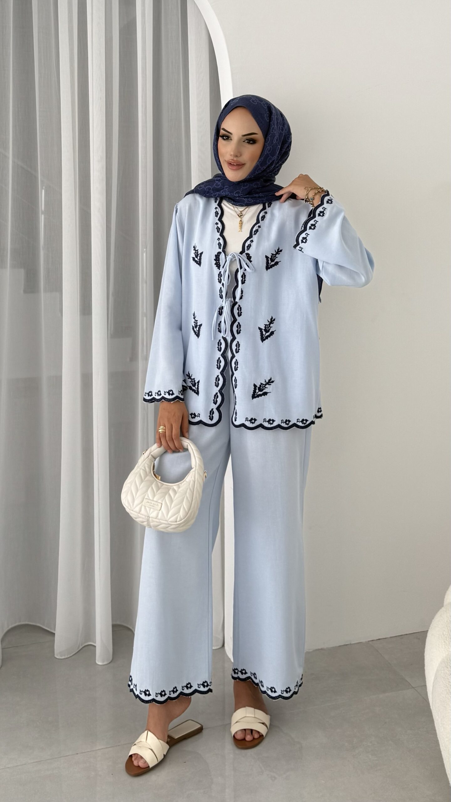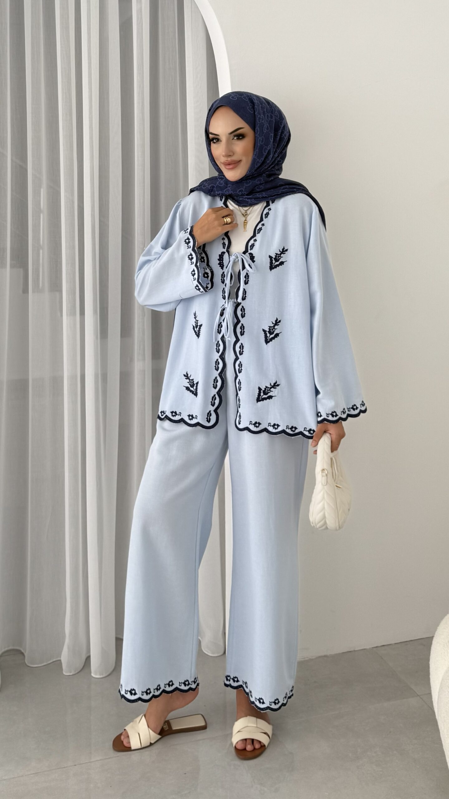 Macarina Nakışlı Keten İkili Takım – Mavi