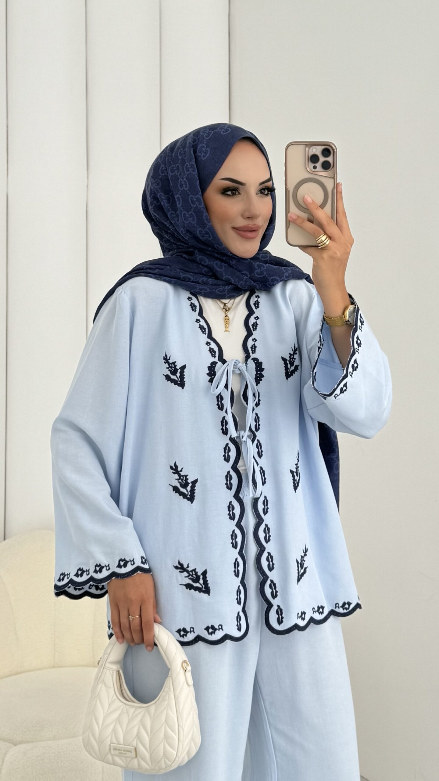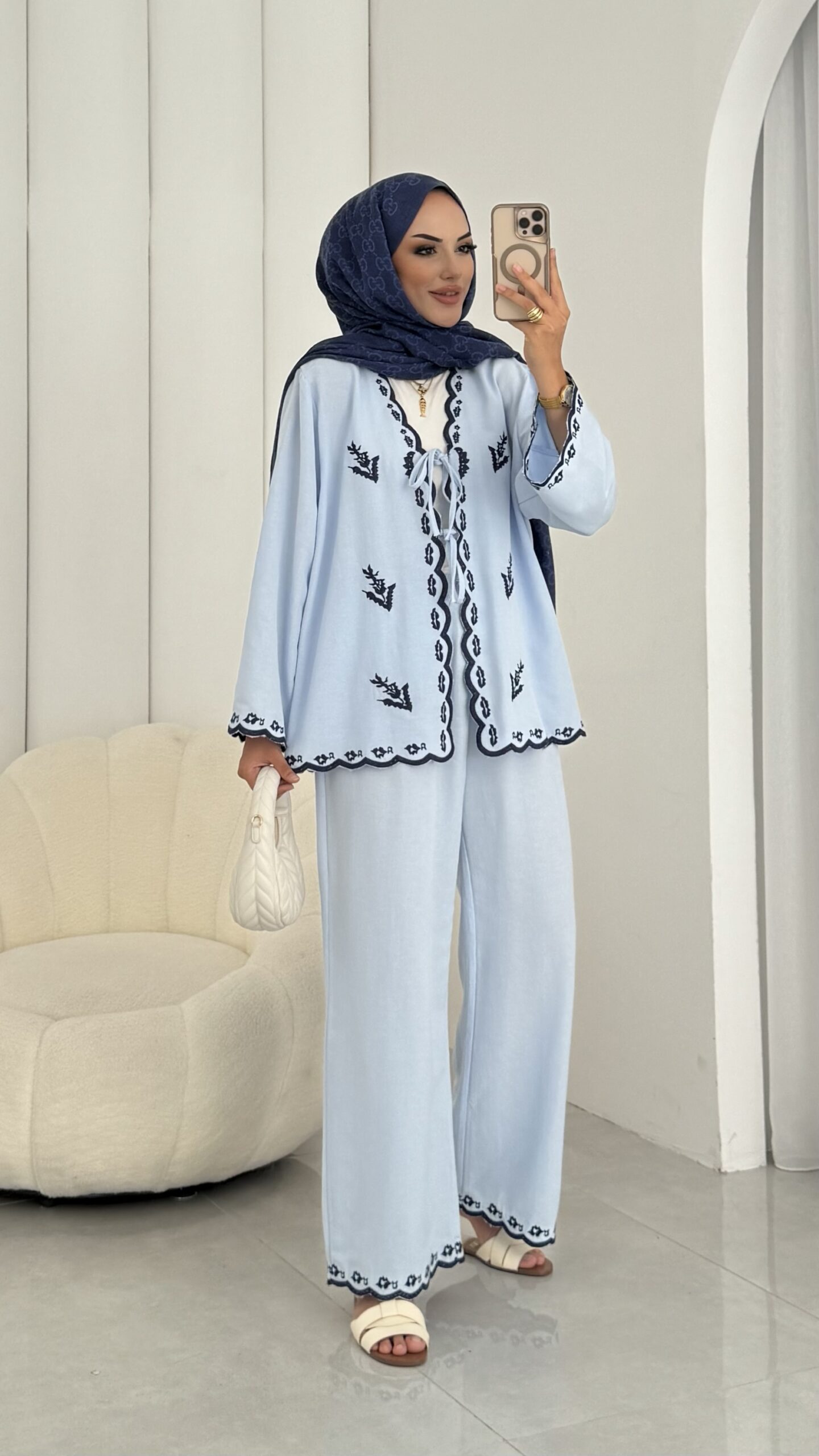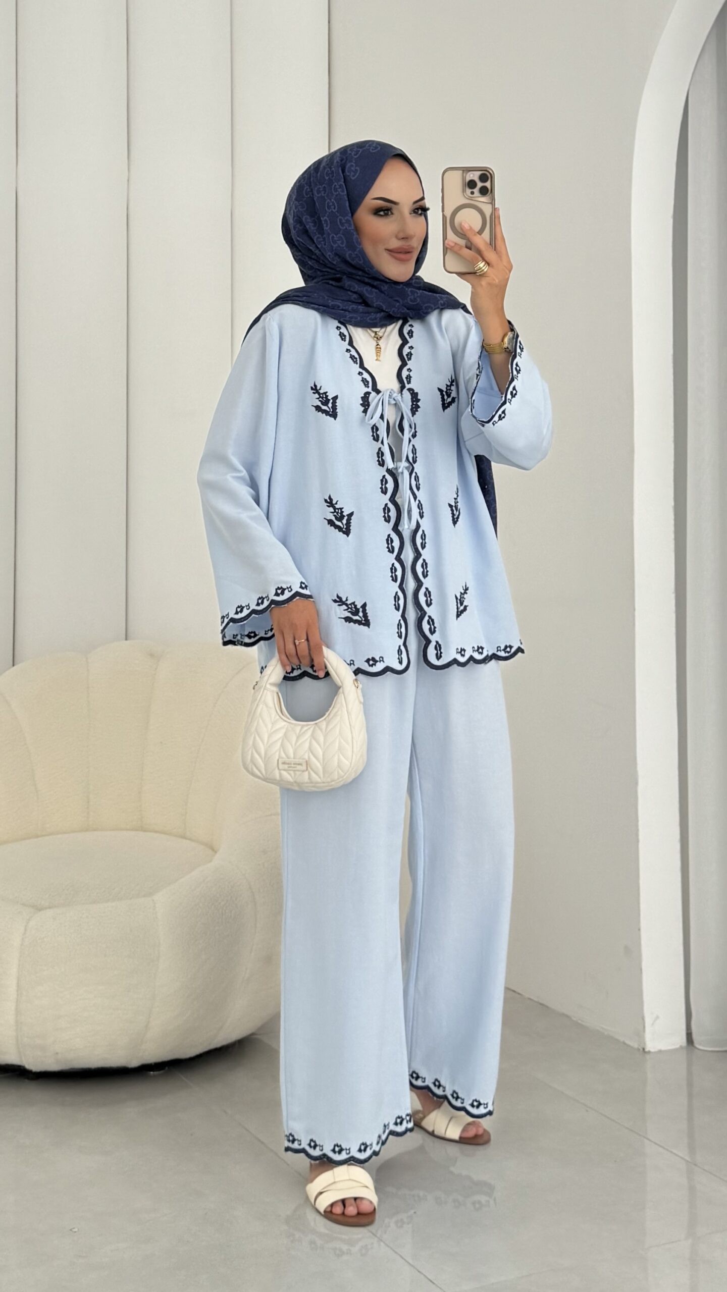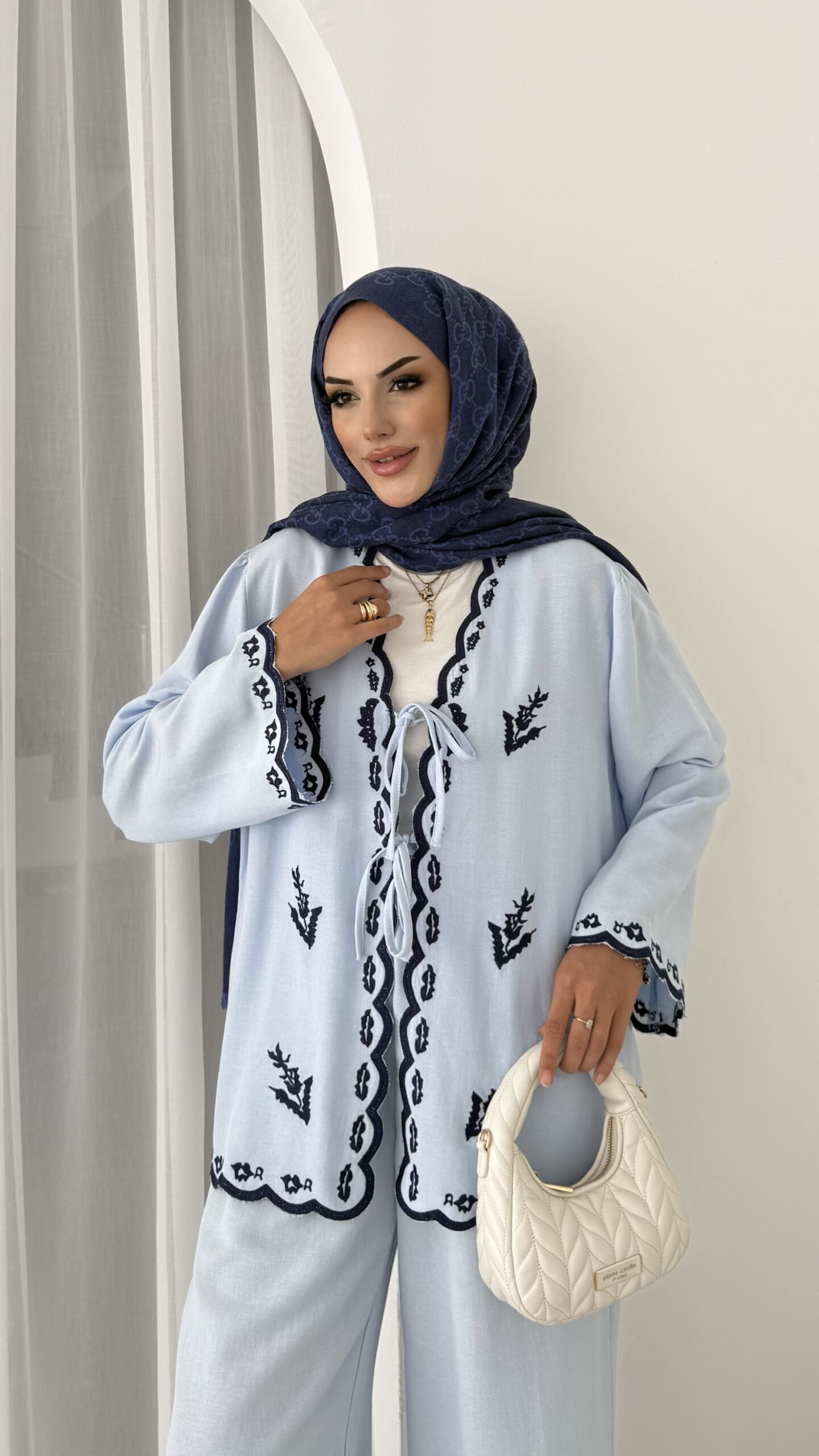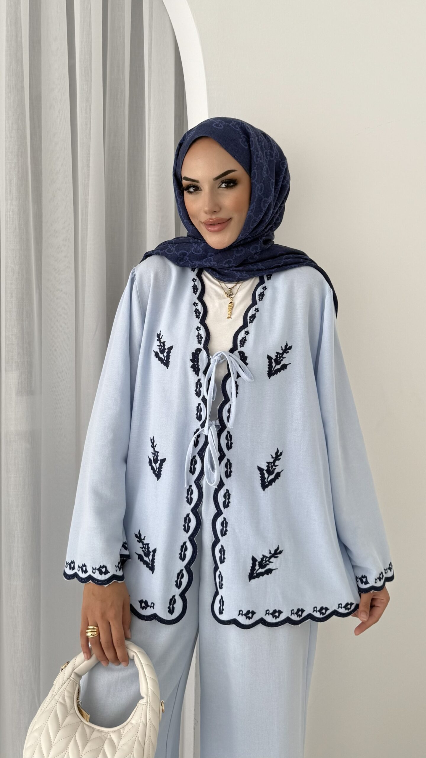 Macarina Nakışlı Keten İkili Takım – Mavi