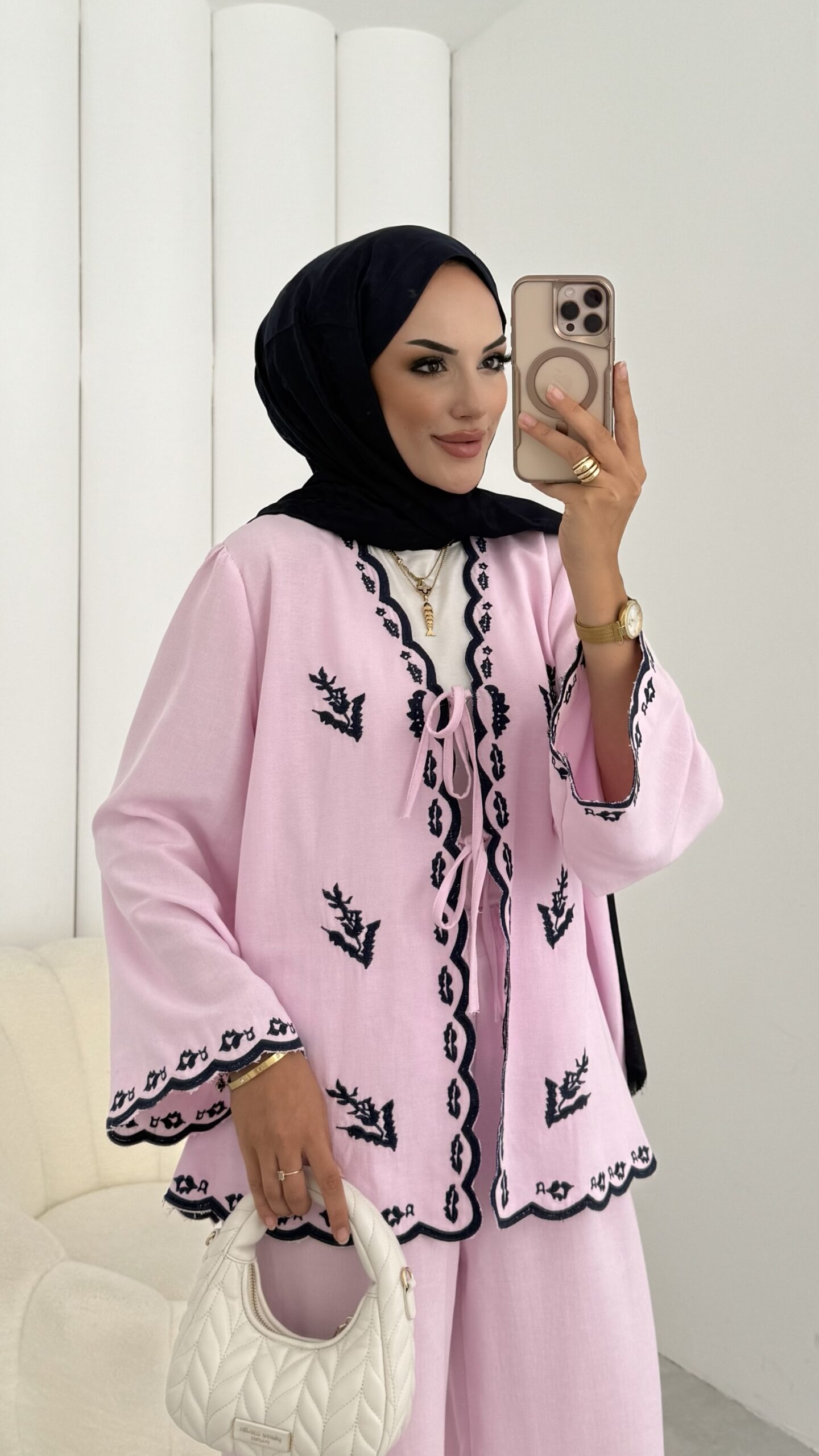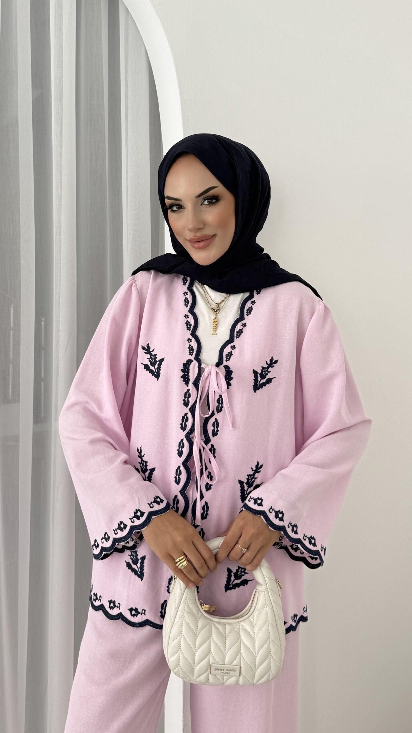 Macarina Nakışlı Keten İkili Takım – Pembe