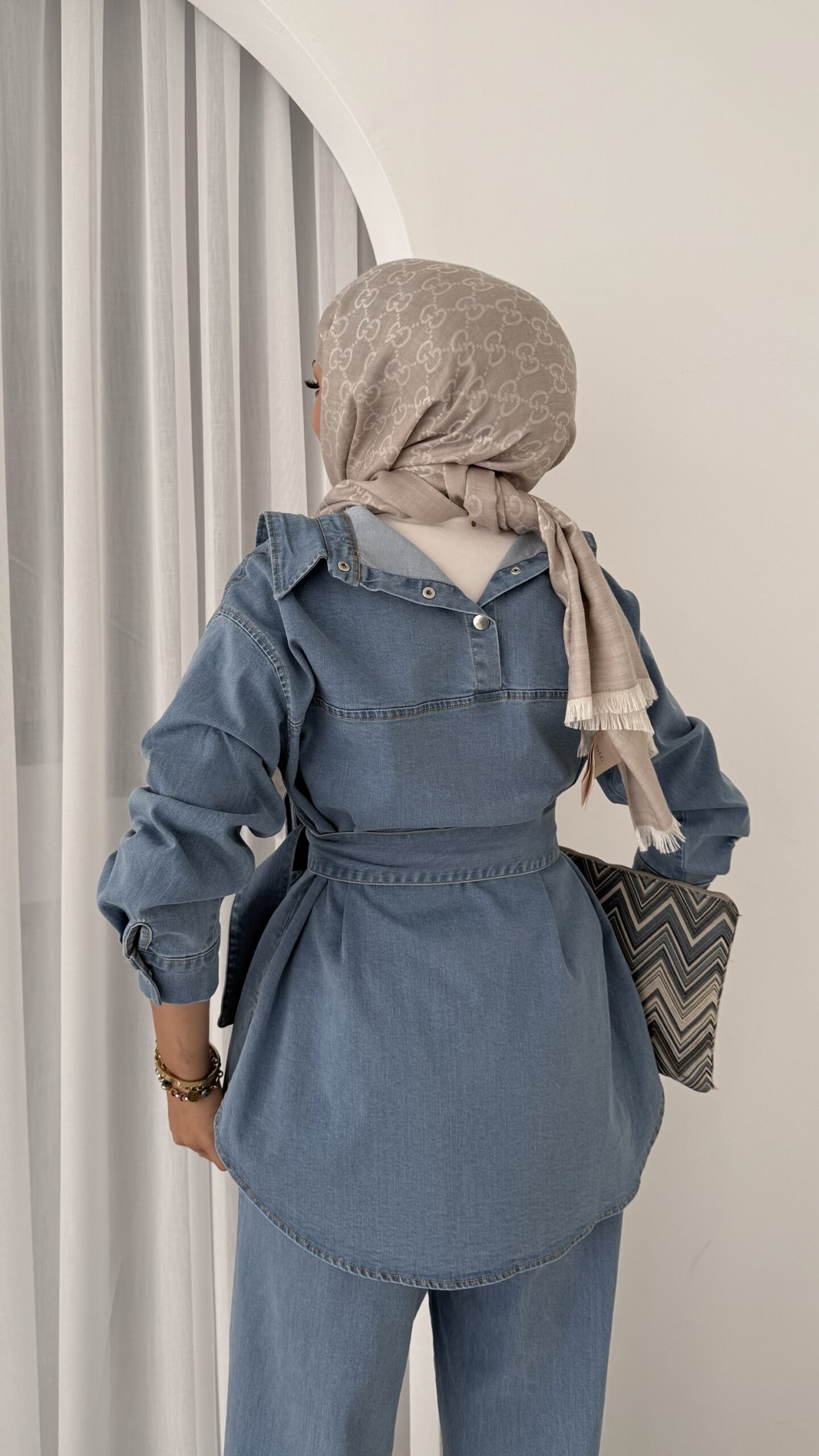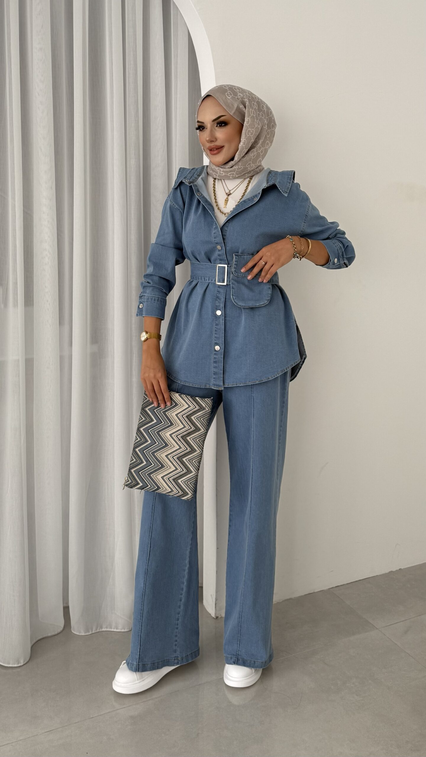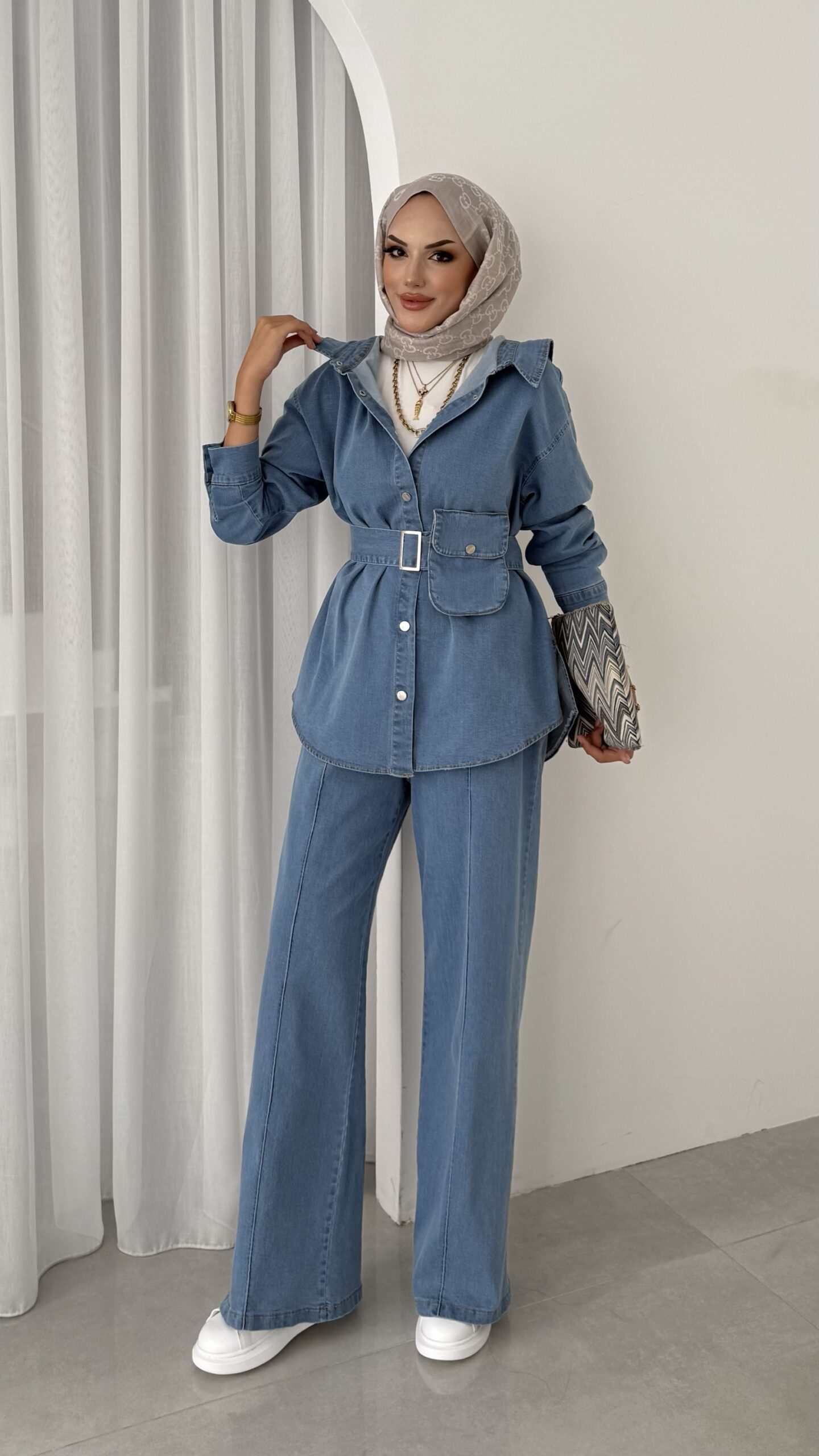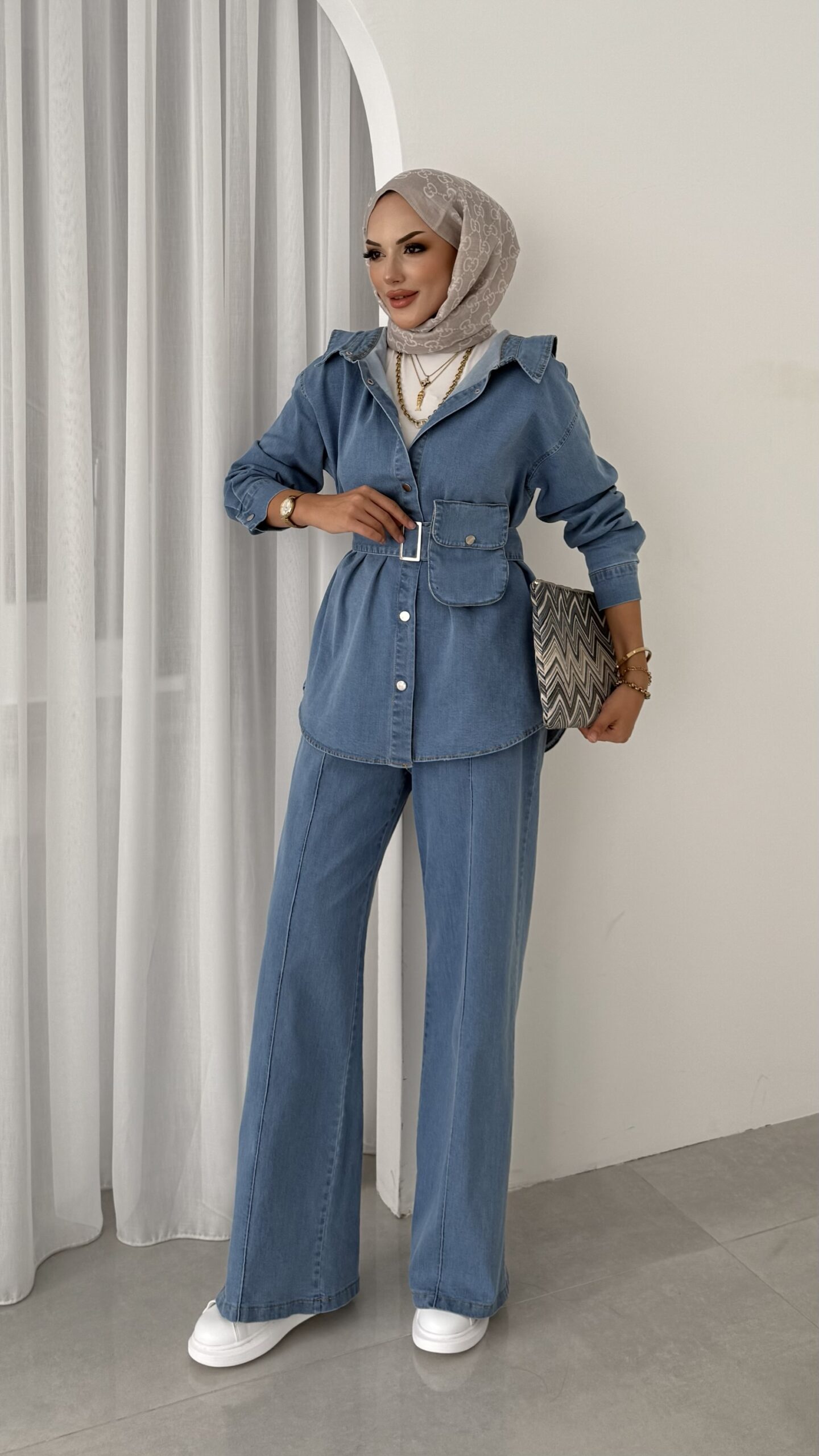 Ekose Desen Denim İkili Takım – Açık Mavi