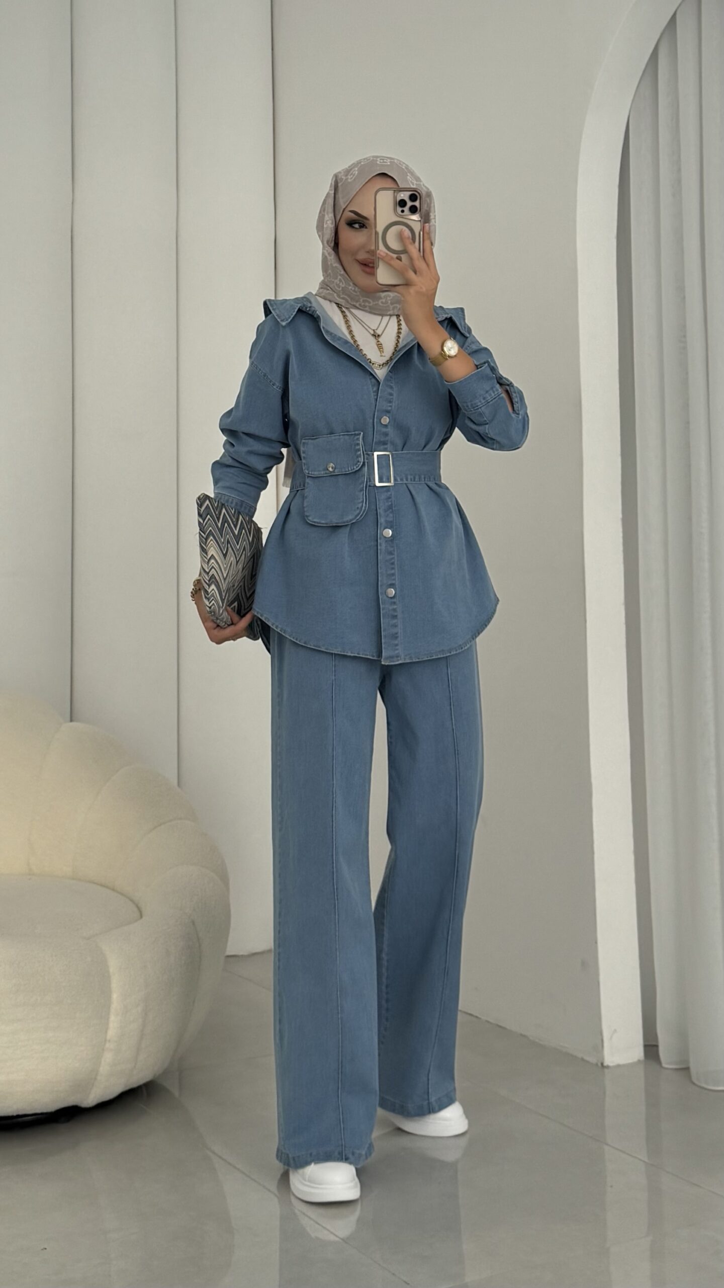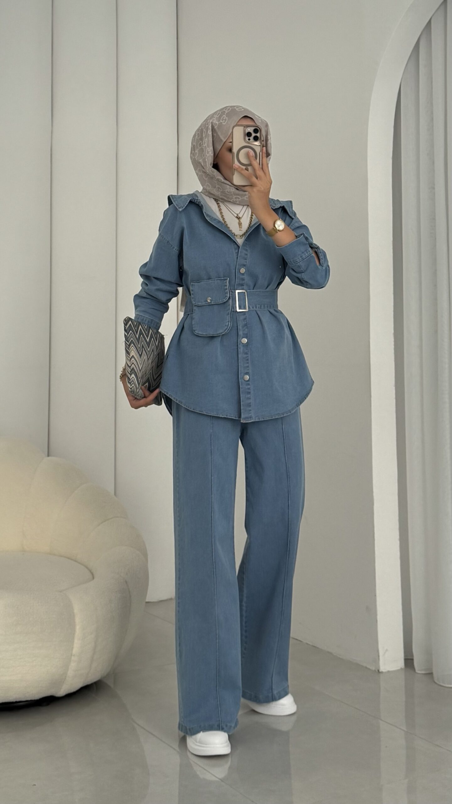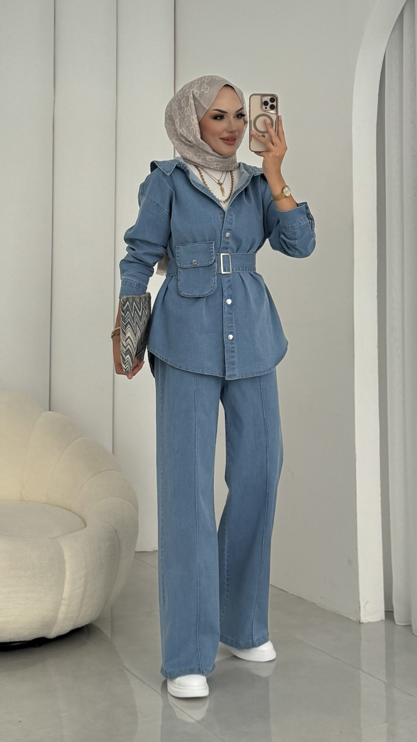 Ekose Desen Denim İkili Takım – Açık Mavi