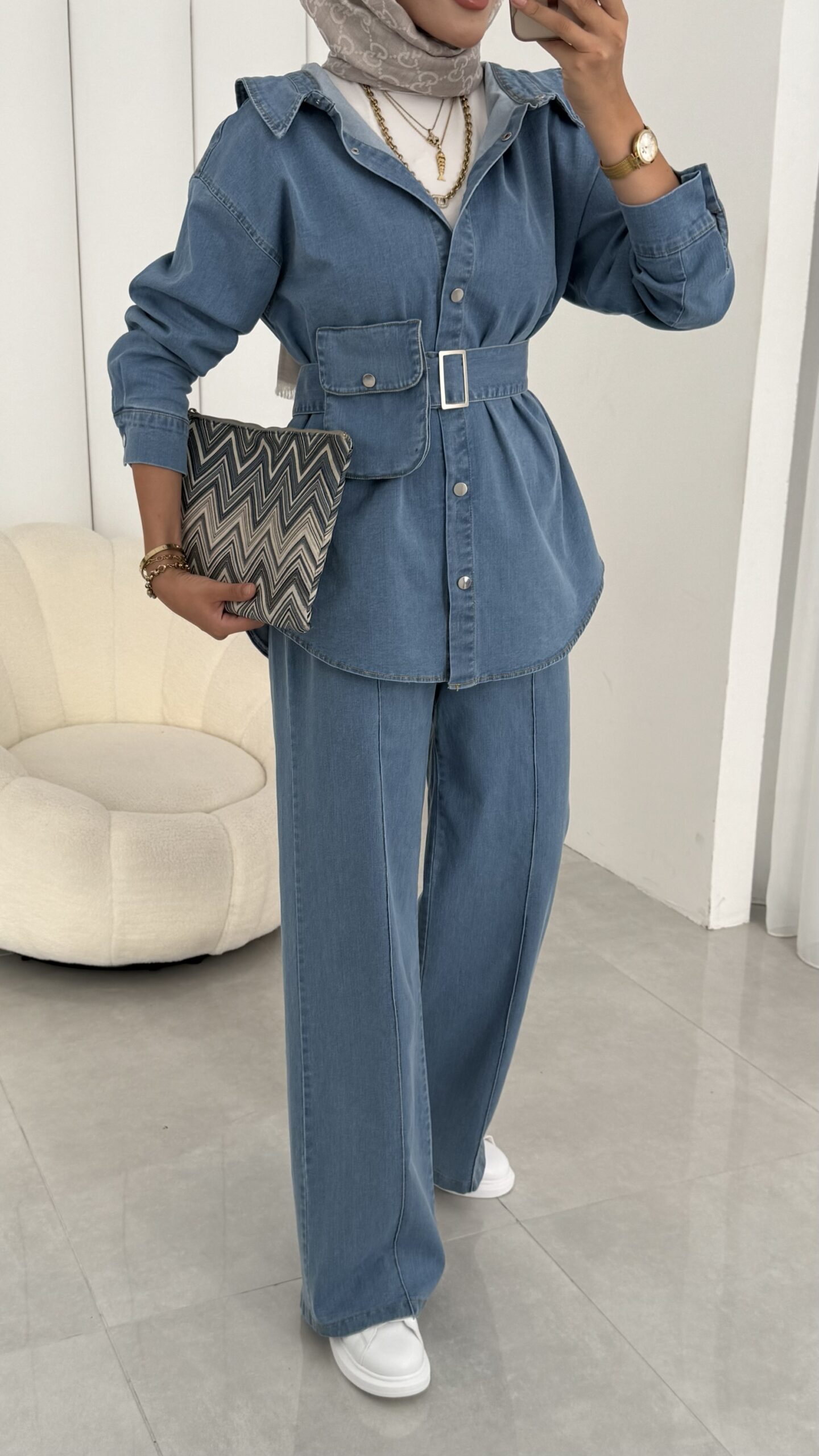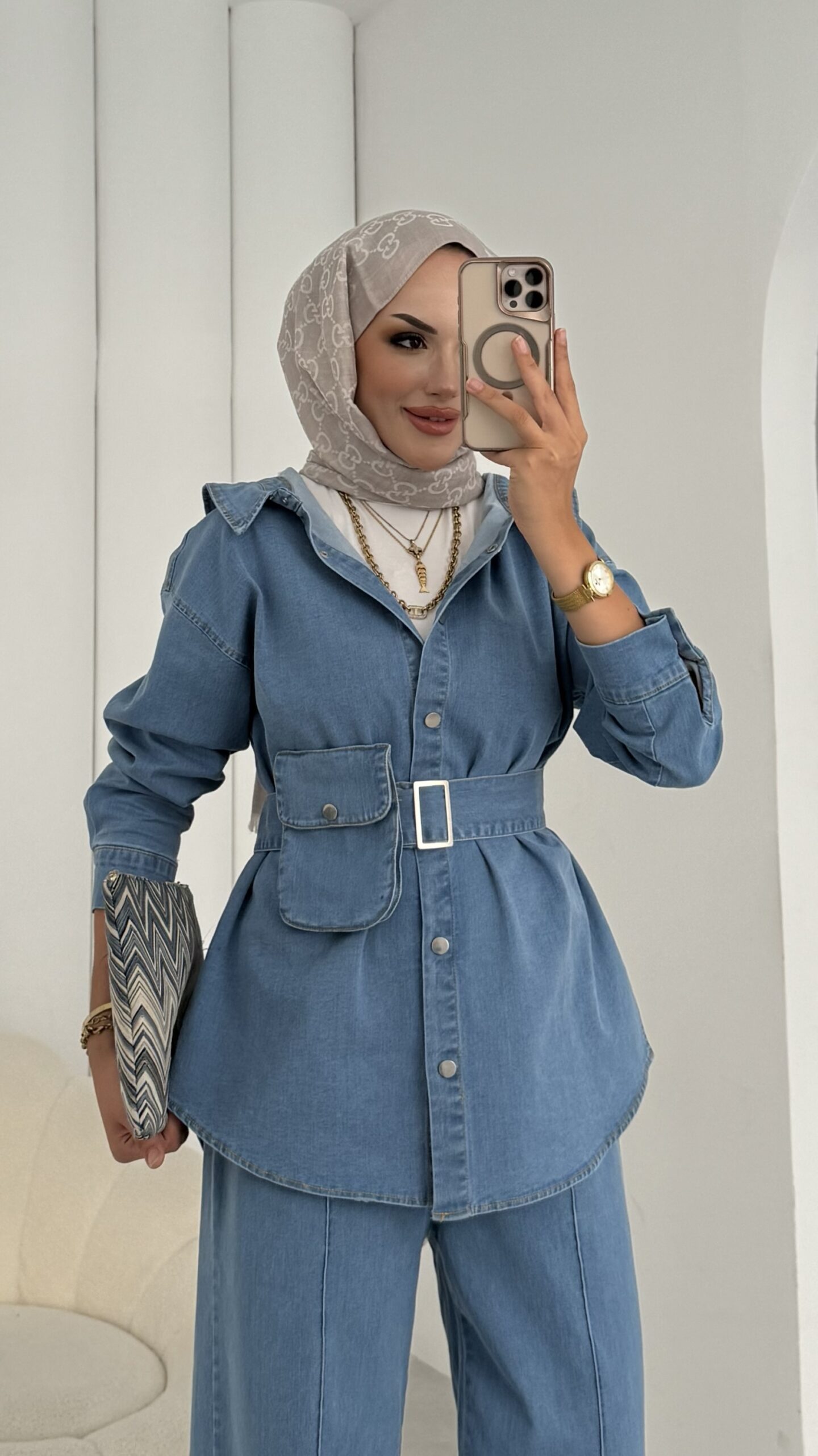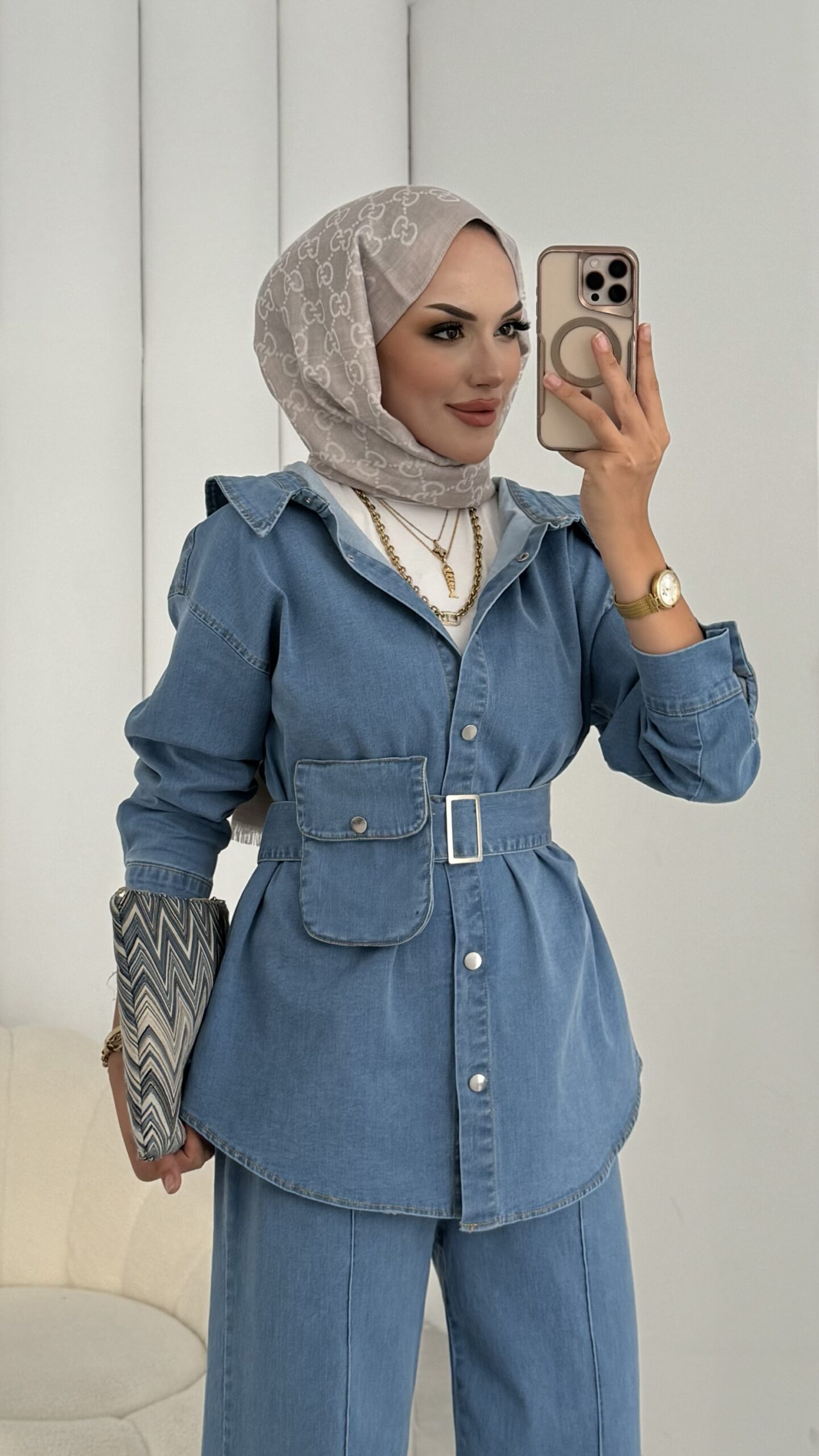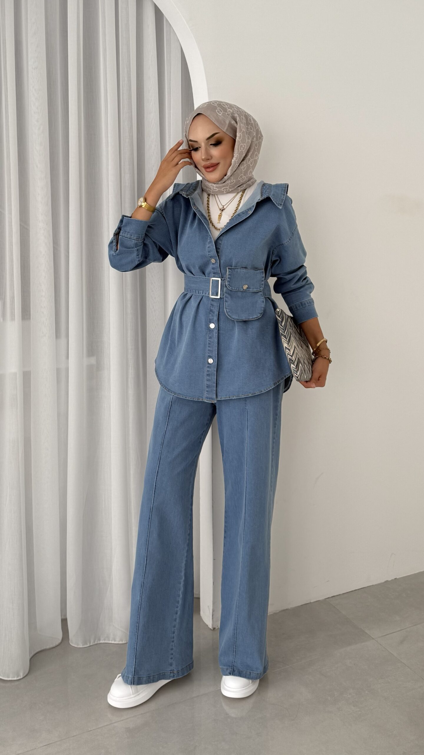 Ekose Desen Denim İkili Takım – Açık Mavi