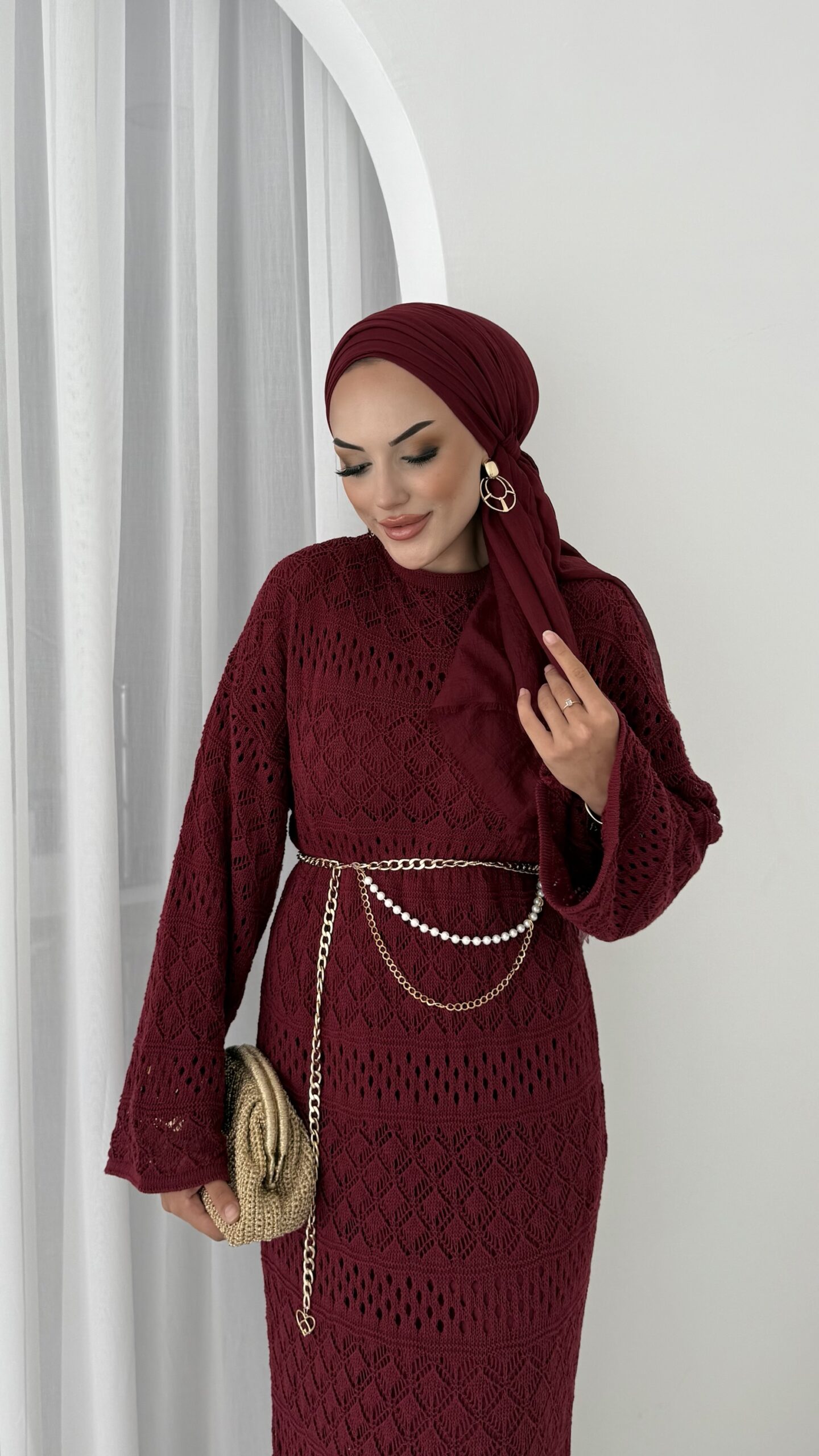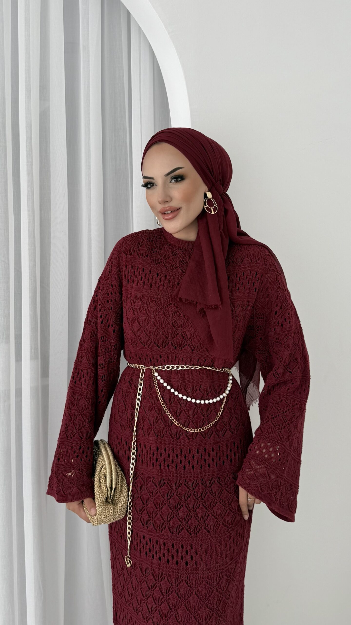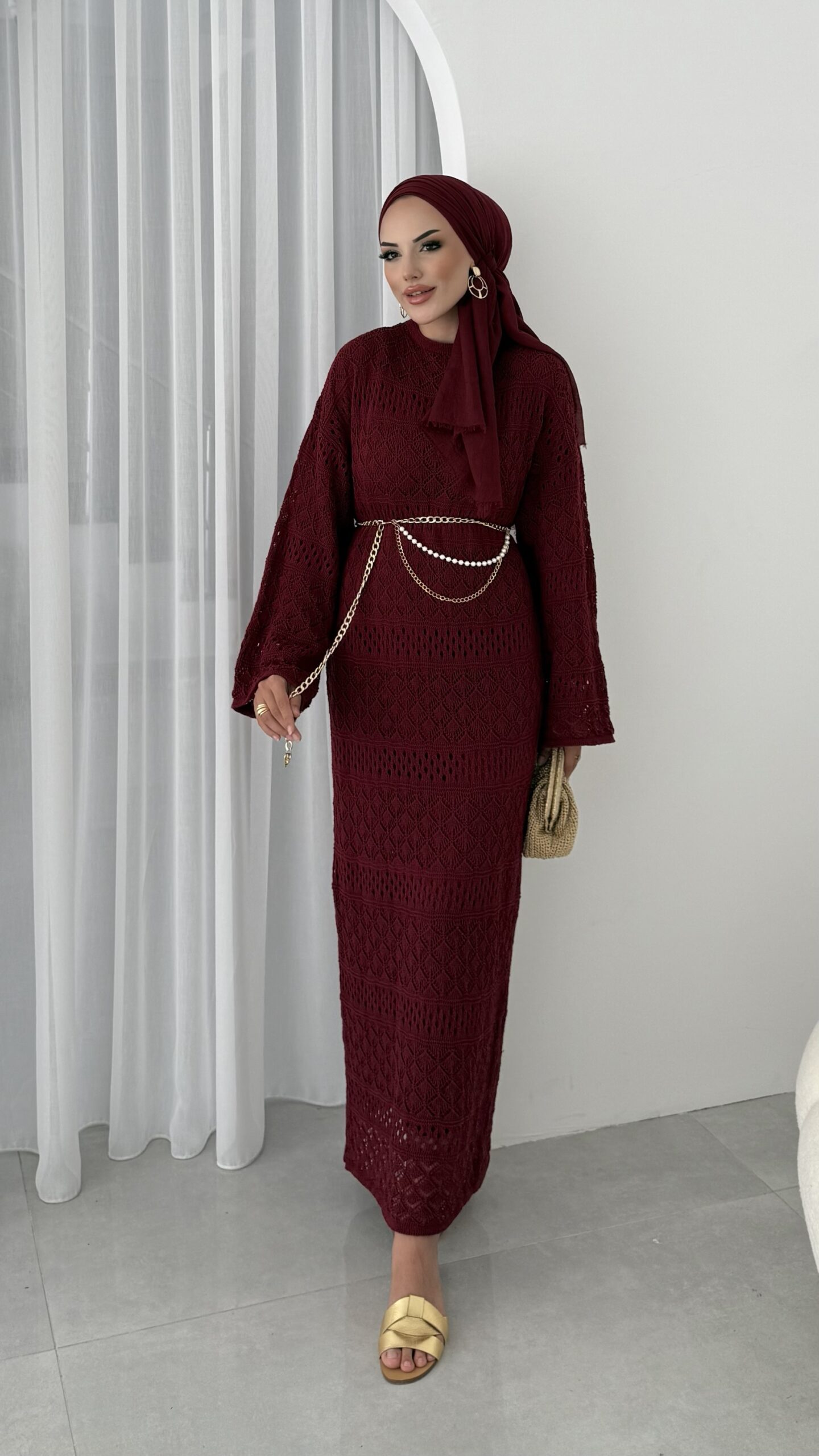 Marka Muadil Kemerli Ajurlu Elbise – Bordo