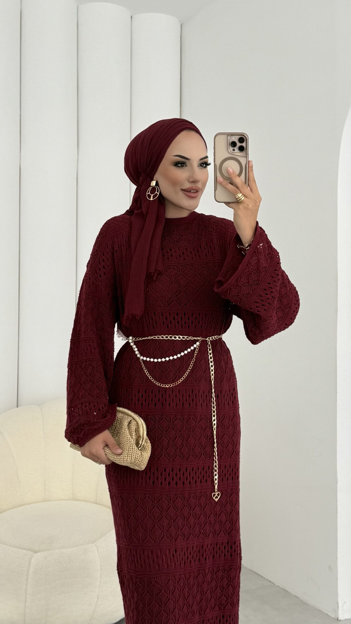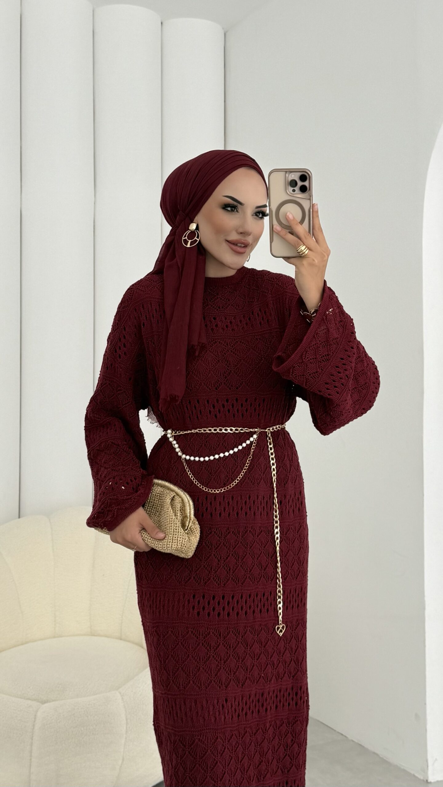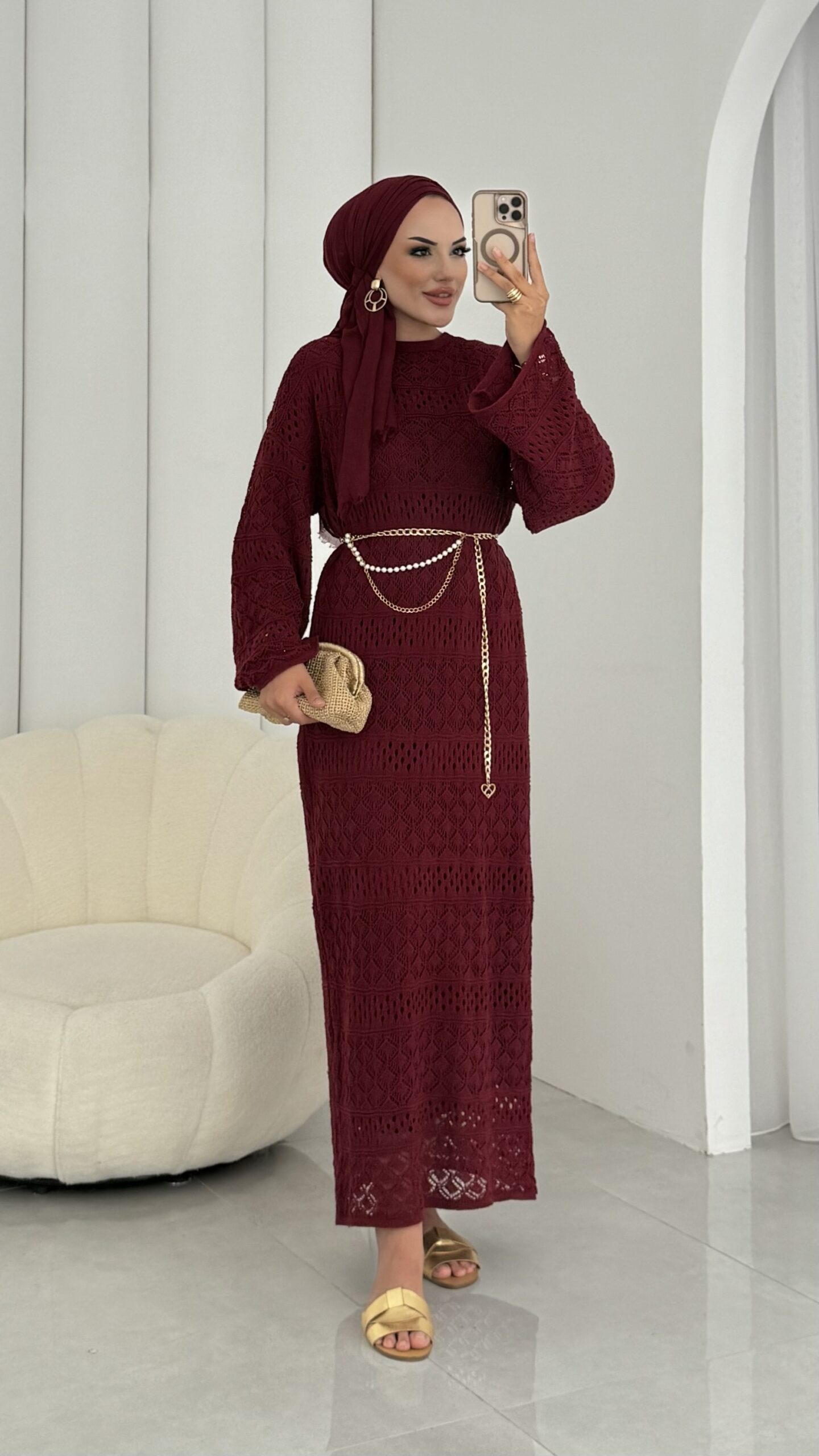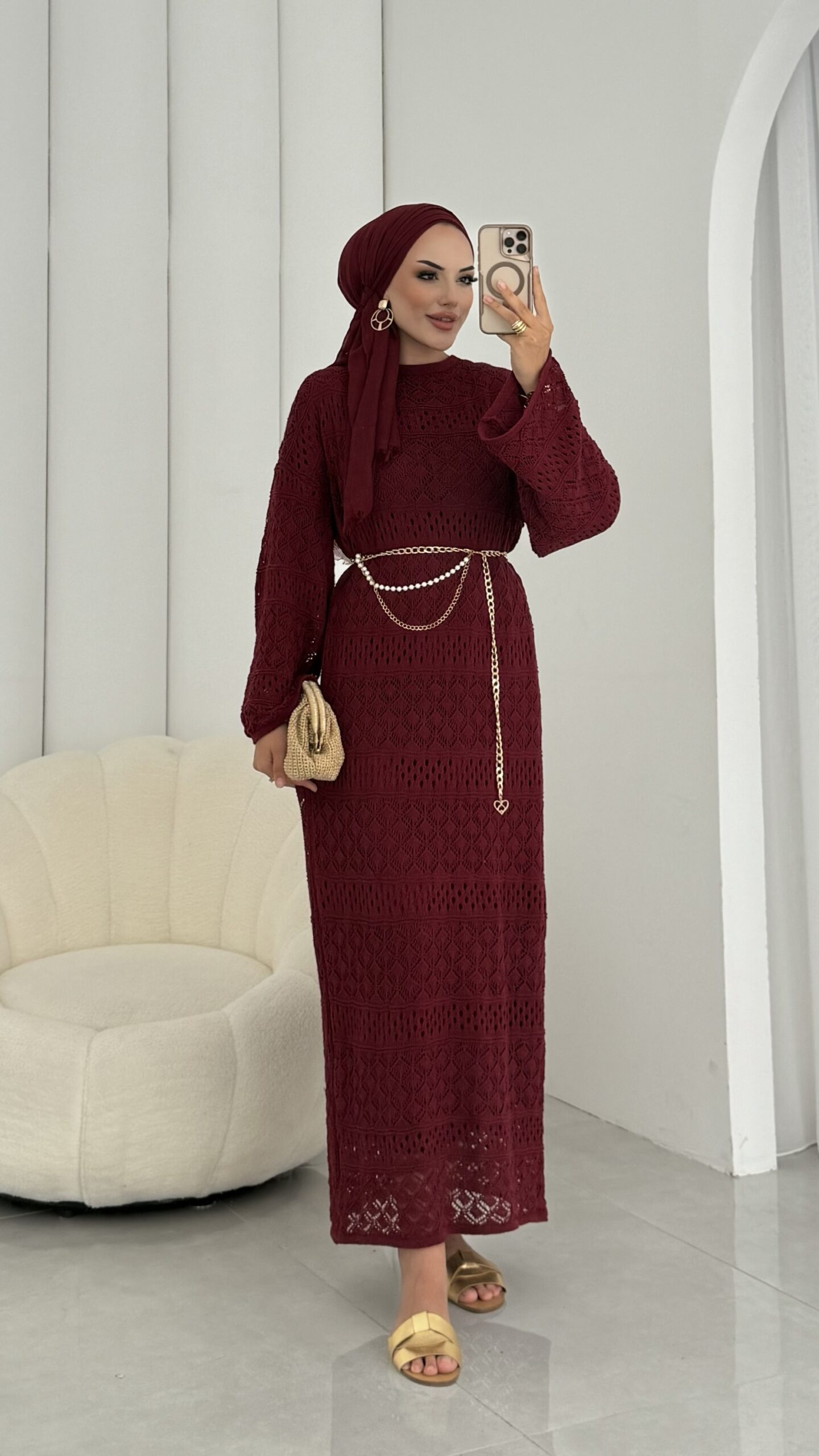 Marka Muadil Kemerli Ajurlu Elbise – Bordo