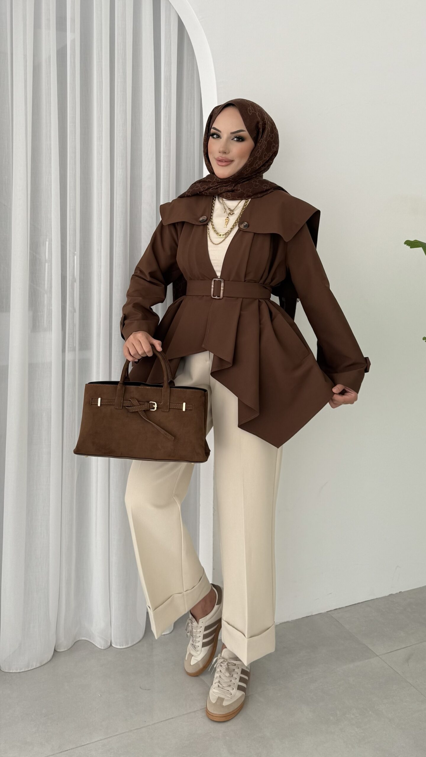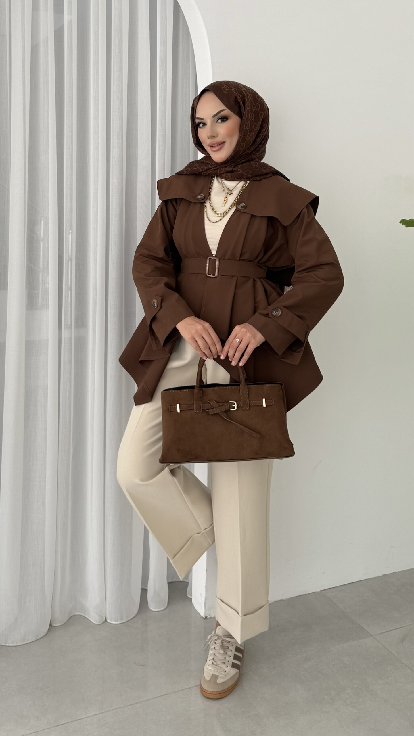 Maxi Tasarım Kemerli Trençkot – Kahverengi