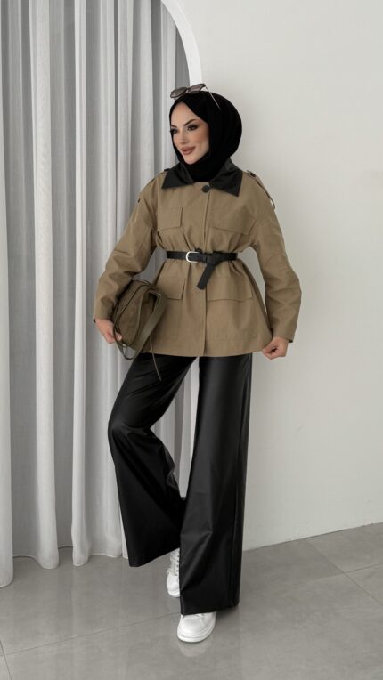 Deri Yakalı Muadil Kemerli Trenç – Haki