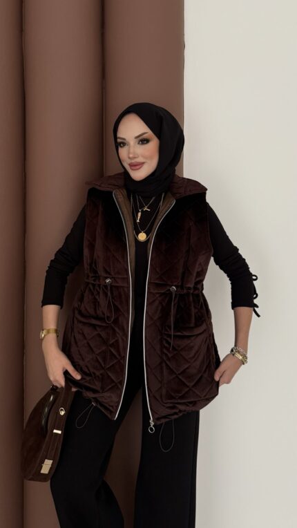 Kapitoneli Kadife Şişme Yelek – Kahverengi