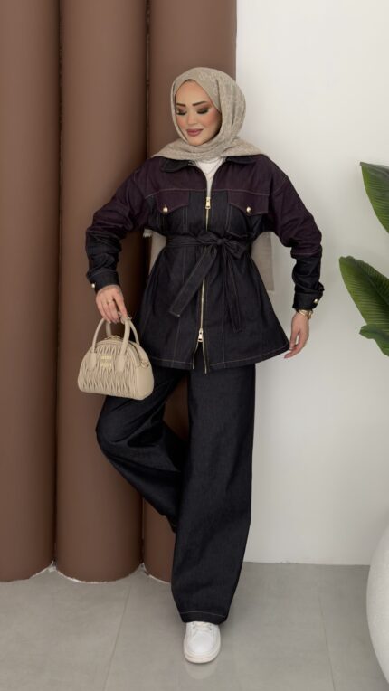 Dark Çift Fermuarlı Denim İkili Takım – Mürdüm