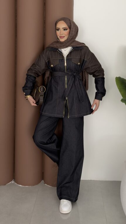 Dark Çift Fermuarlı Denim İkili Takım – Kahverengi