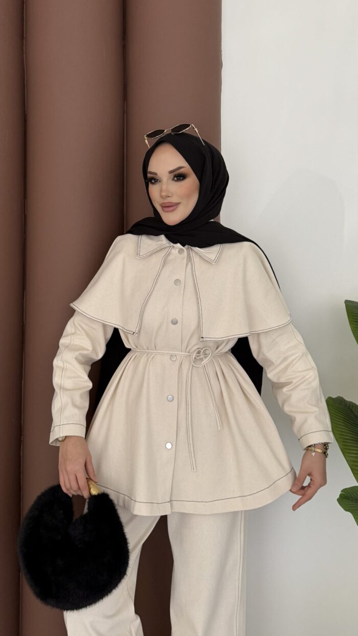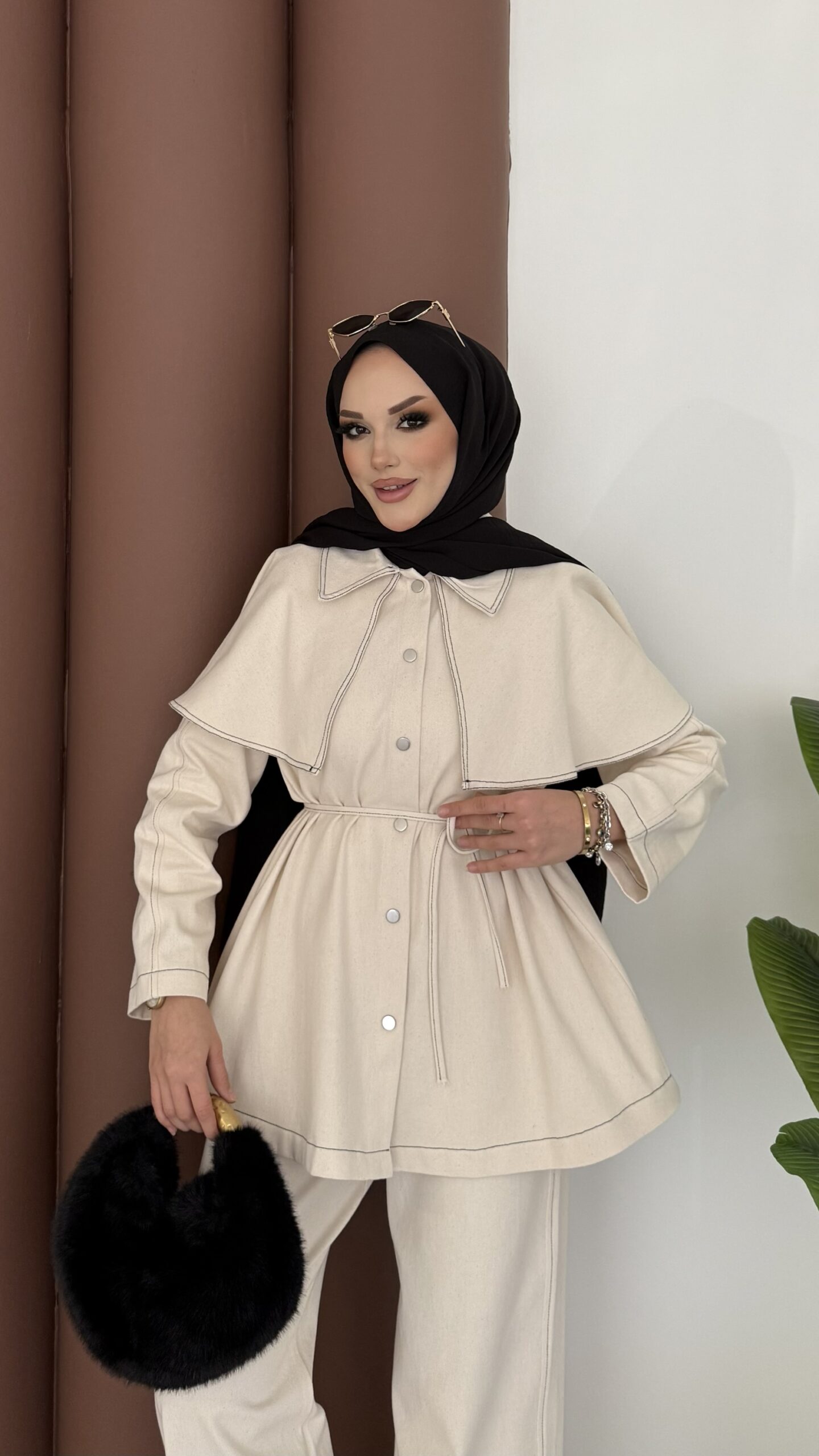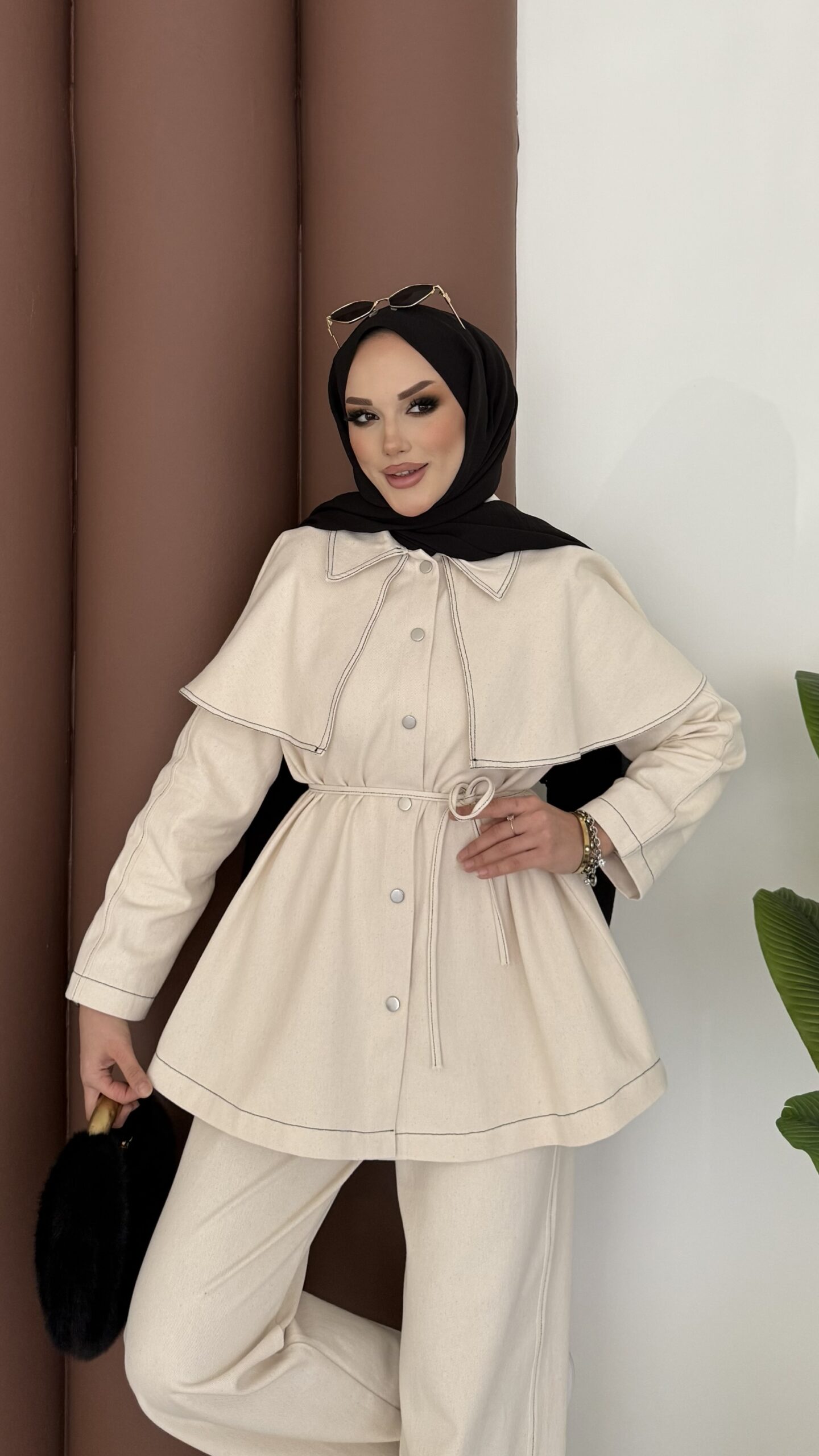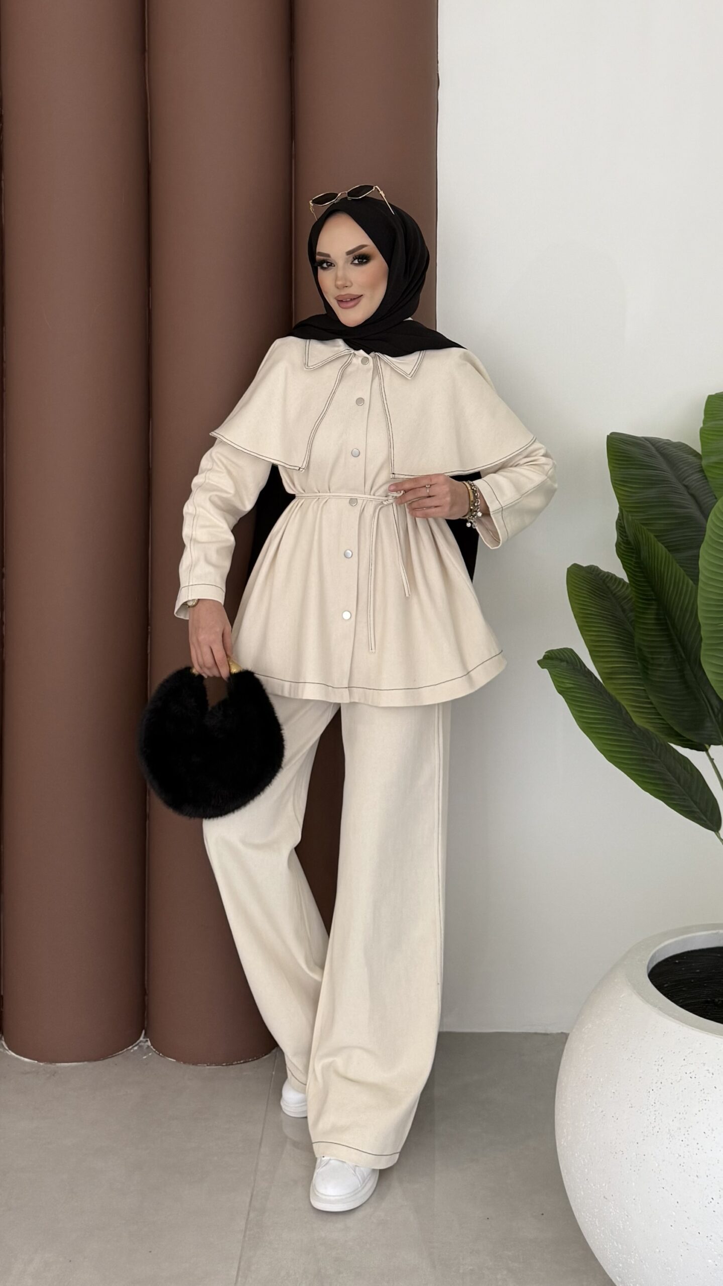 Pelerin Detaylı Gabardin İkili Takım – Bej