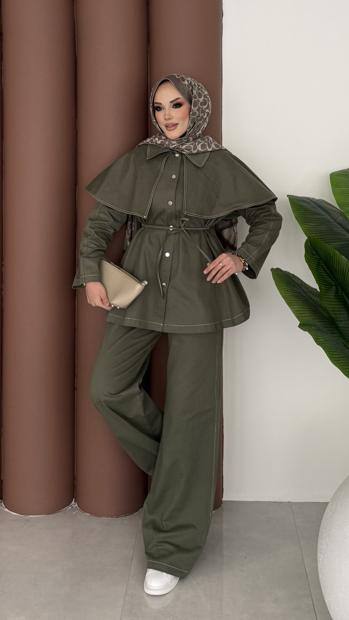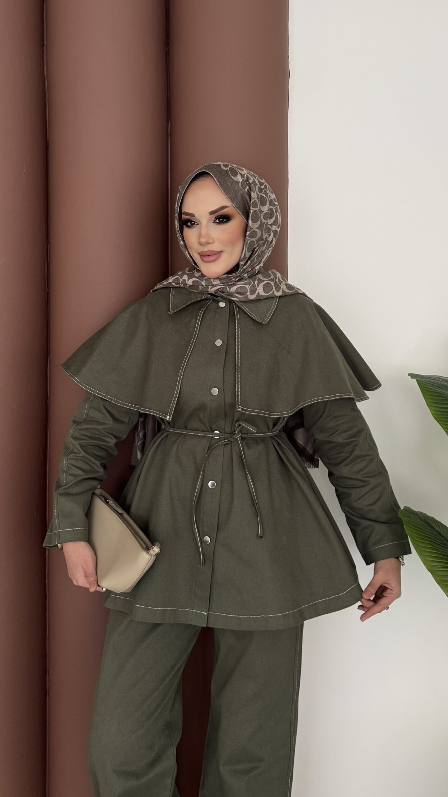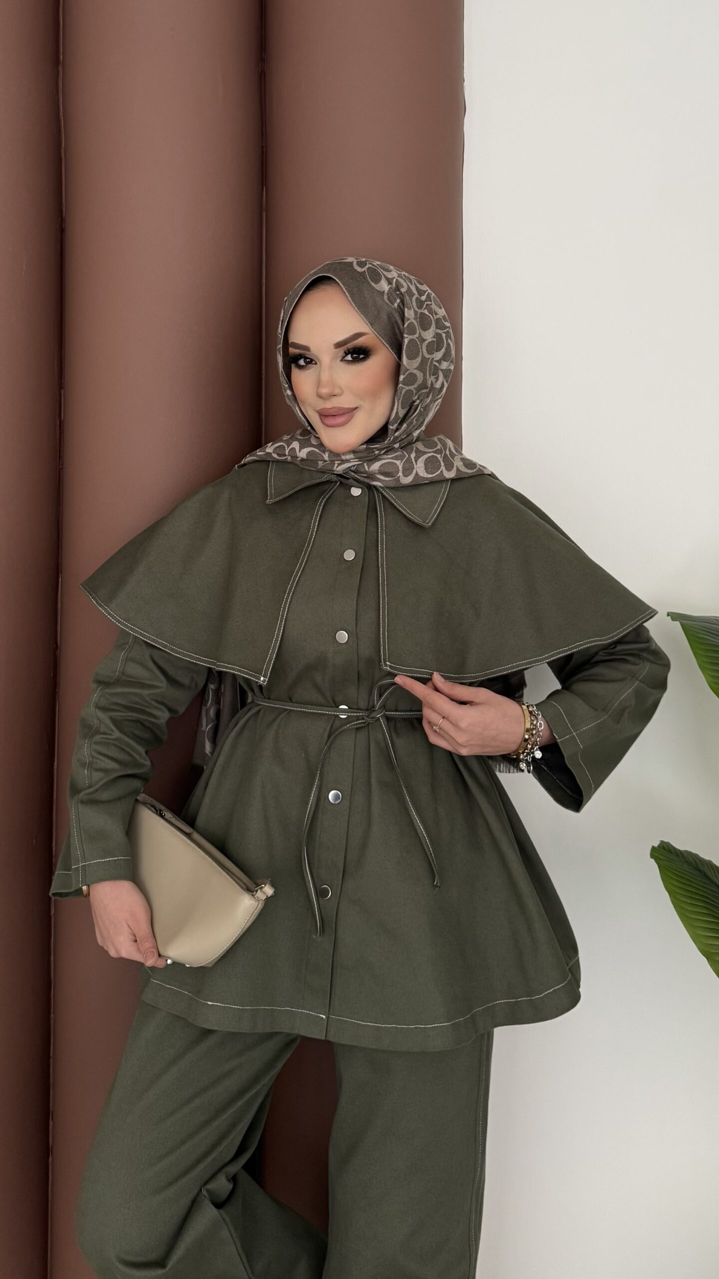Pelerin Detaylı Gabardin İkili Takım – Haki