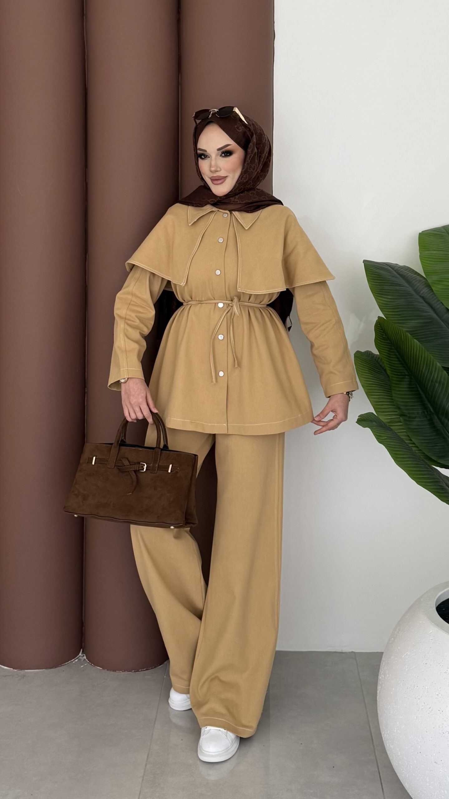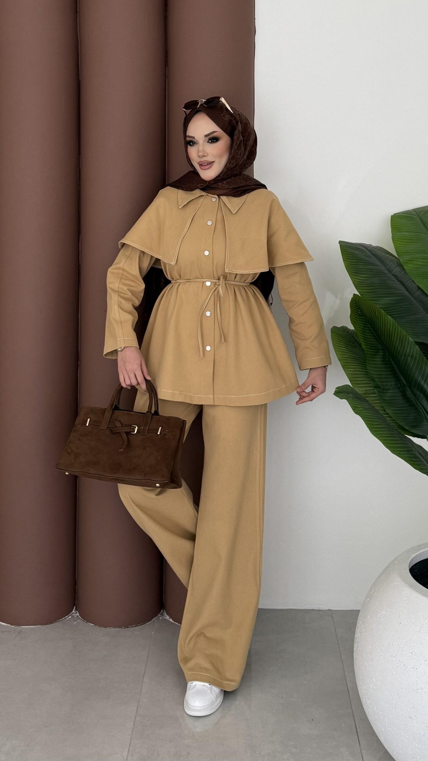 Pelerin Detaylı Gabardin İkili Takım – Hardal