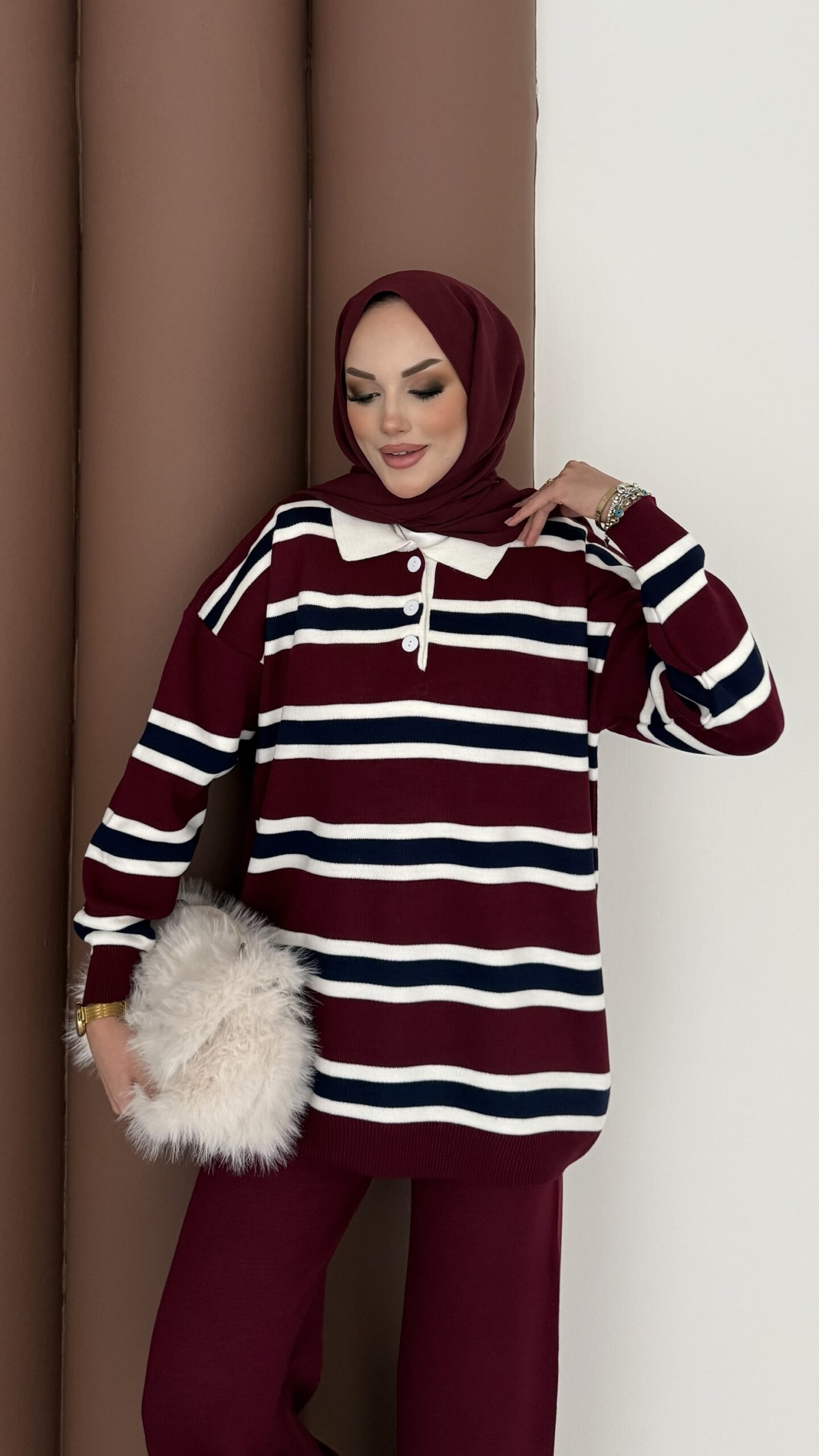 Pinterest Polo Yaka Çizgili Triko Takım – Bordo