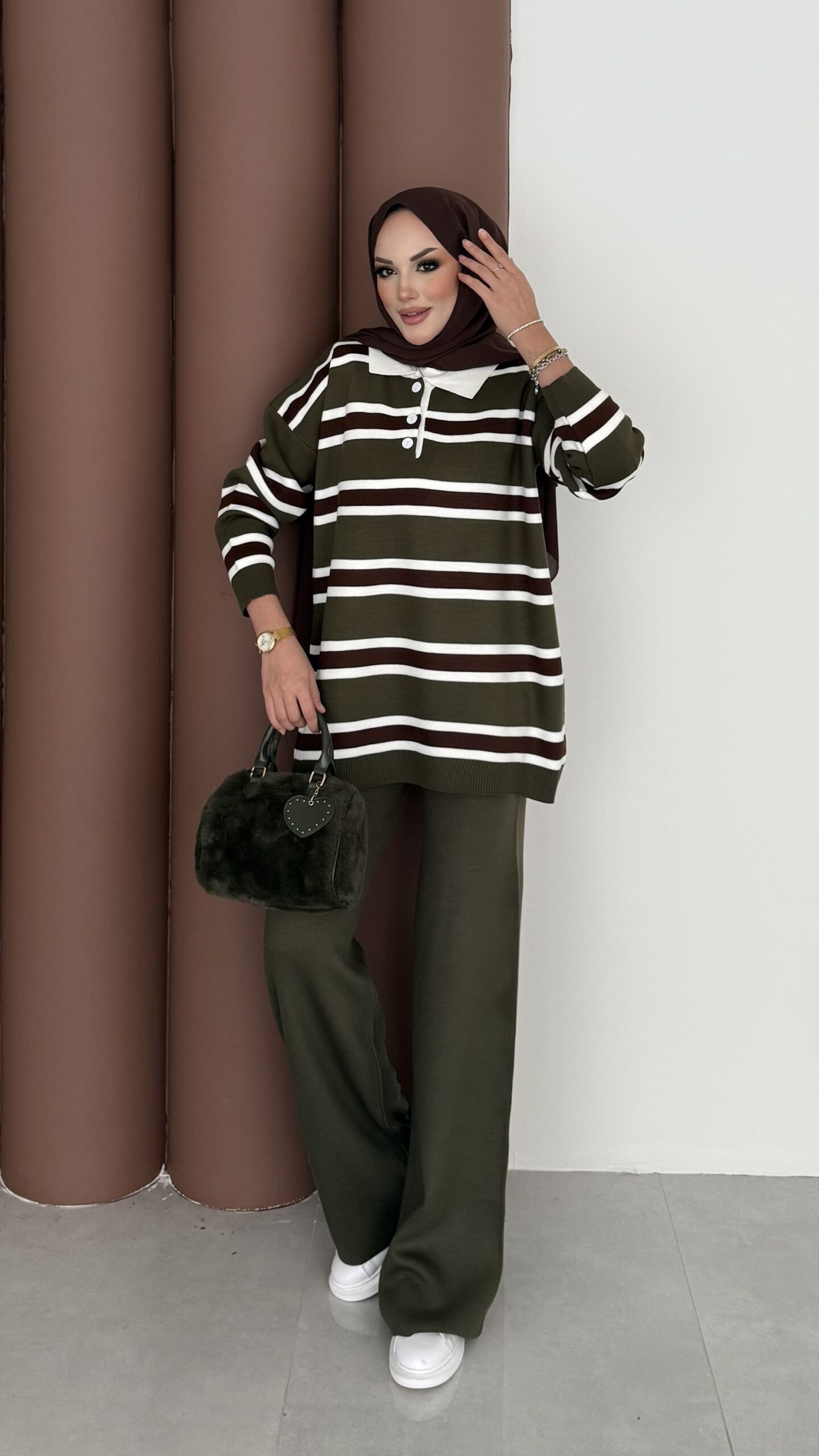 Pinterest Polo Yaka Çizgili Triko Takım – Haki
