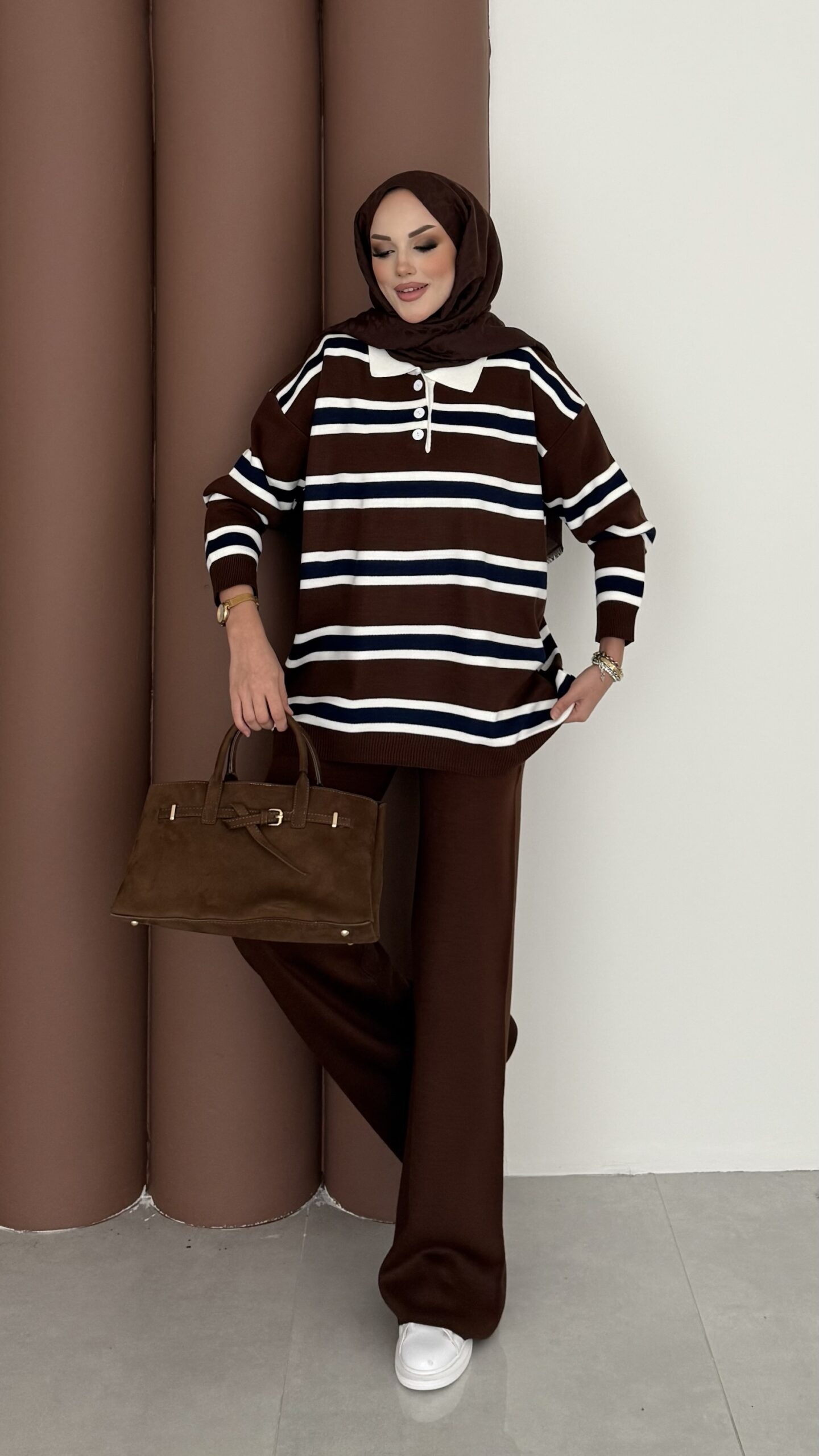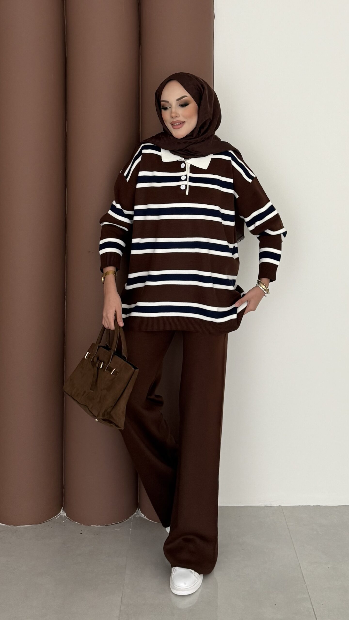 Pinterest Polo Yaka Çizgili Triko Takım – Kahverengi