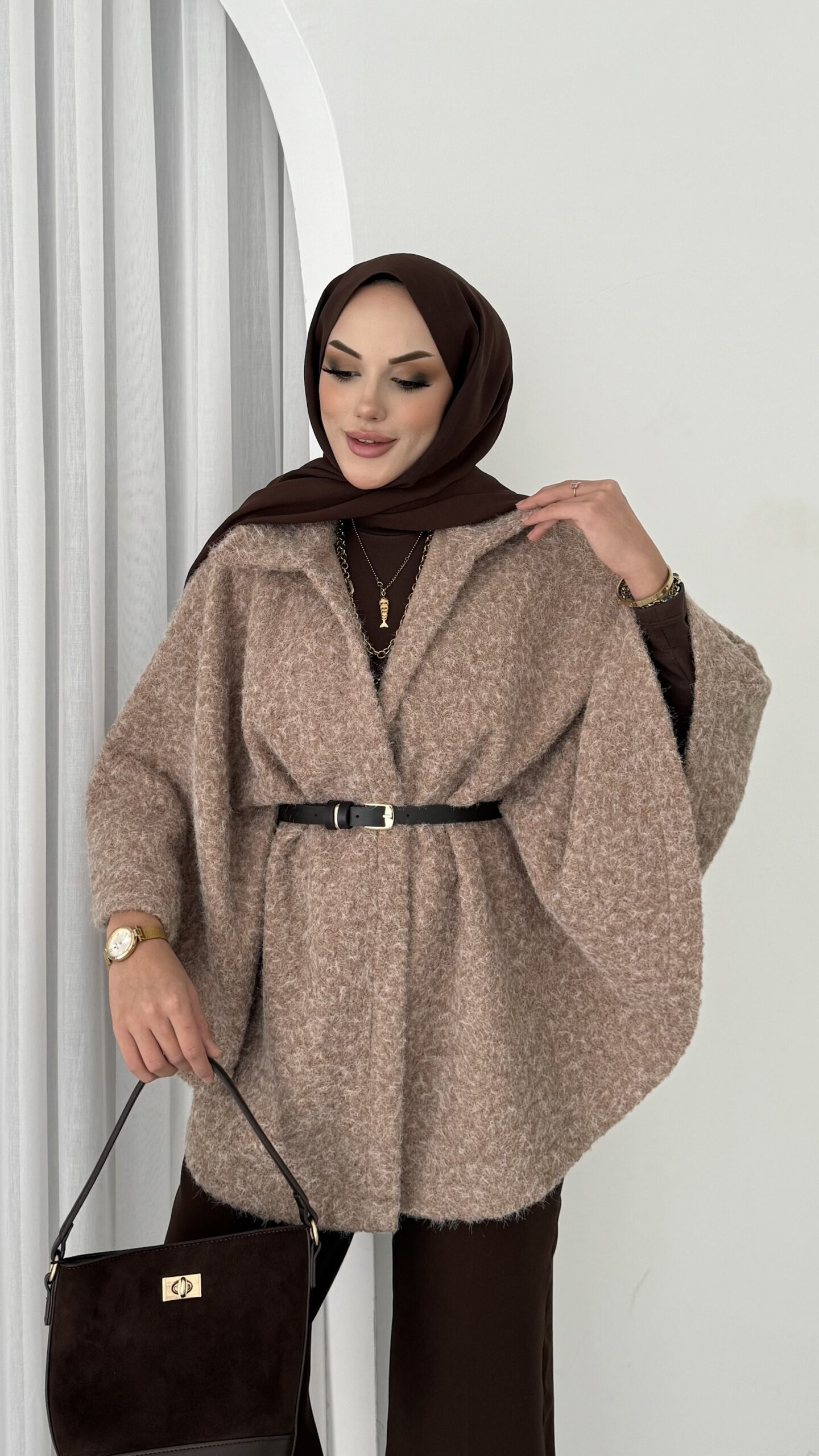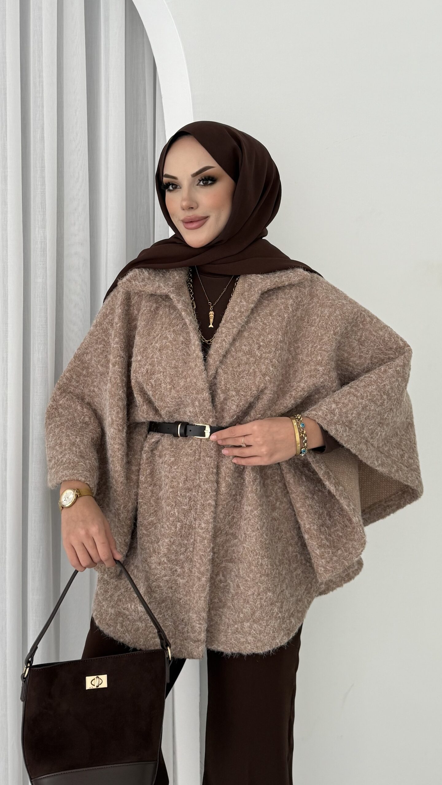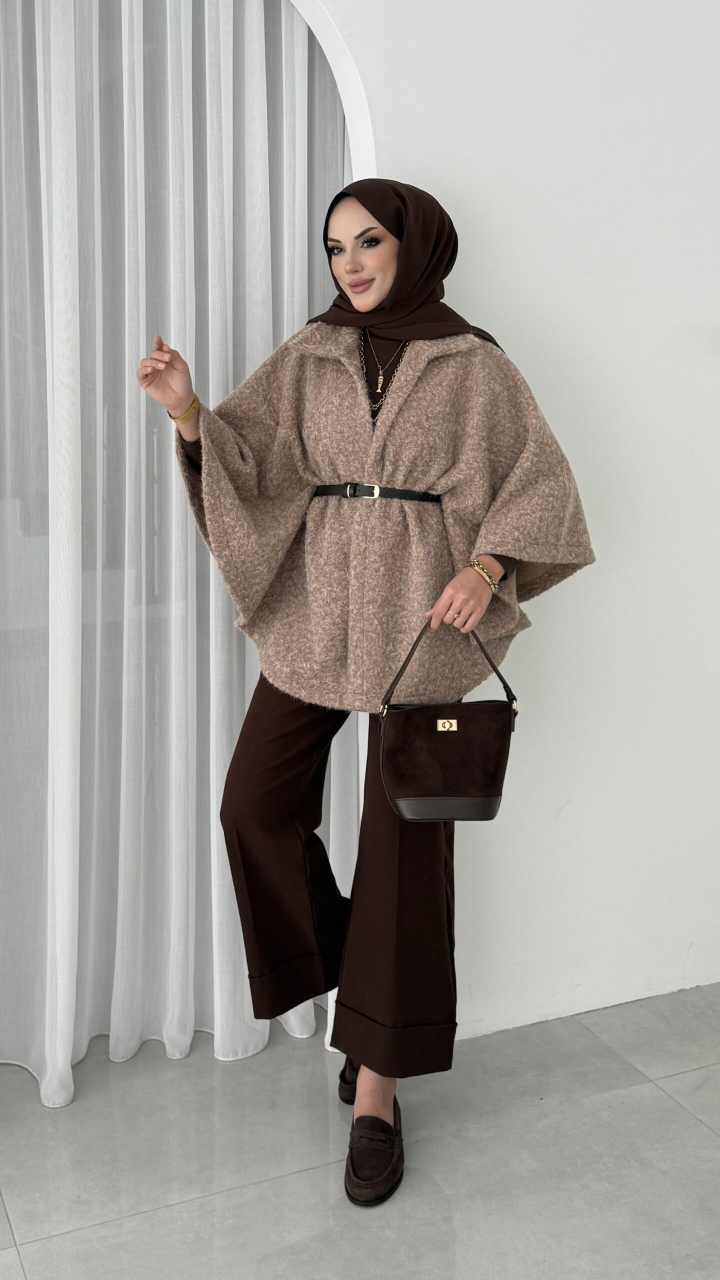 Premium Kılçıklı Kemerli Panço – Kahverengi