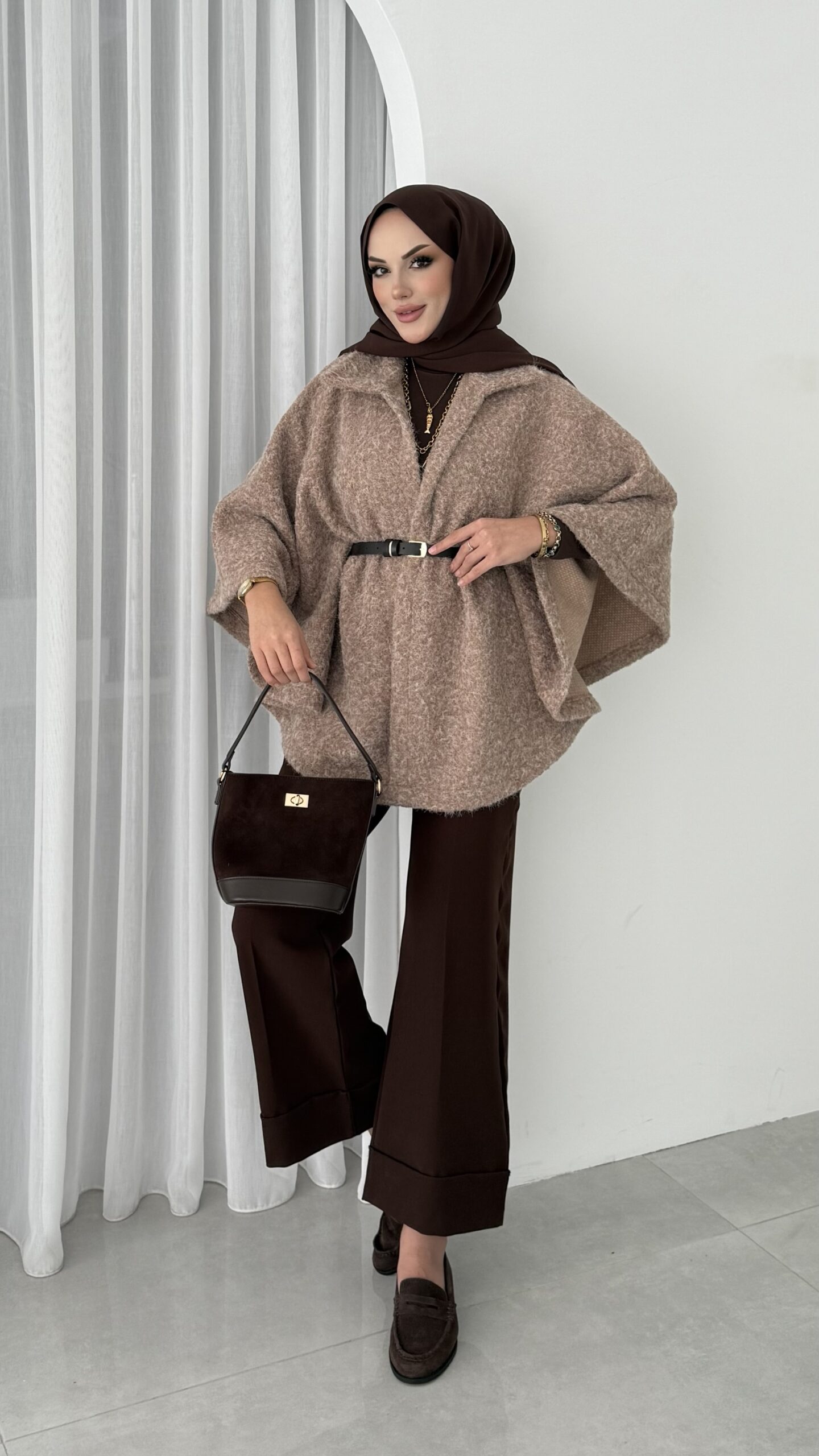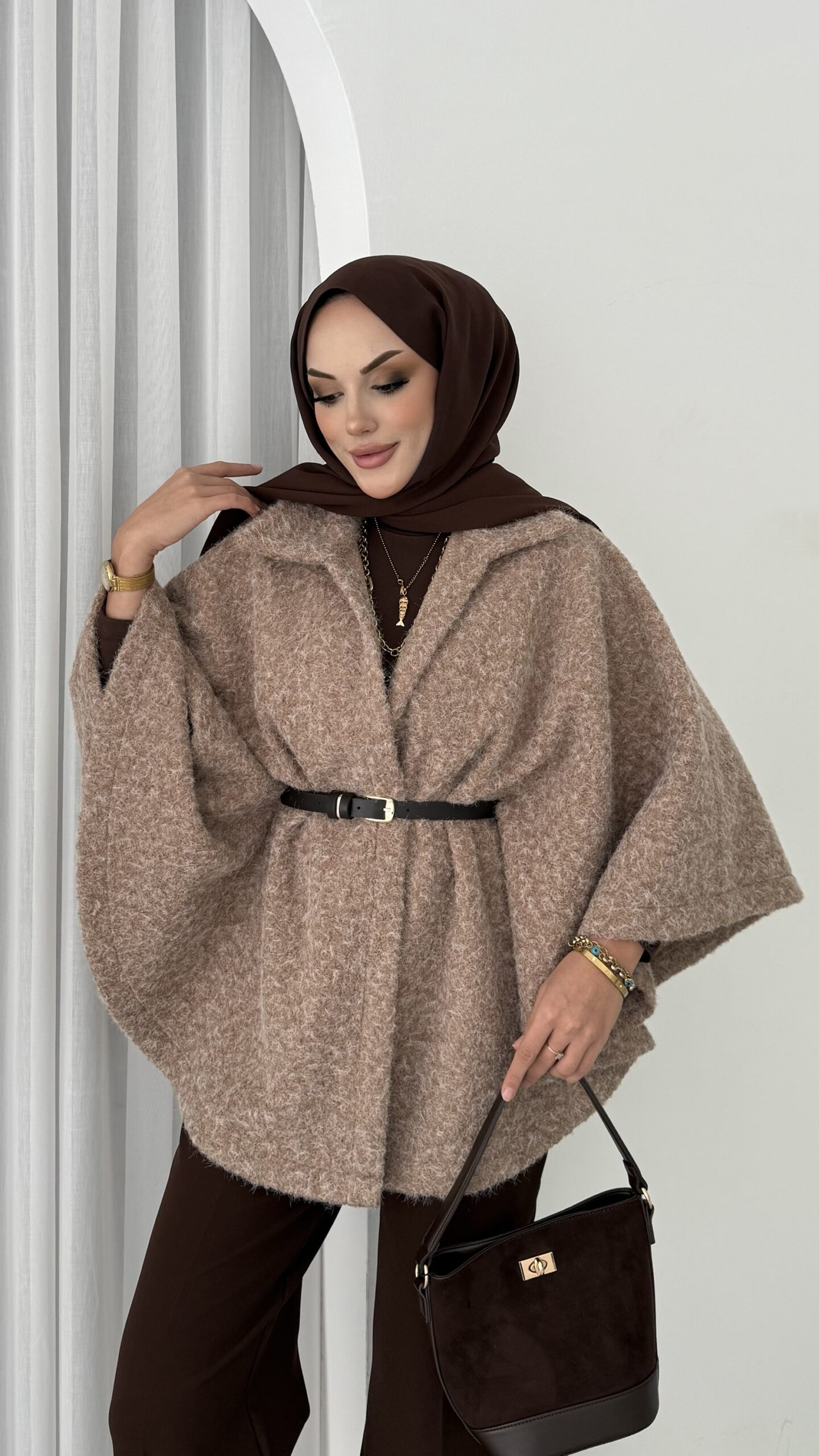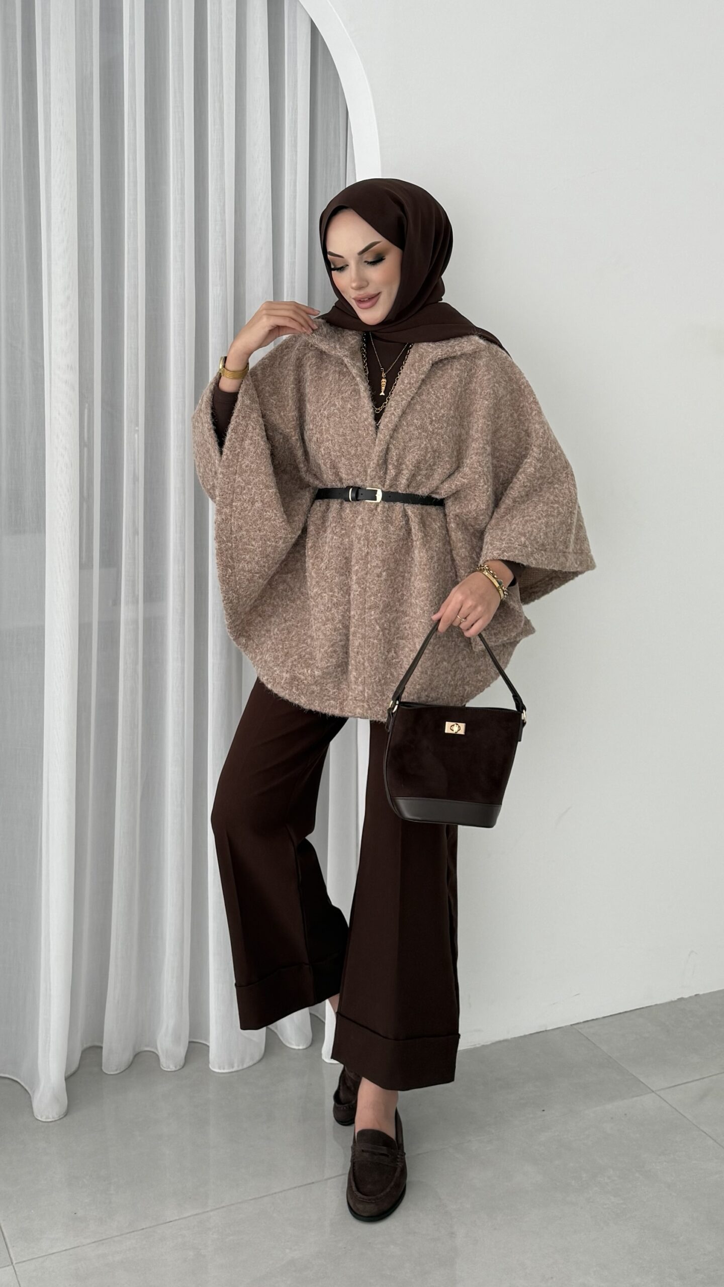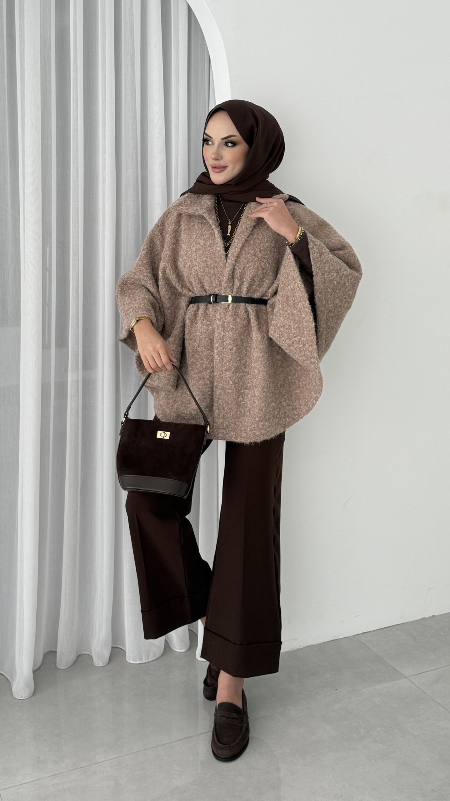 Premium Kılçıklı Kemerli Panço – Kahverengi