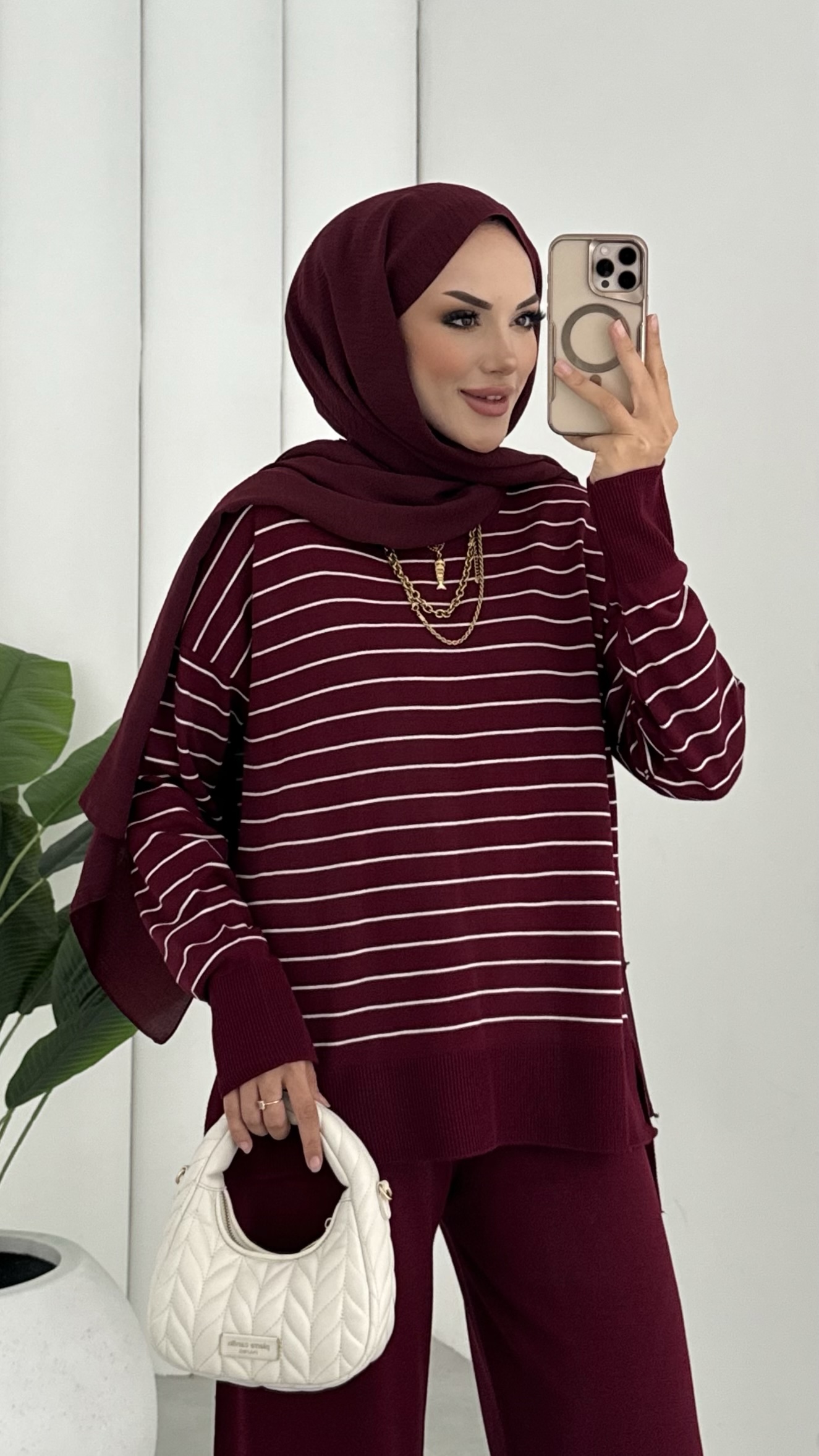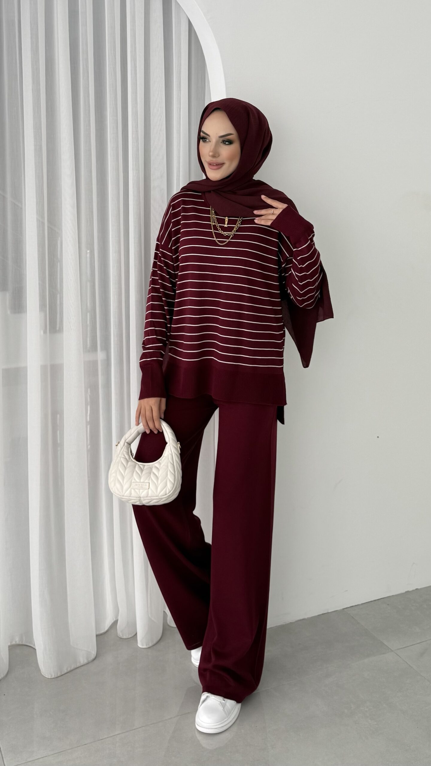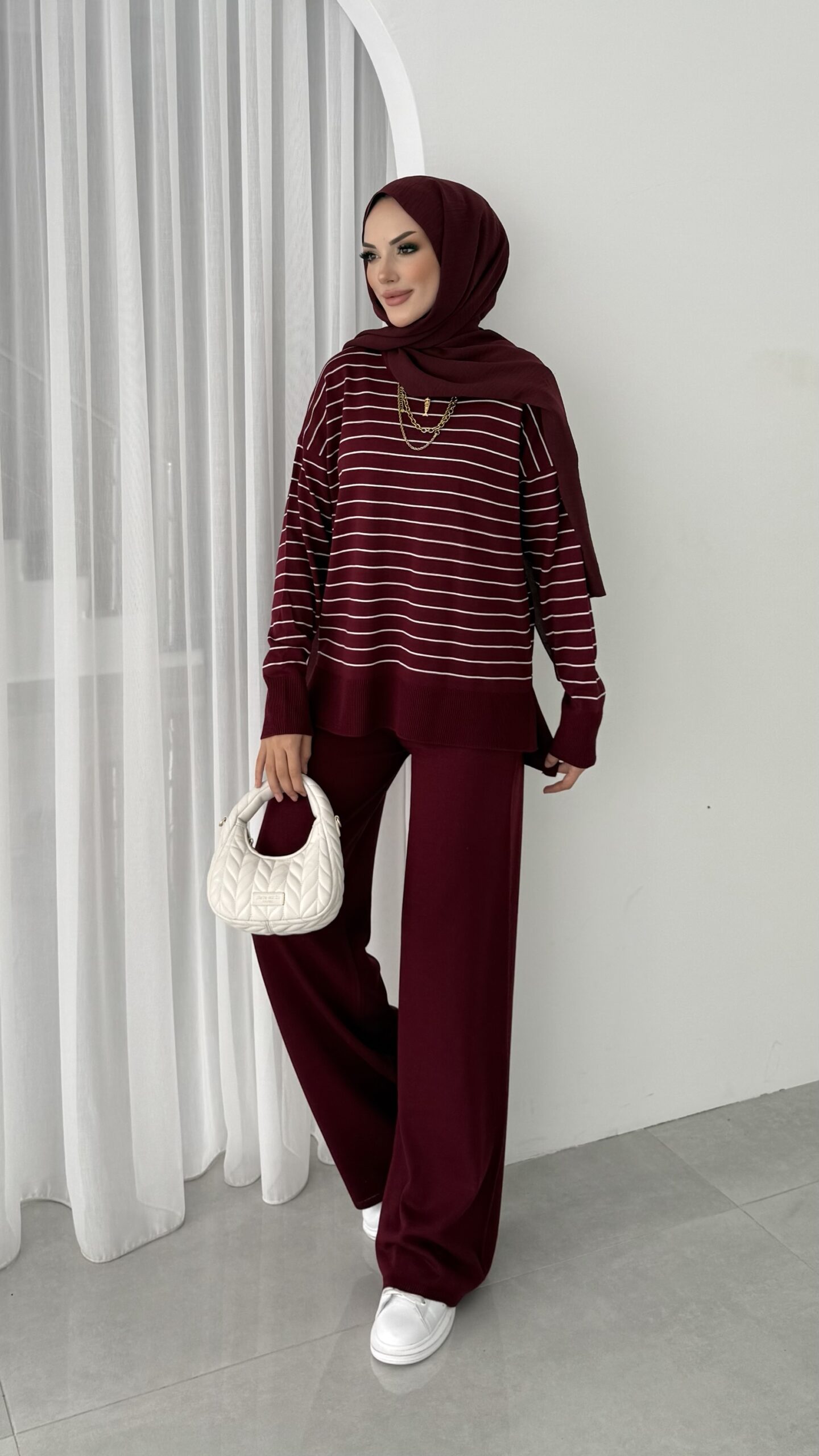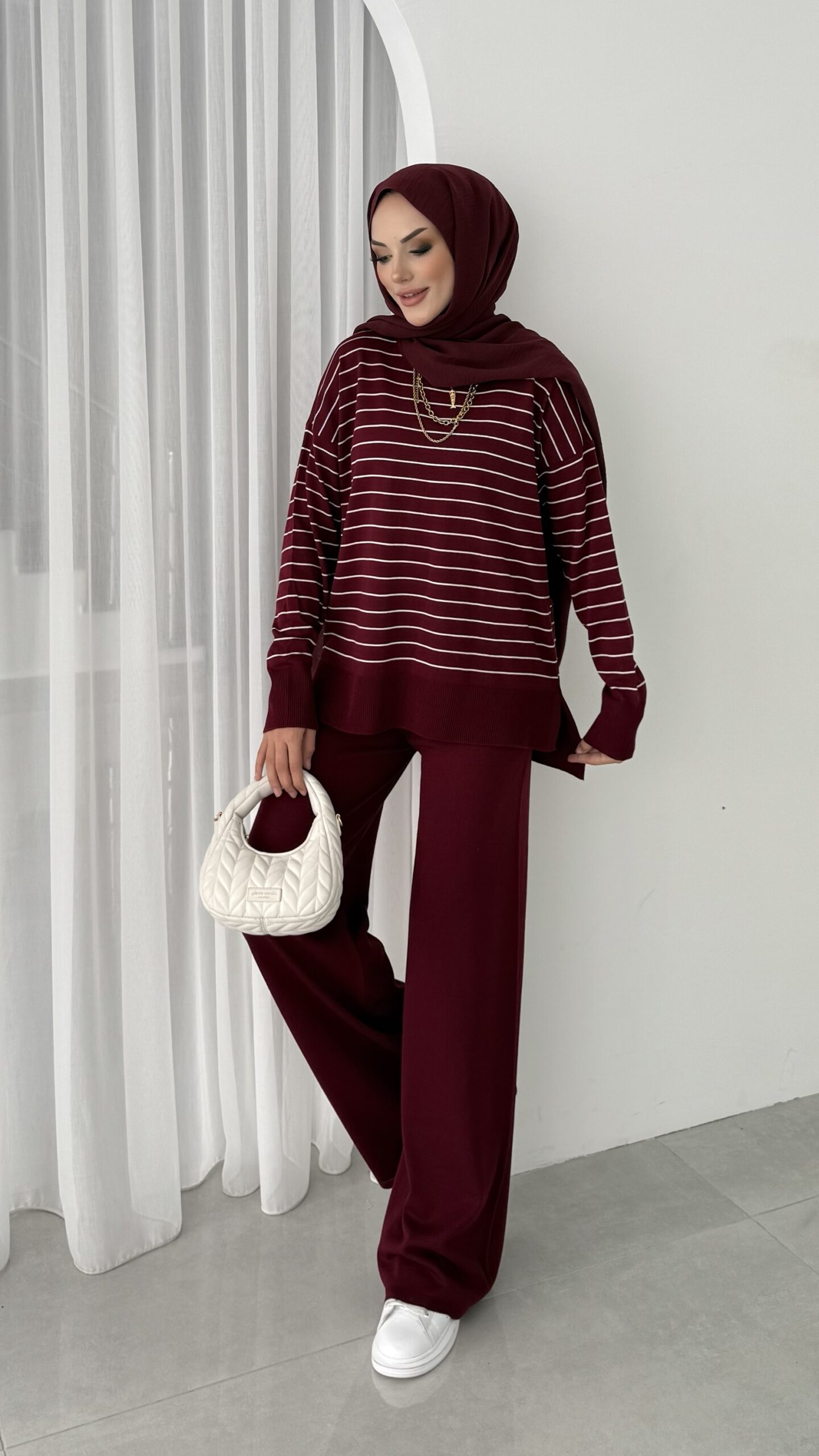 Premium Merserize Çizgili Triko İki Takım – Bordo