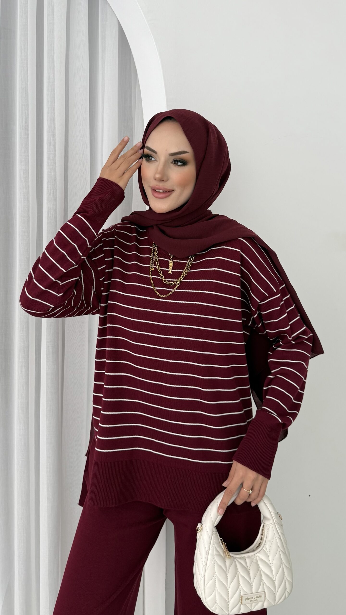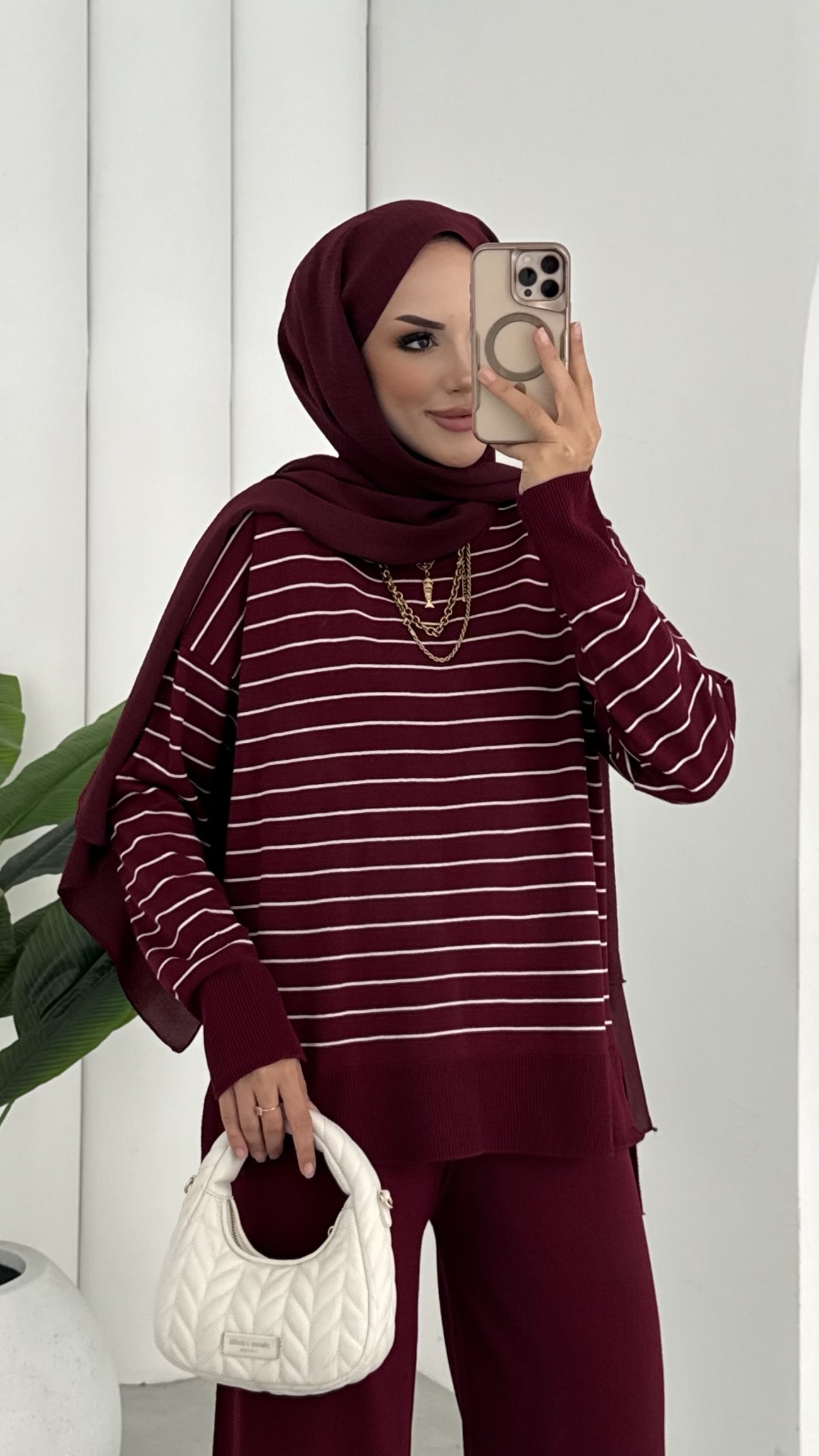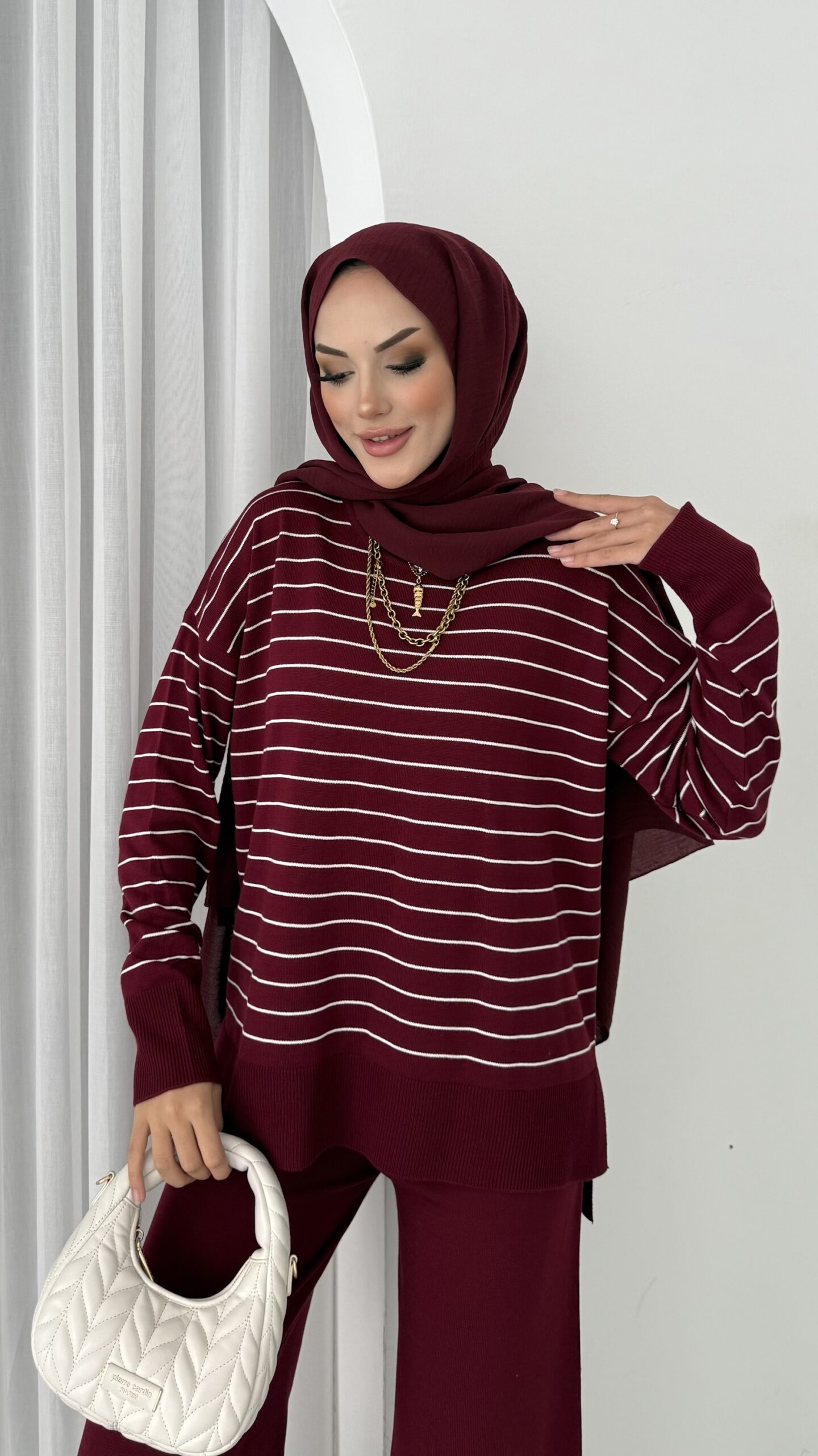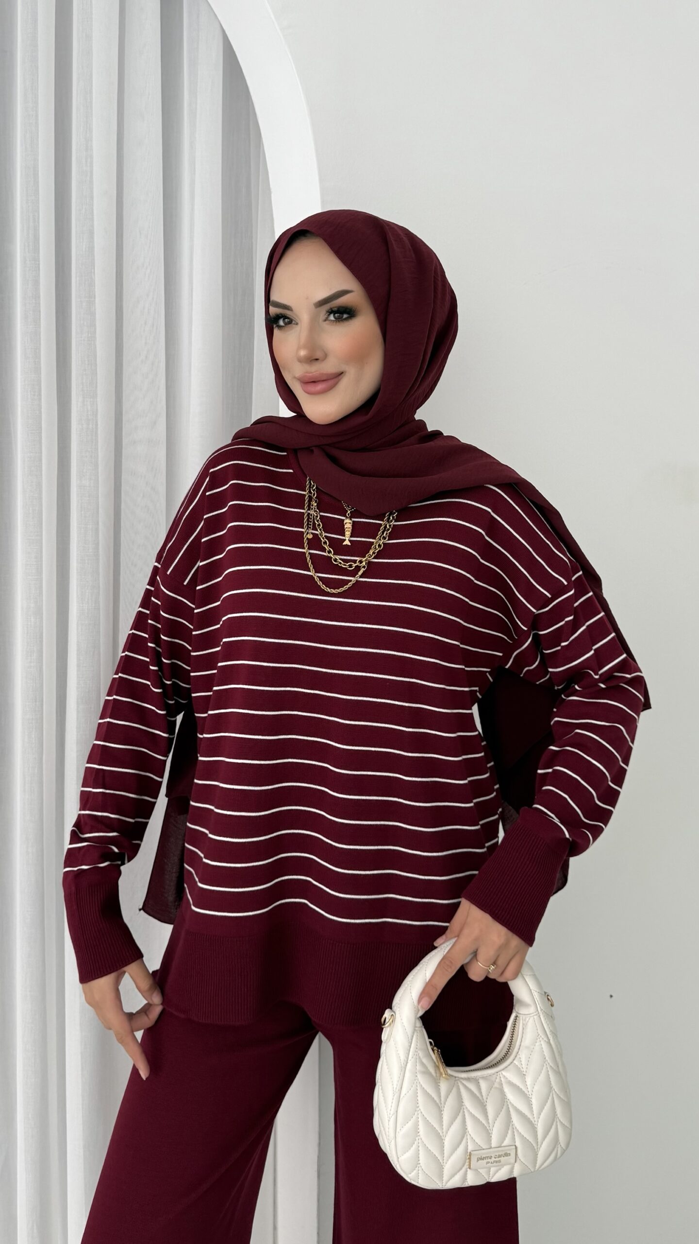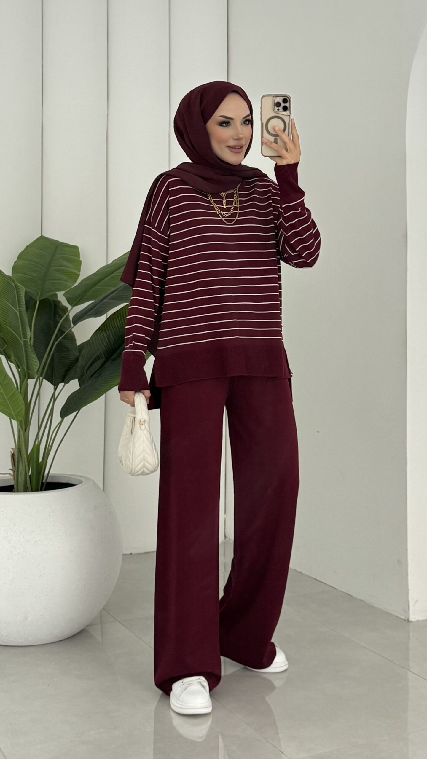 Premium Merserize Çizgili Triko İki Takım – Bordo