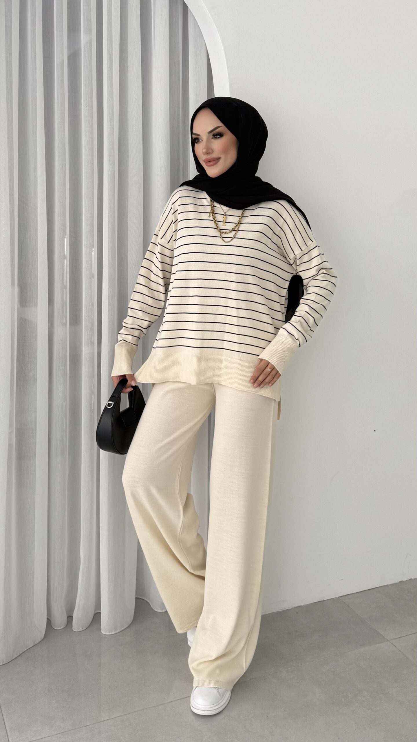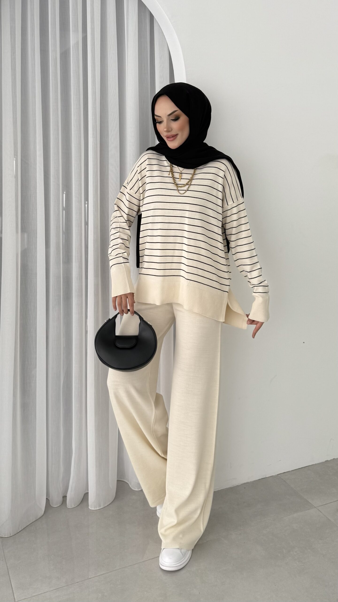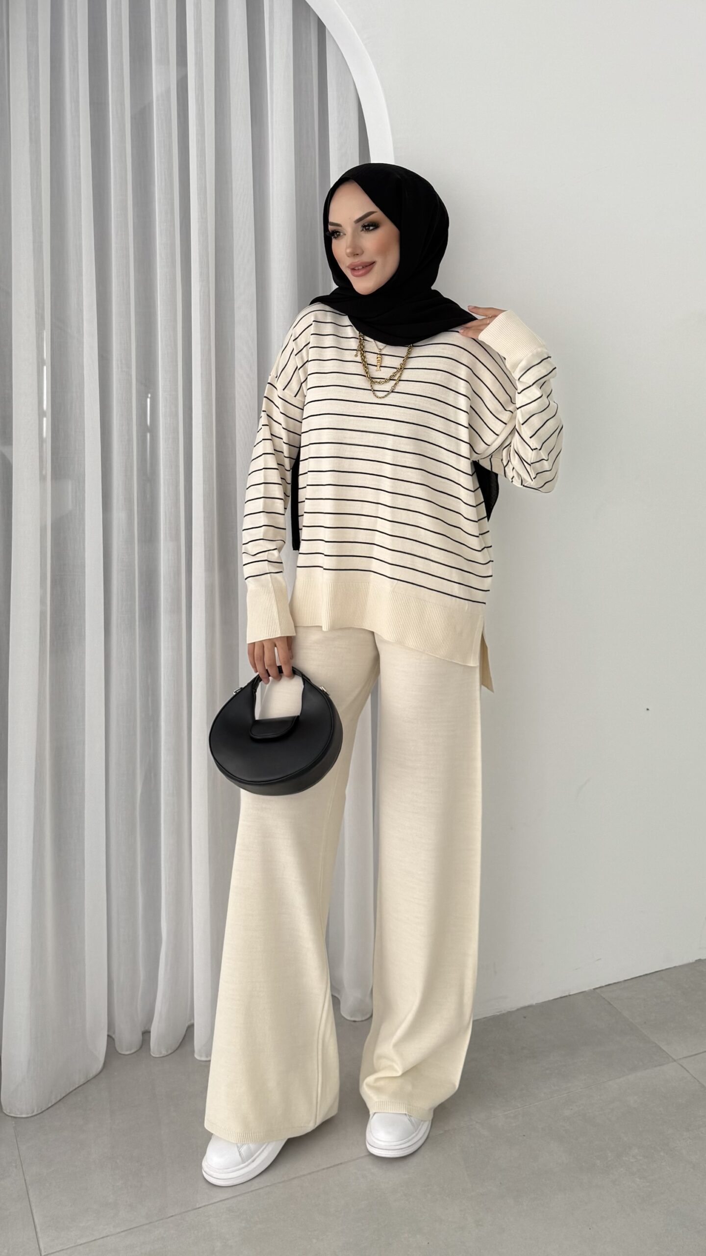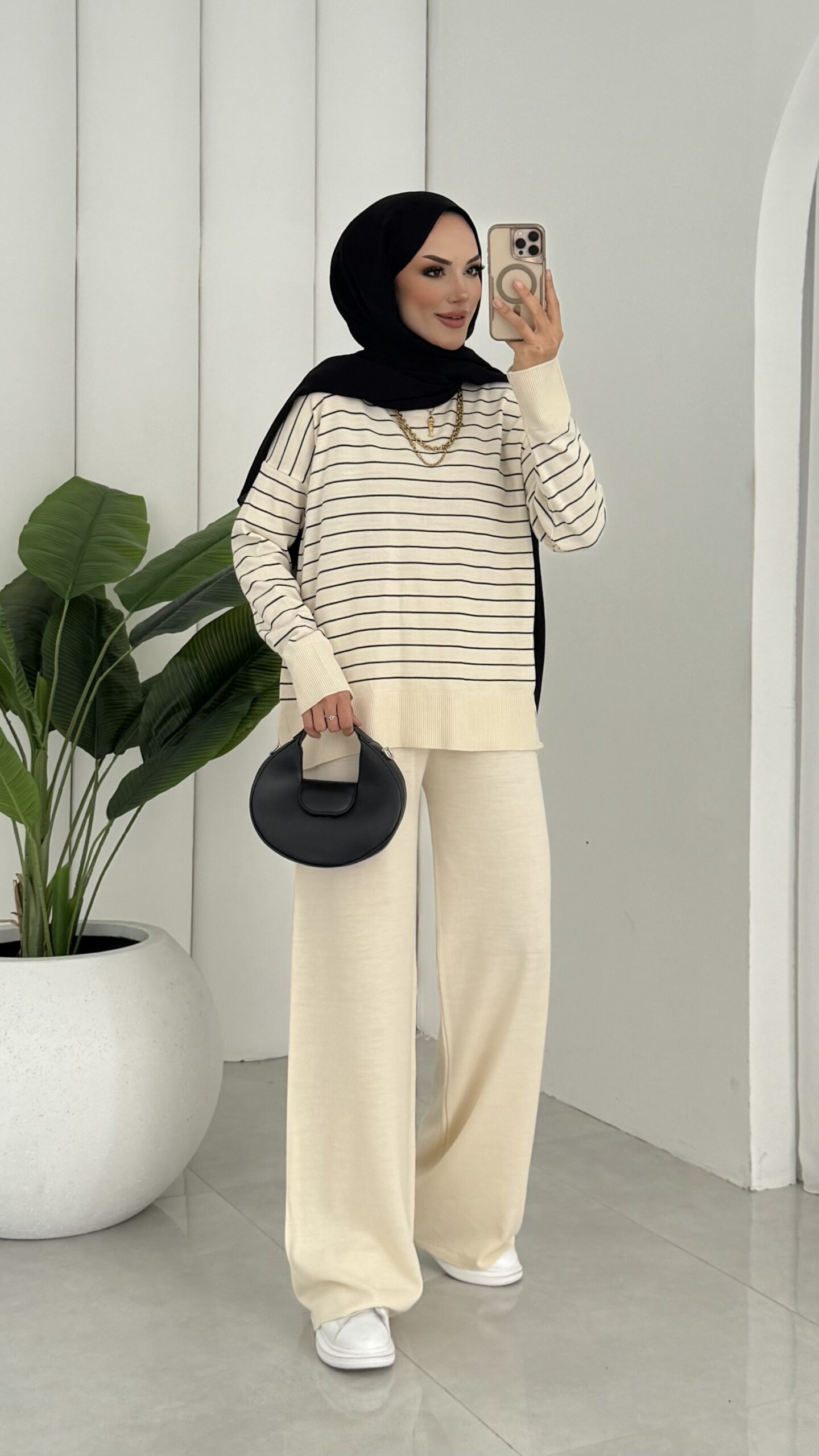 Premium Merserize Çizgili Triko İki Takım – Ekru