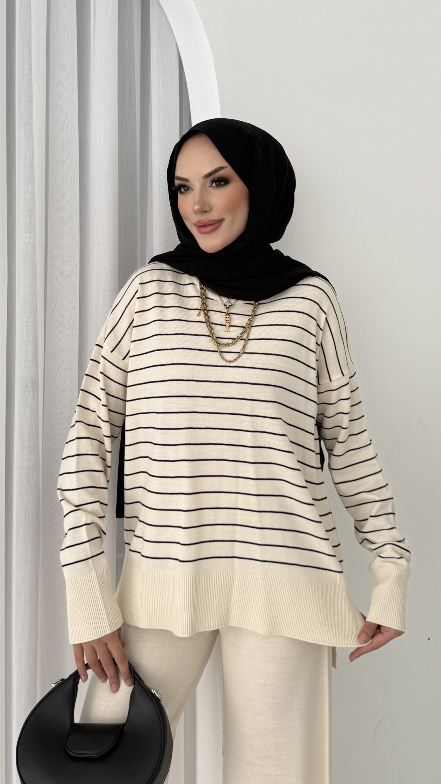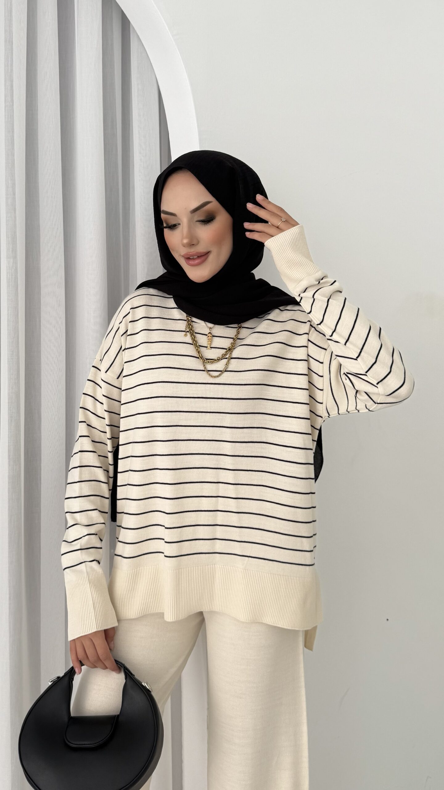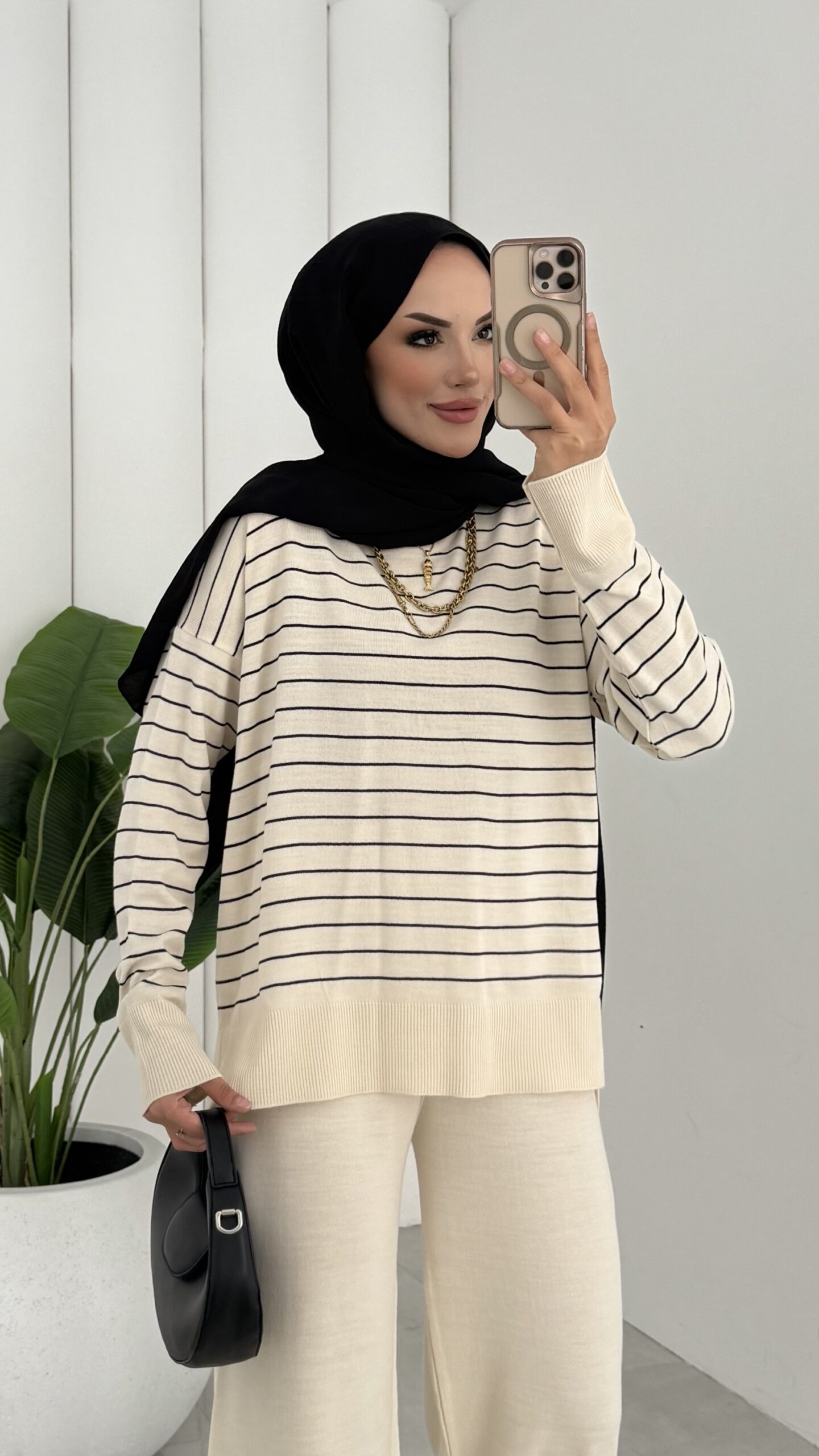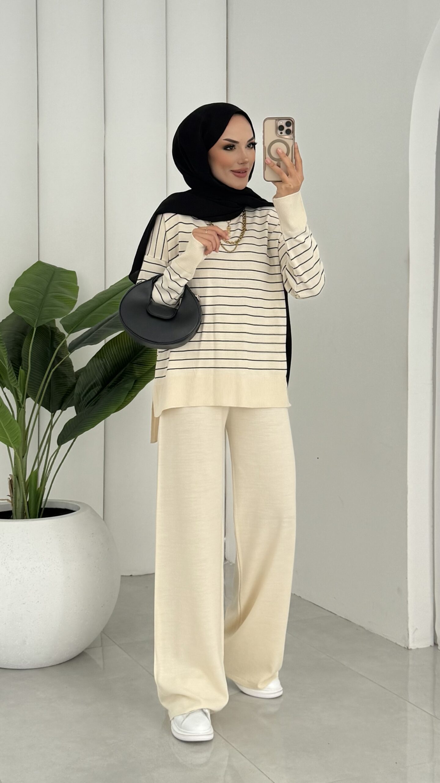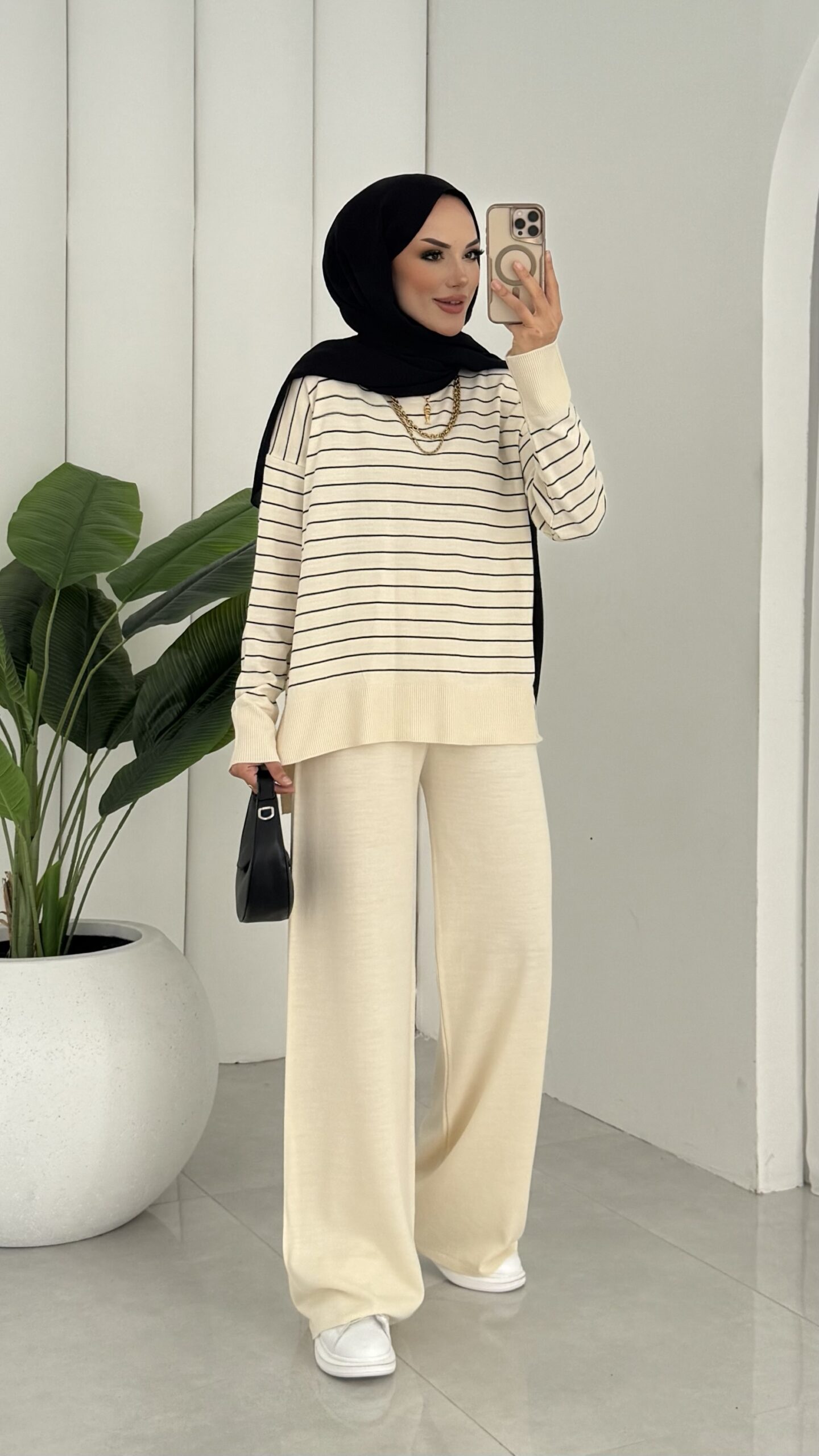 Premium Merserize Çizgili Triko İki Takım – Ekru