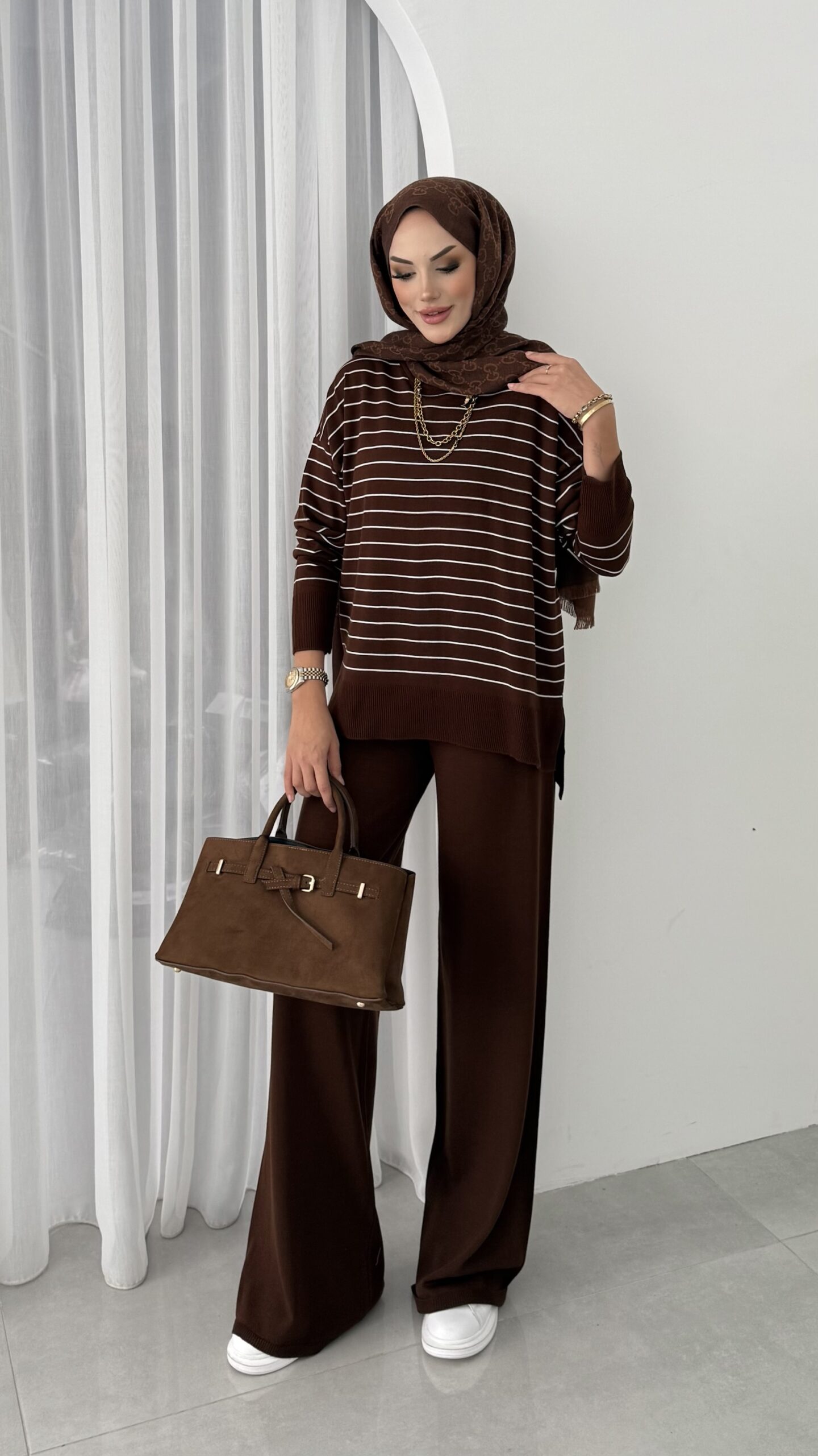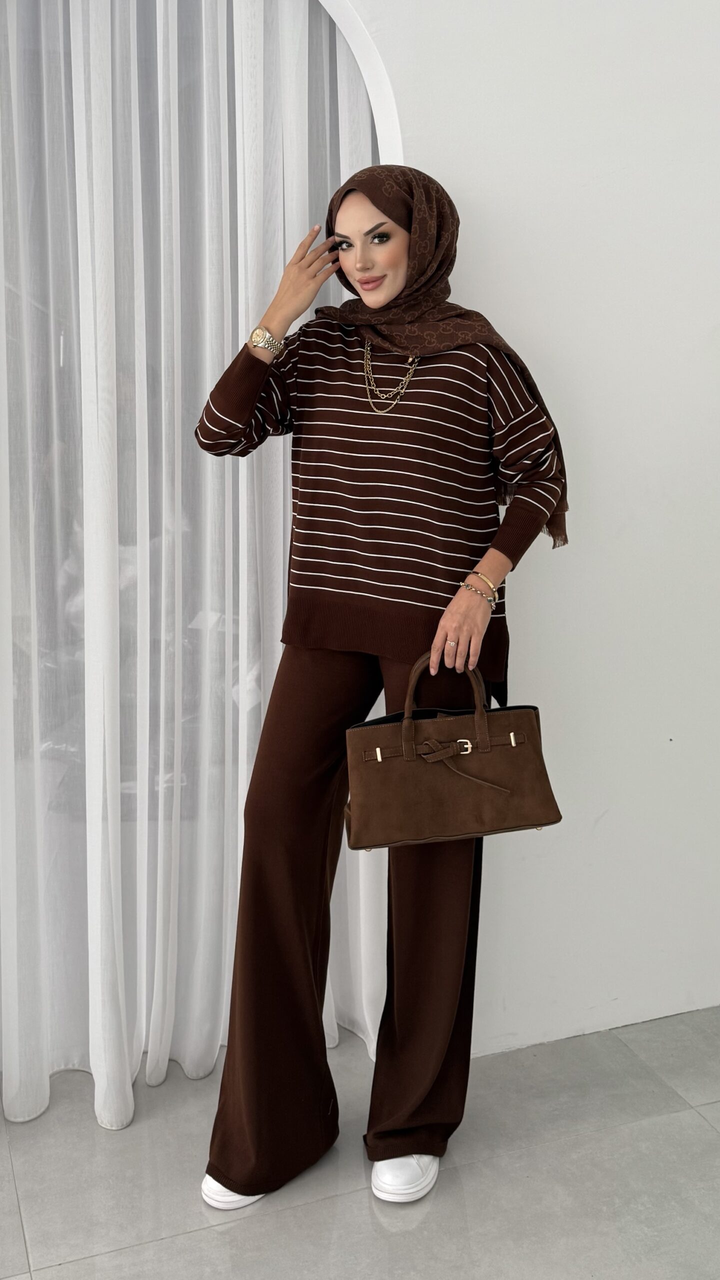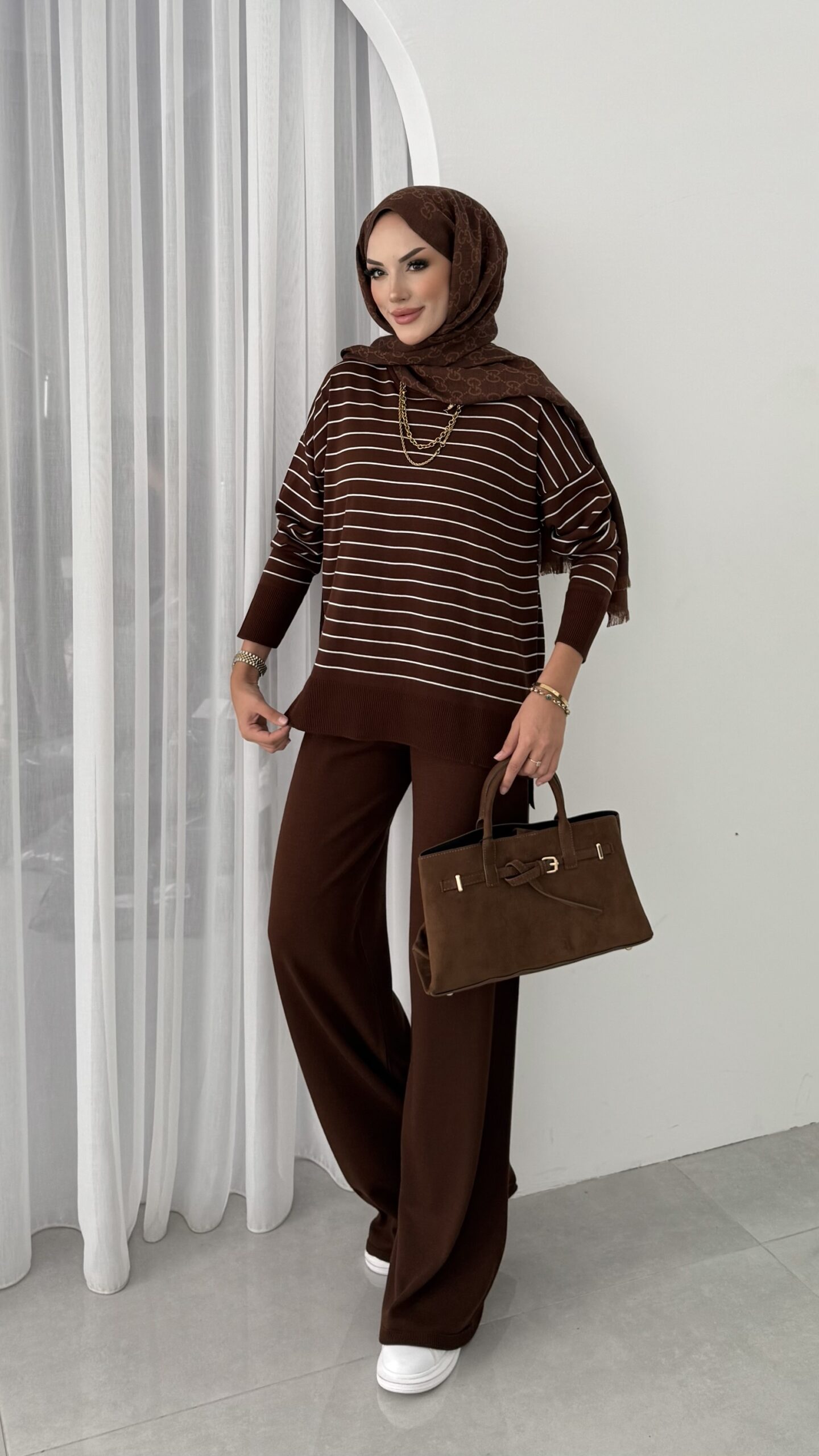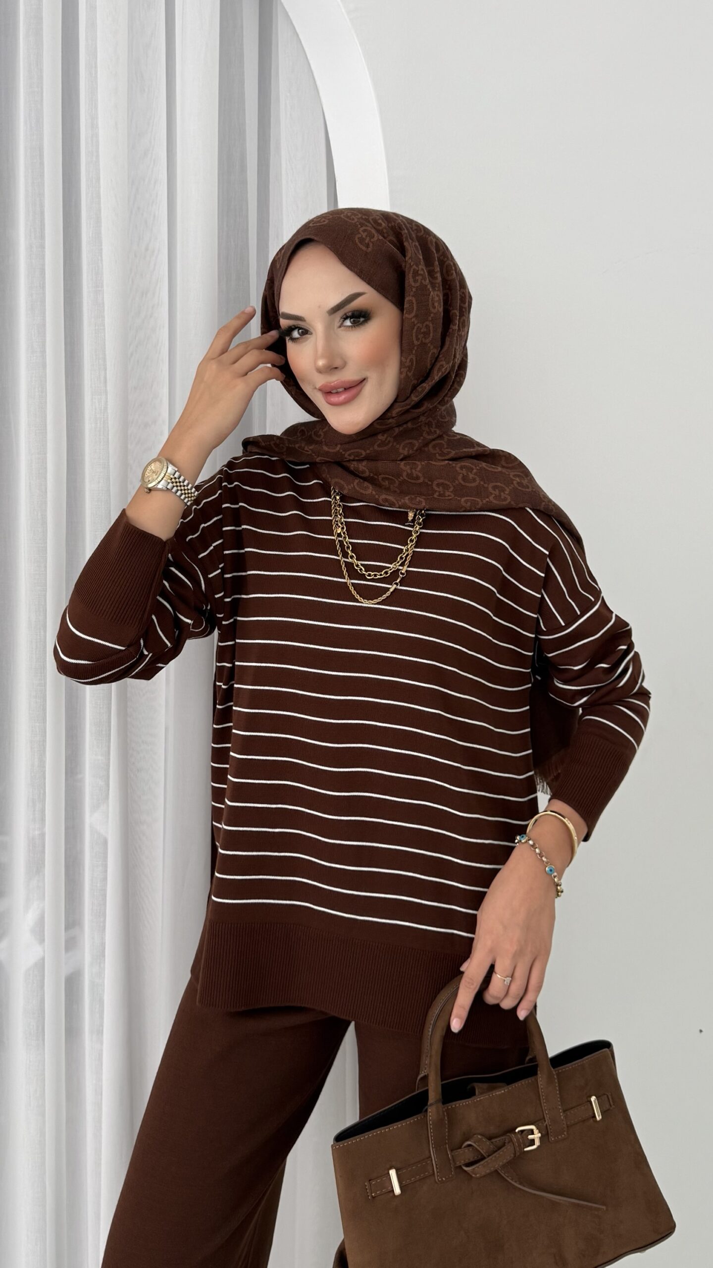 Premium Merserize Çizgili Triko İki Takım – Kahverengi