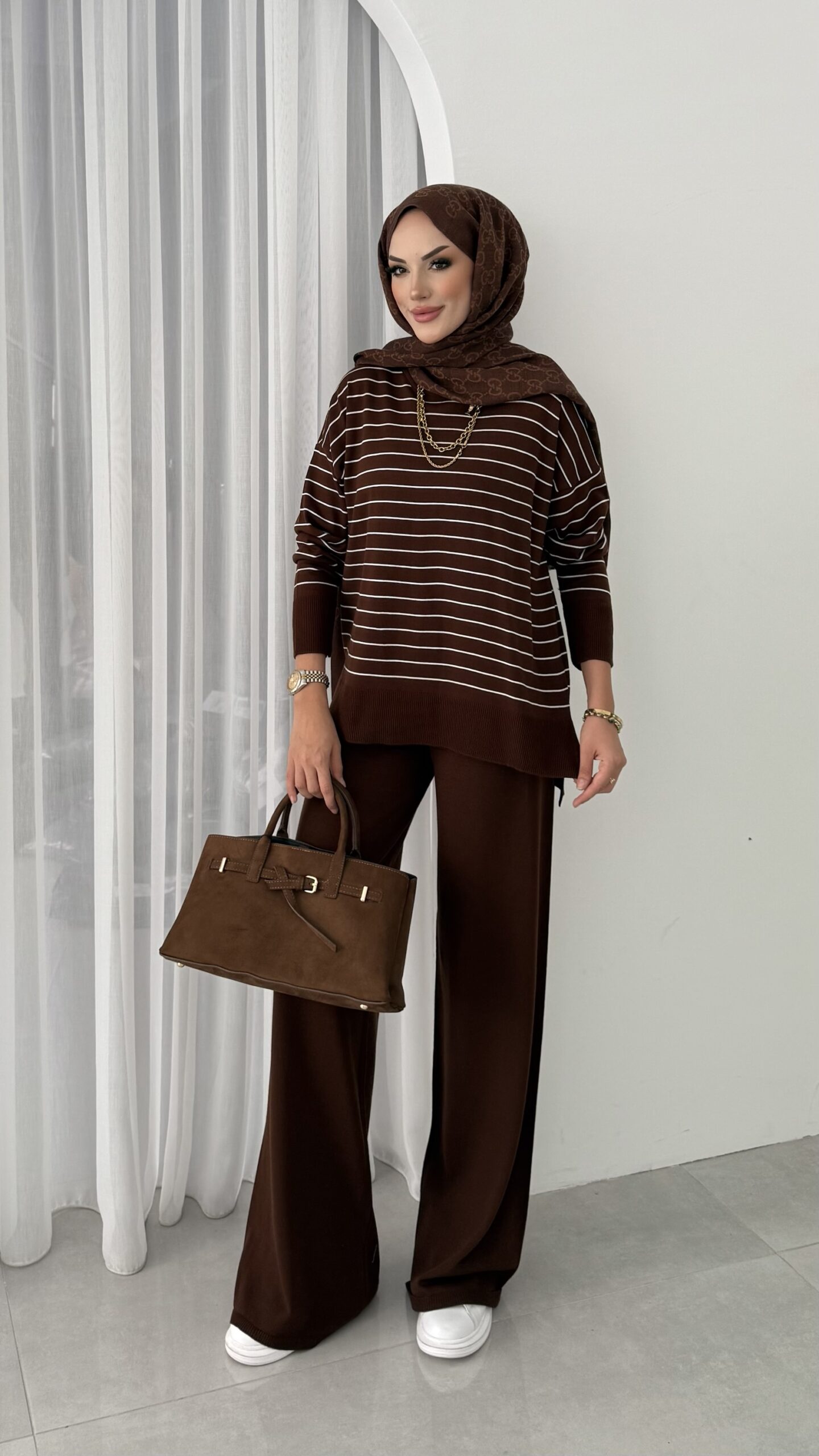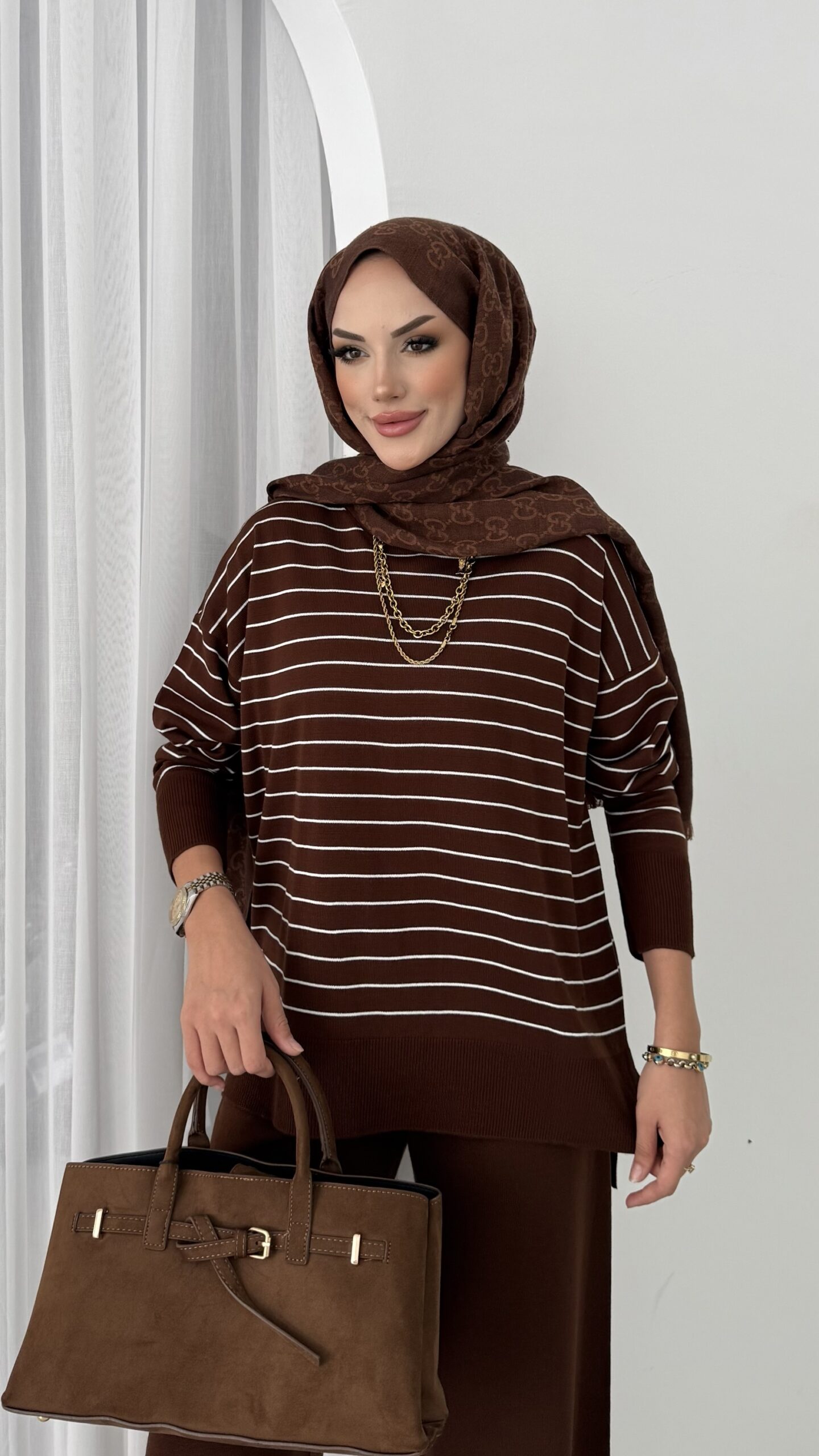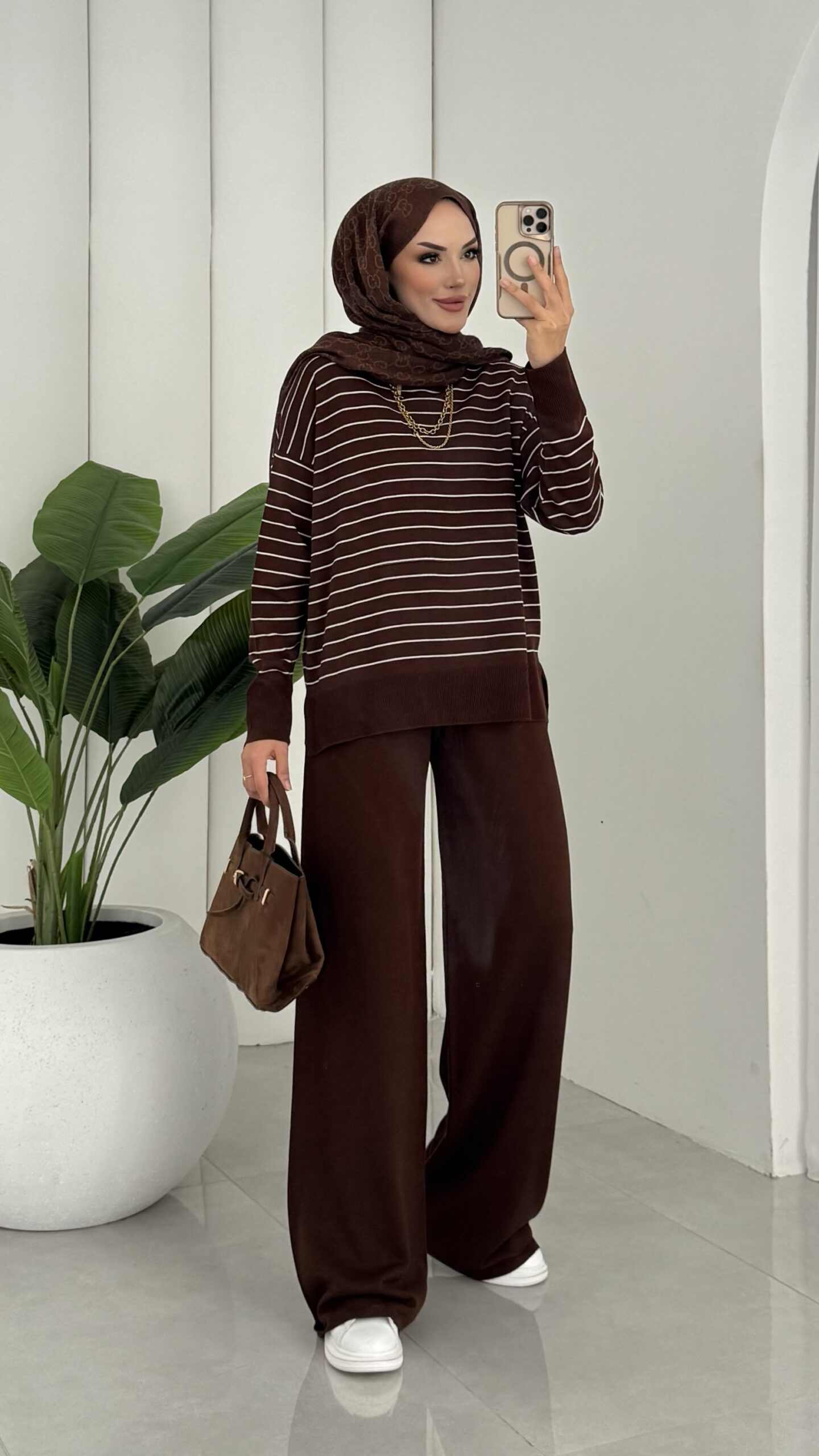 Premium Merserize Çizgili Triko İki Takım – Kahverengi