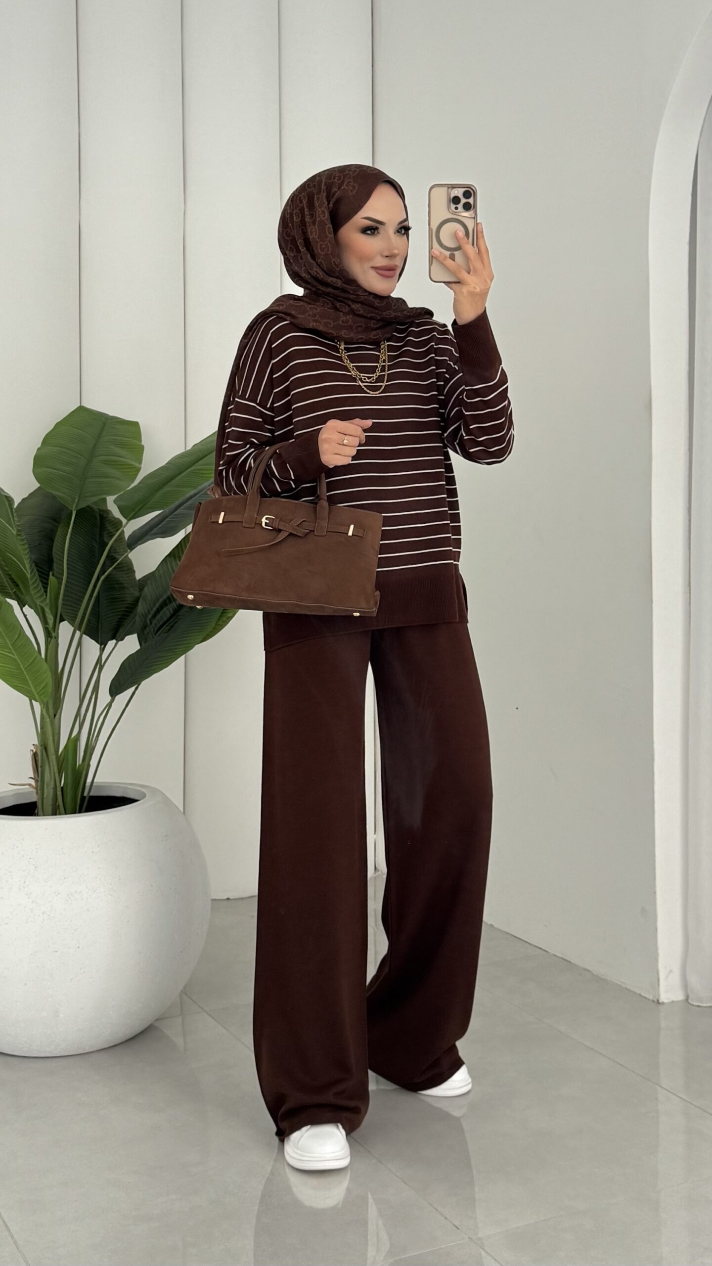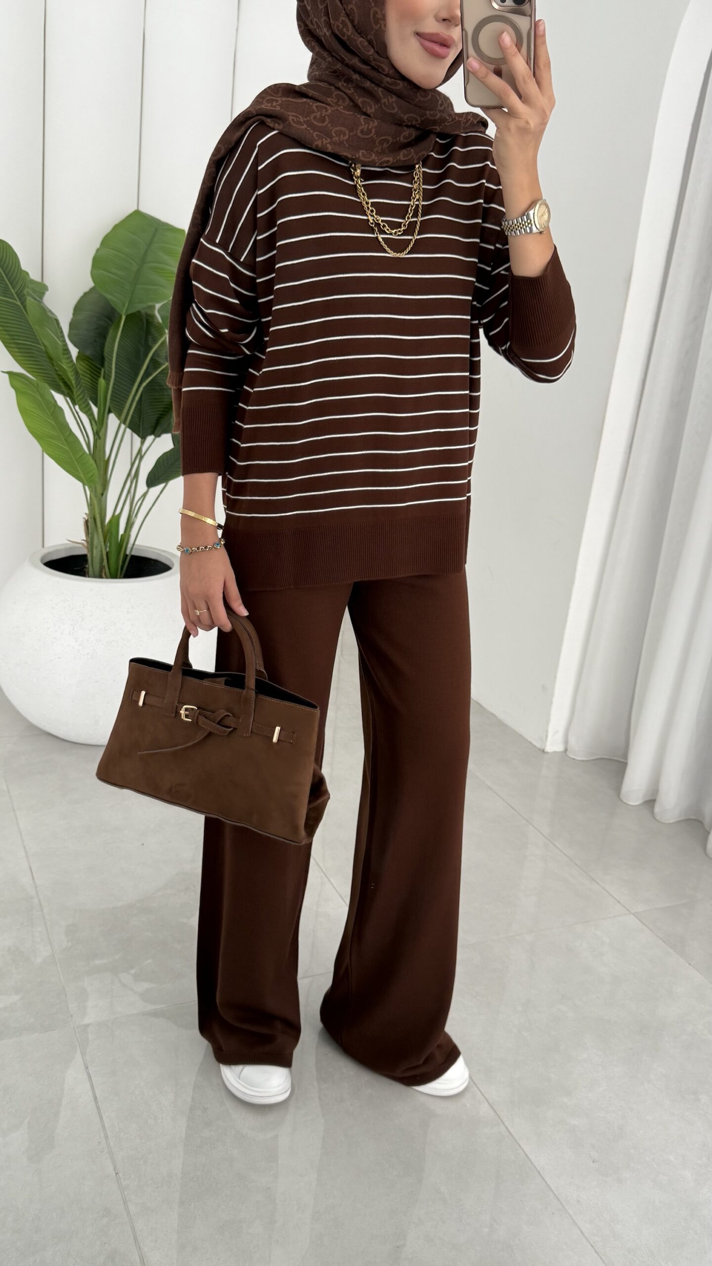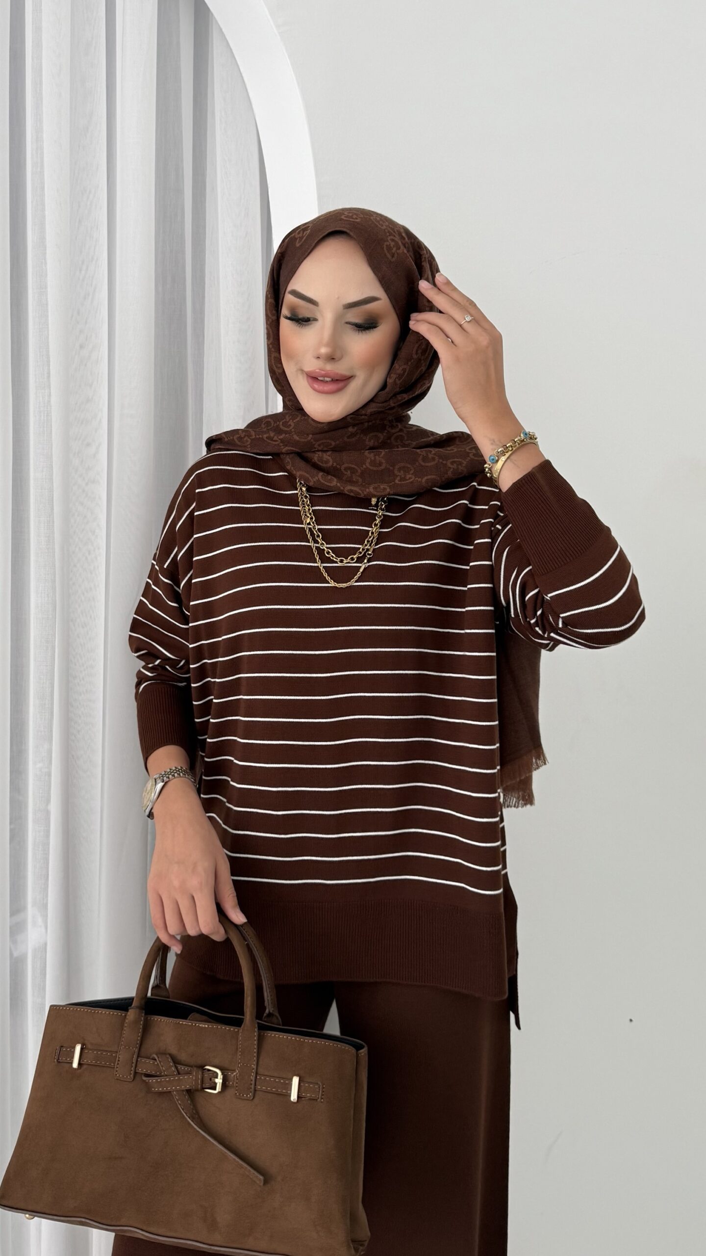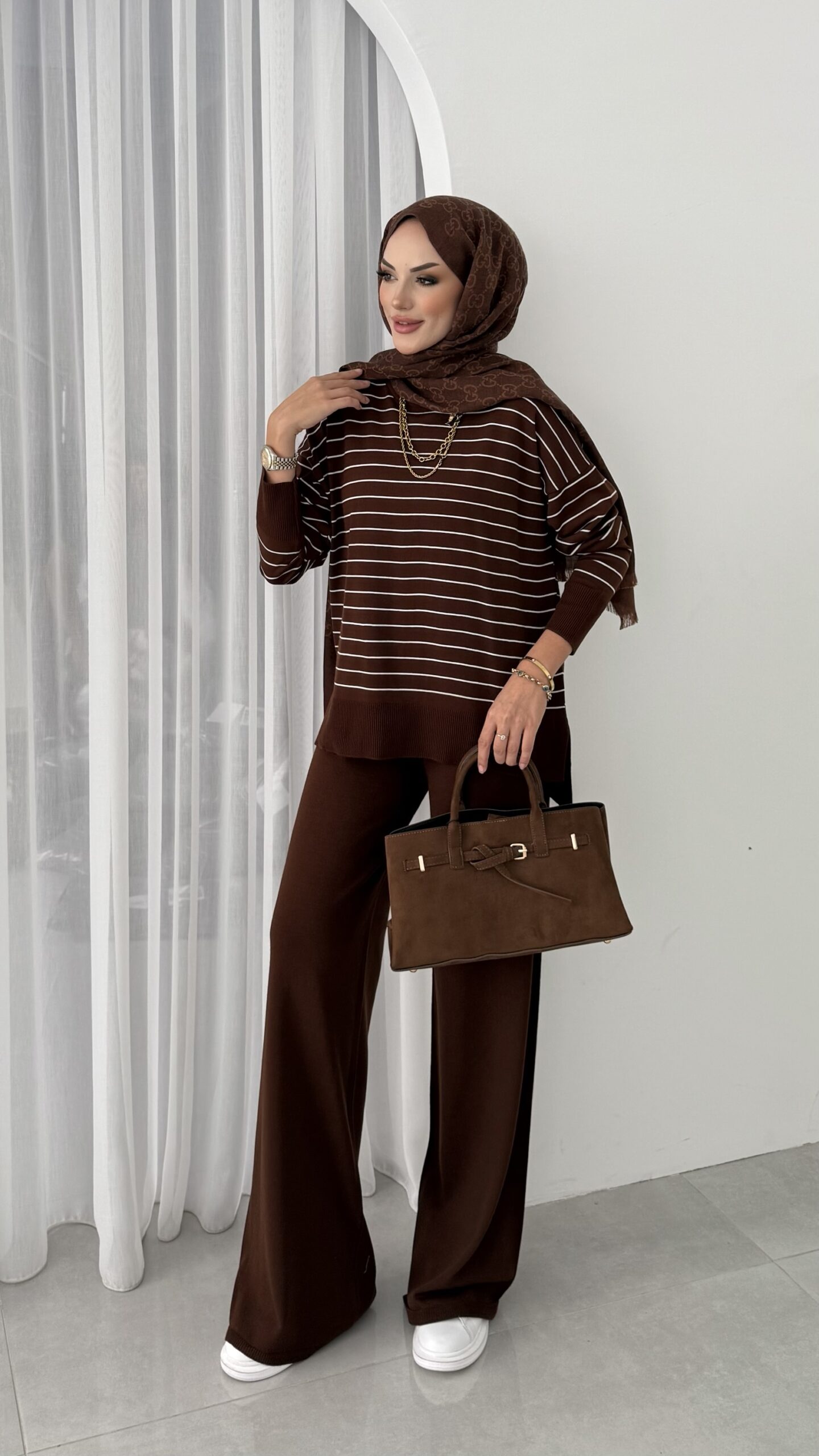 Premium Merserize Çizgili Triko İki Takım – Kahverengi