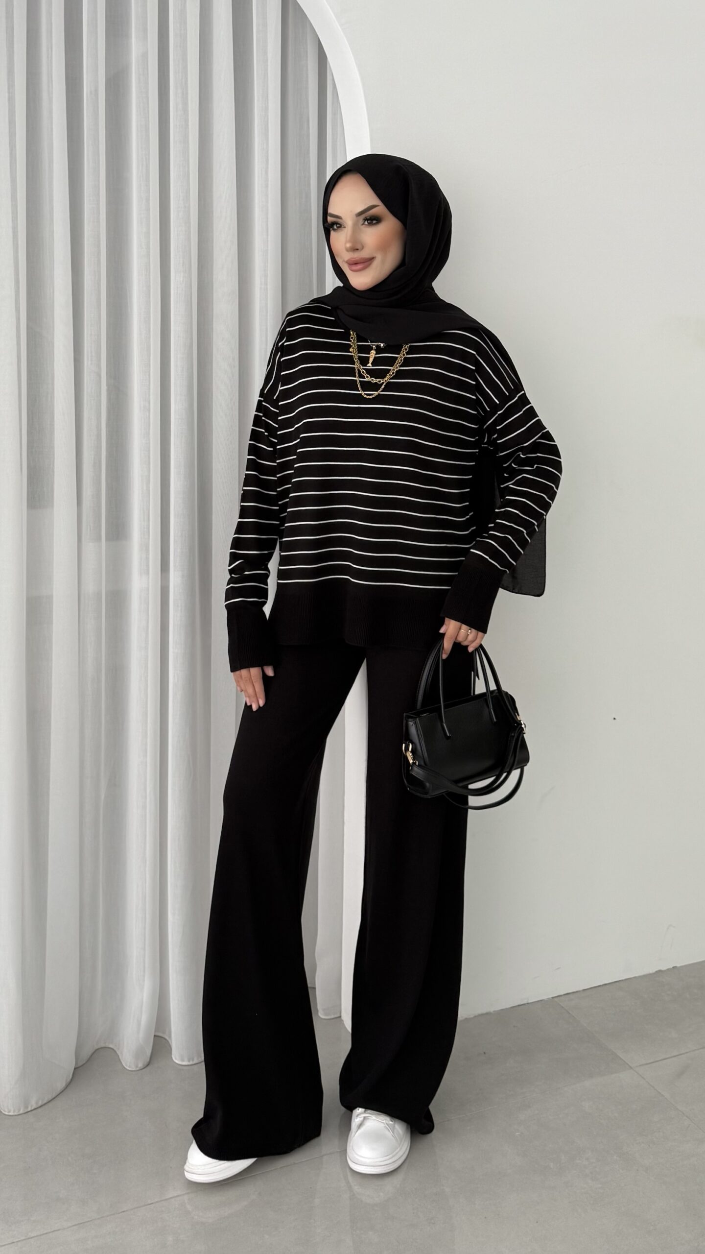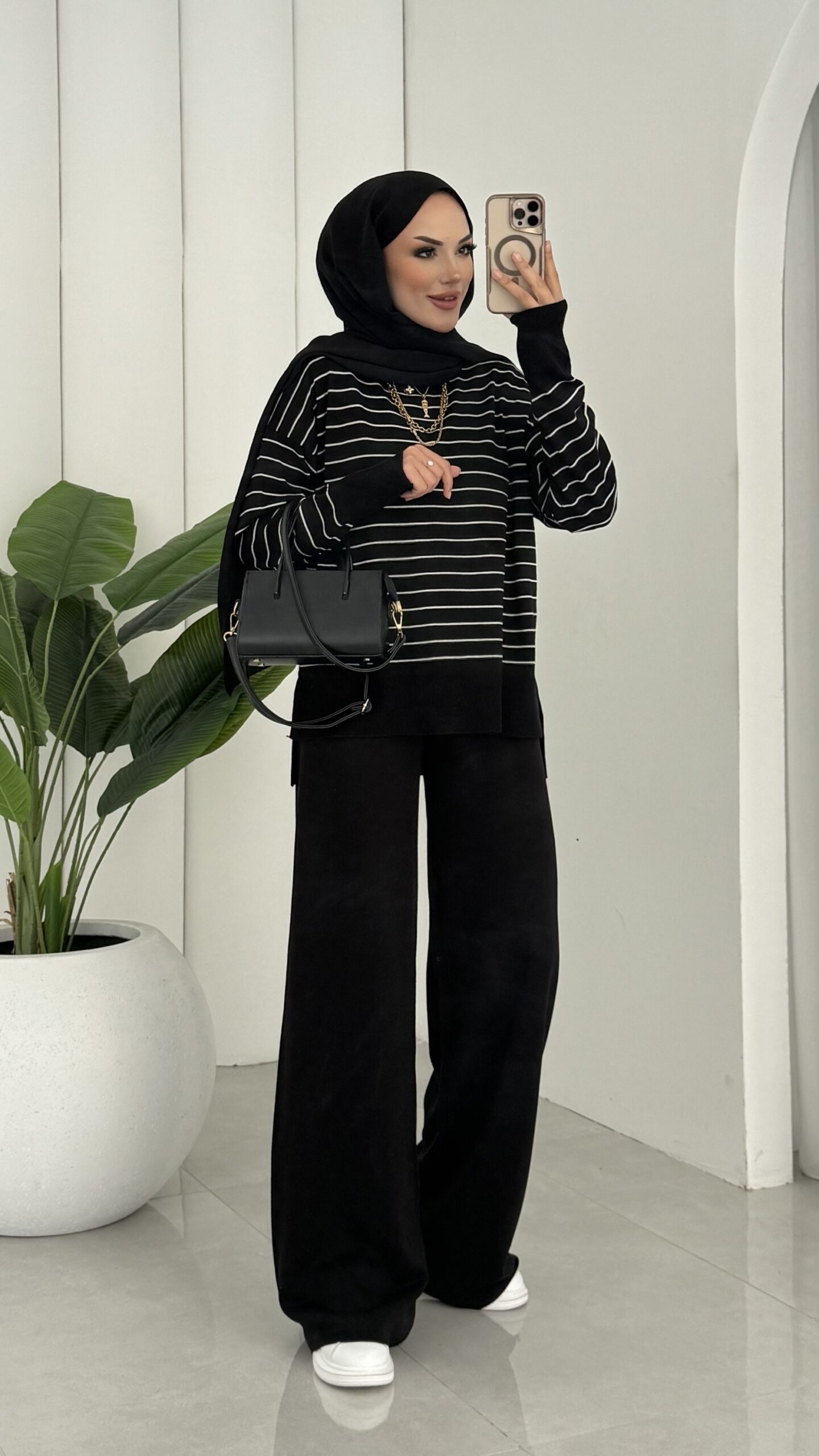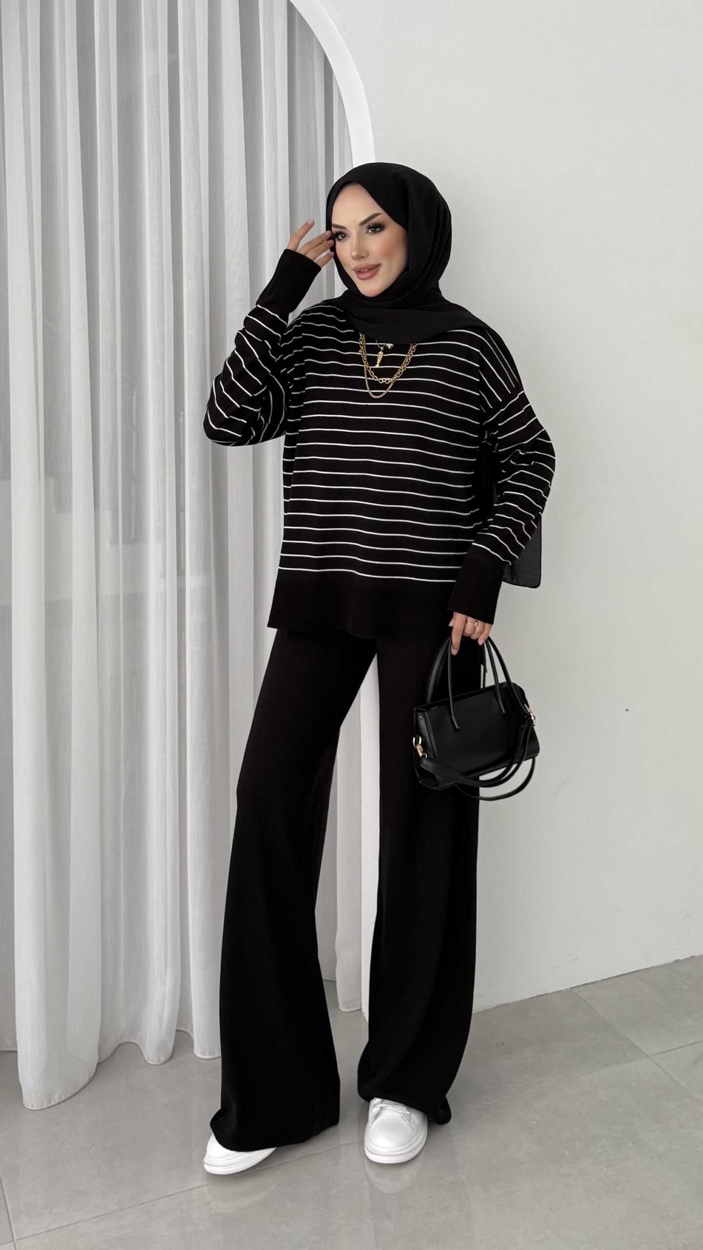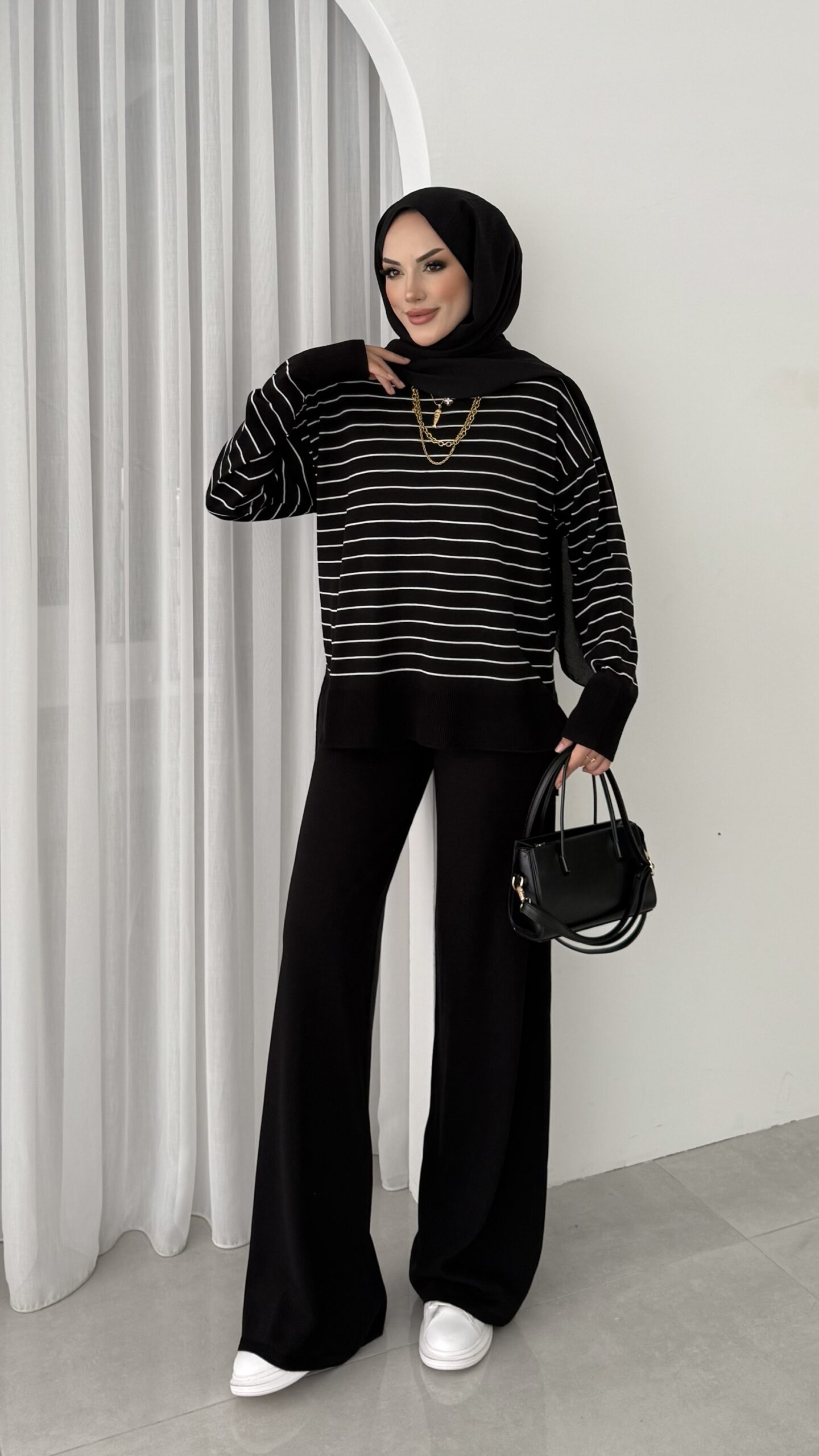 Premium Merserize Çizgili Triko İki Takım – Siyah