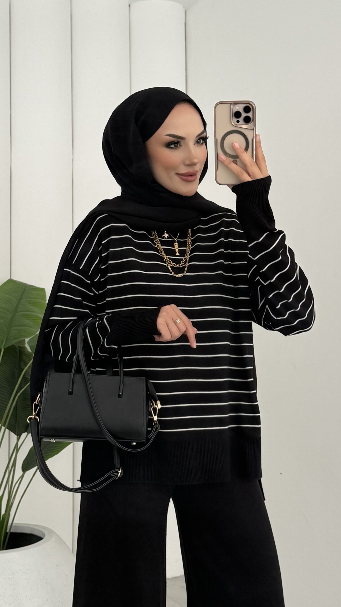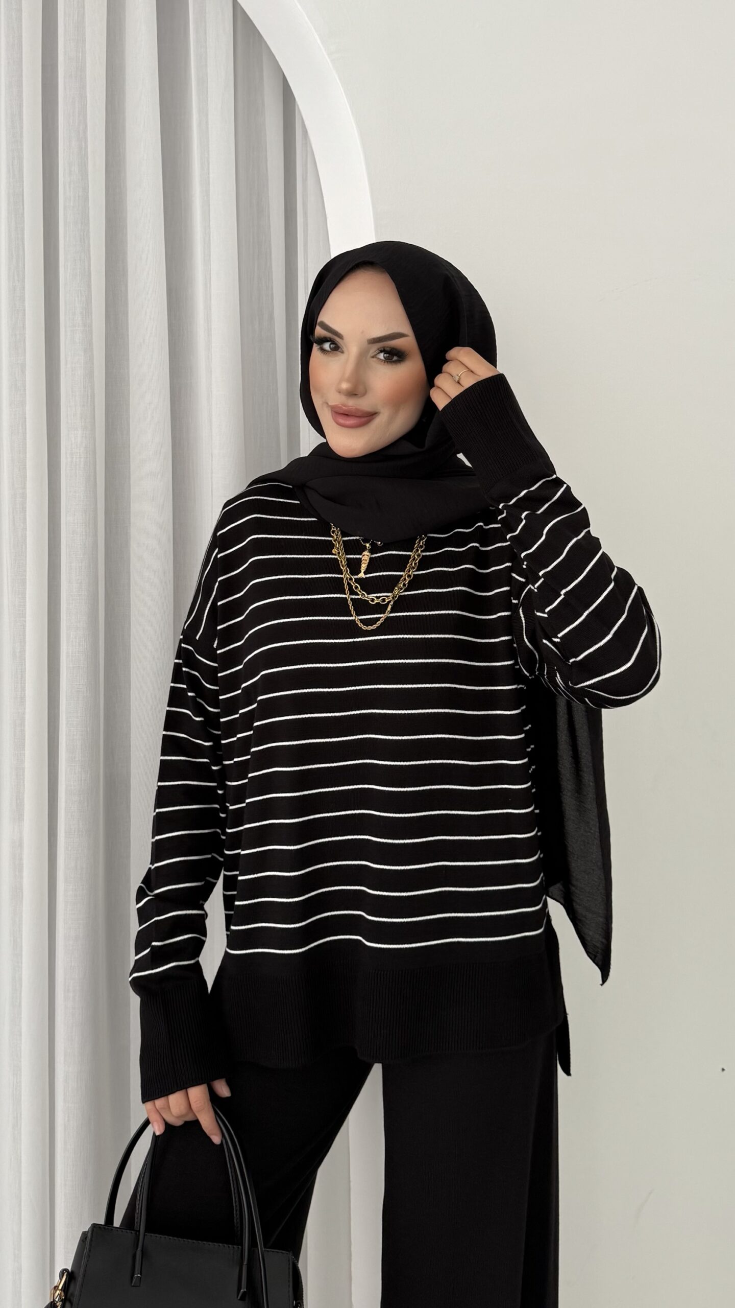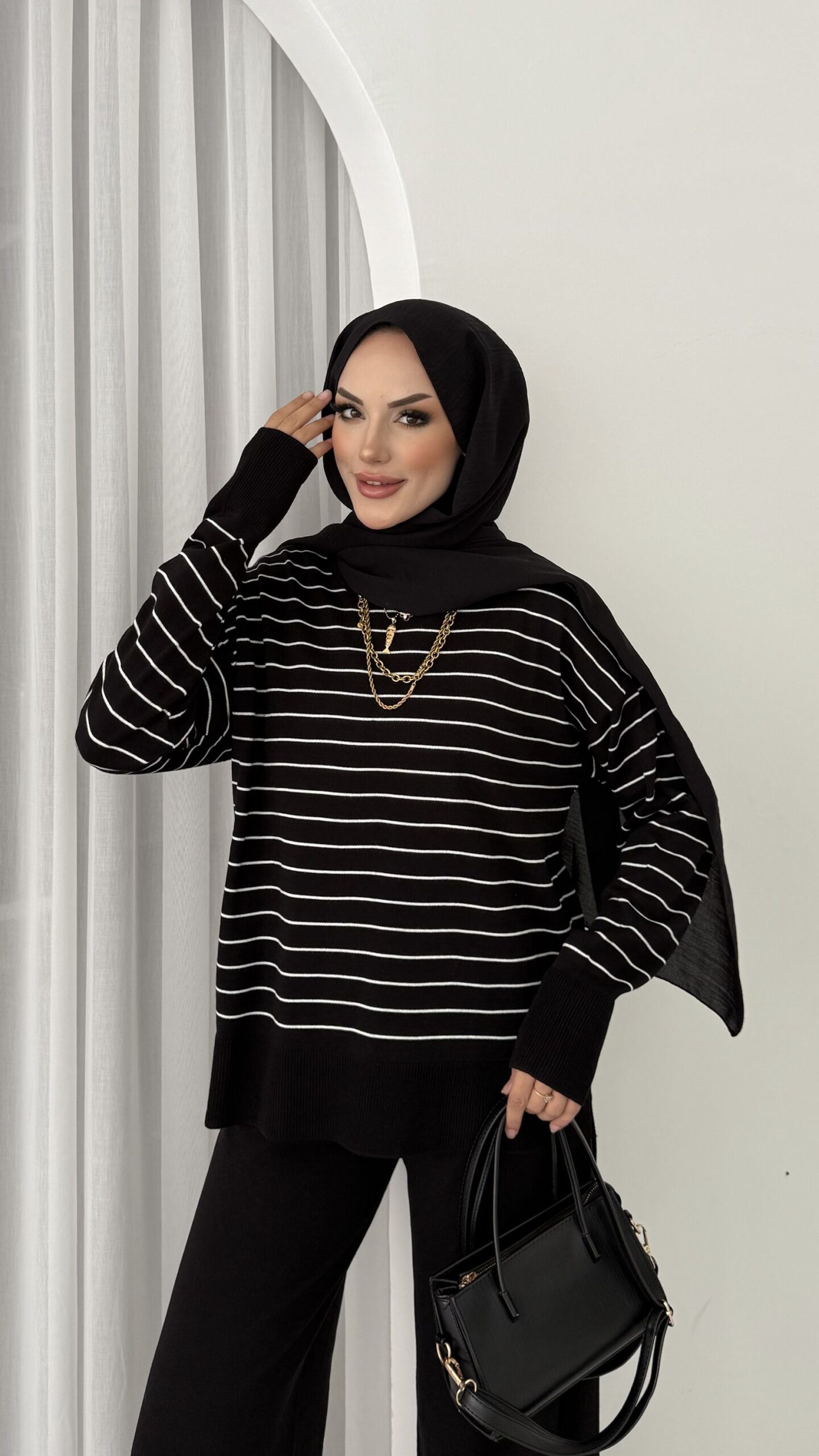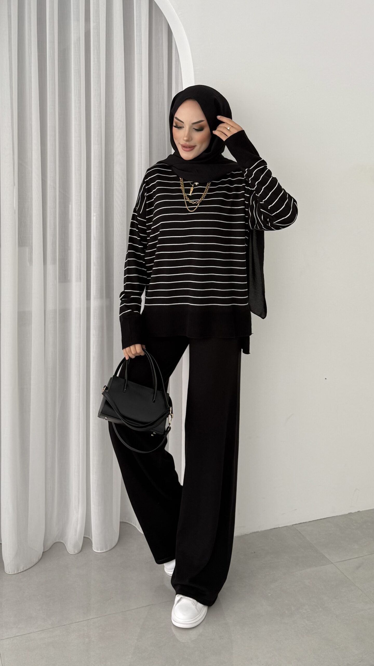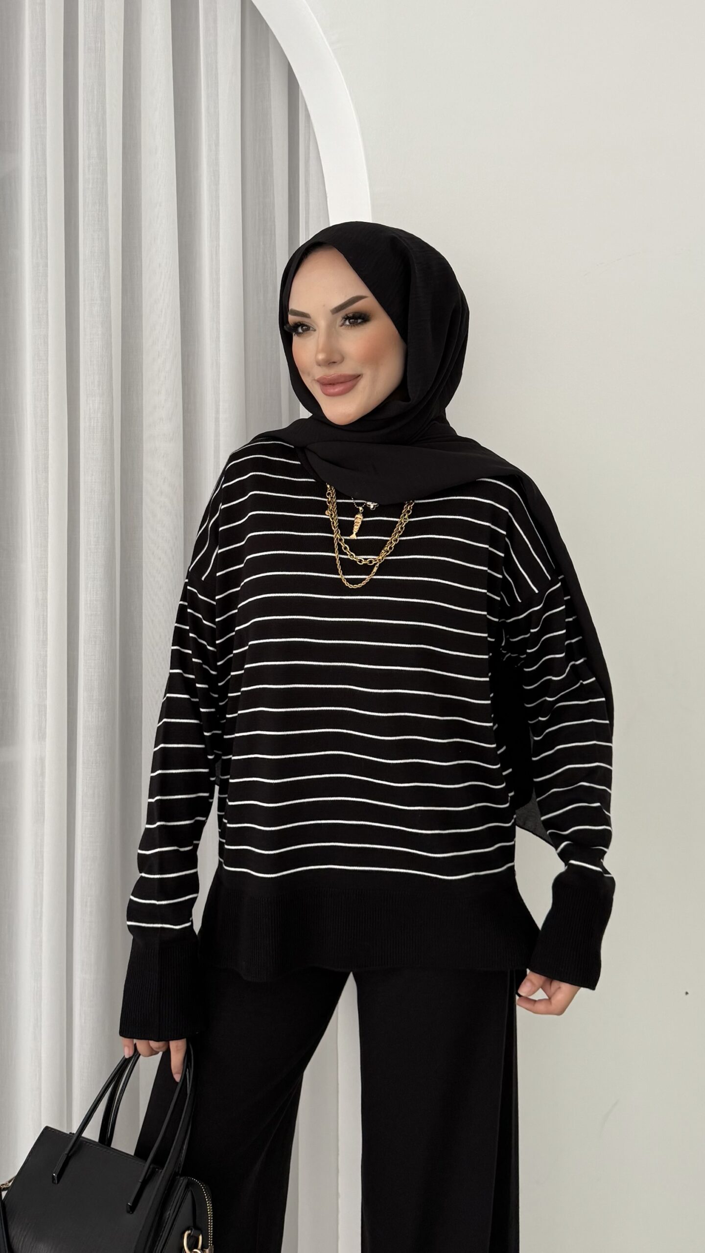 Premium Merserize Çizgili Triko İki Takım – Siyah