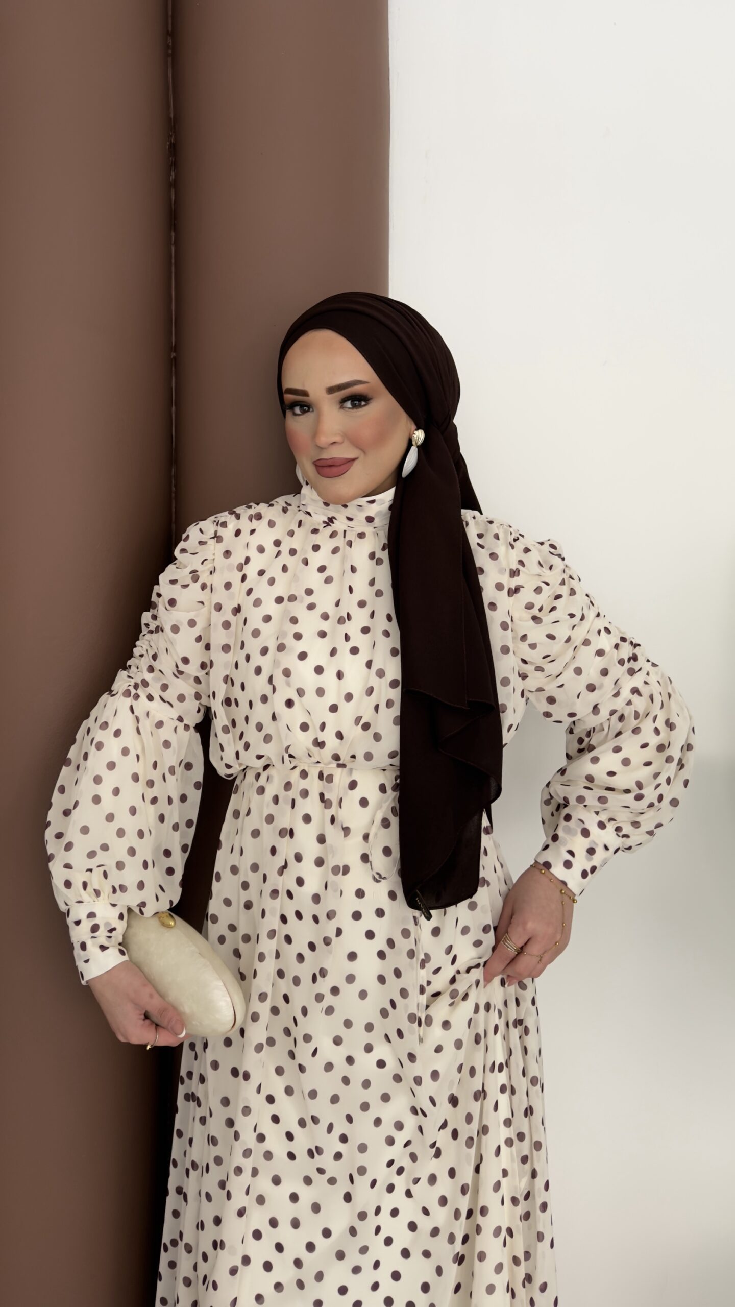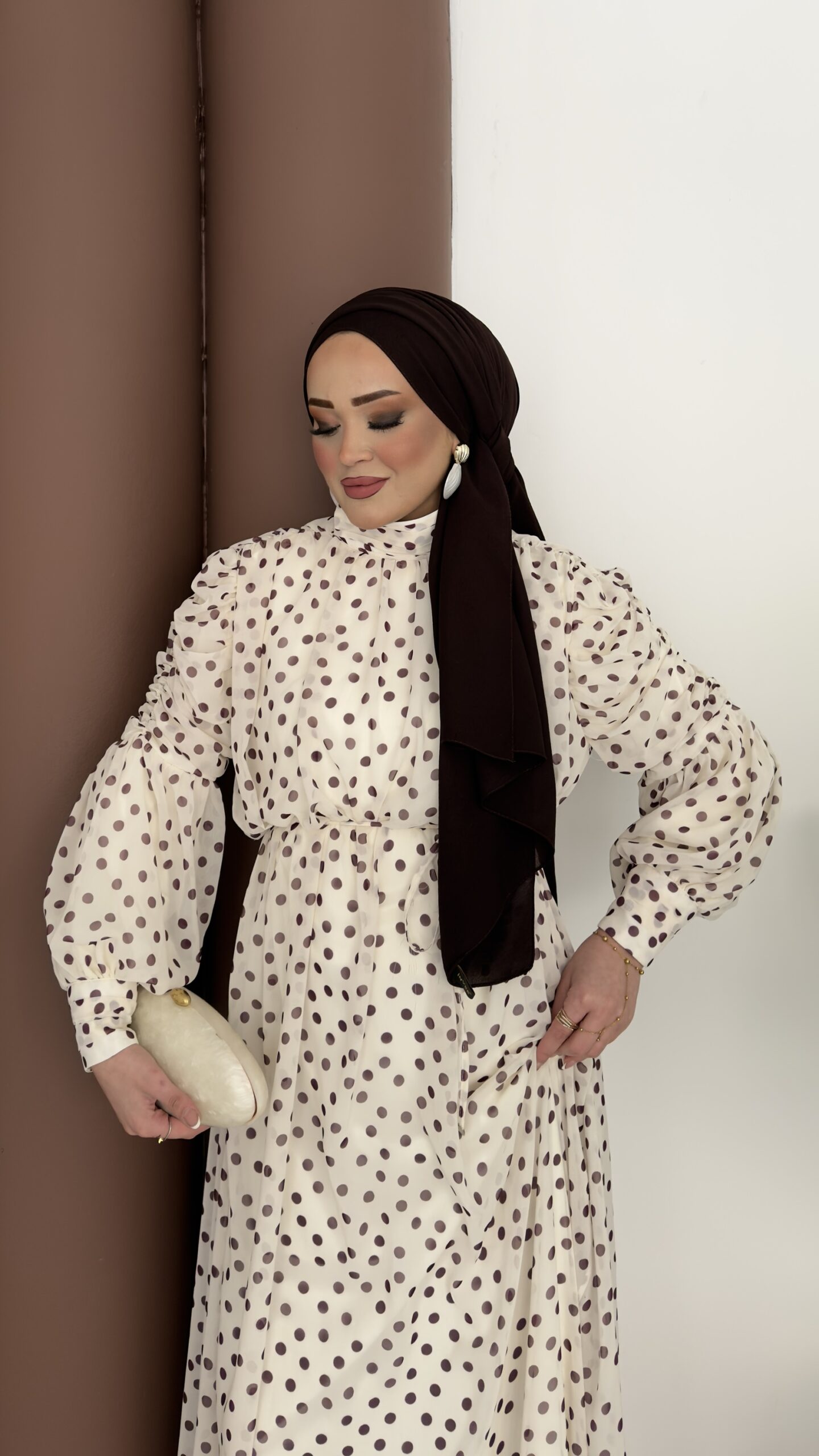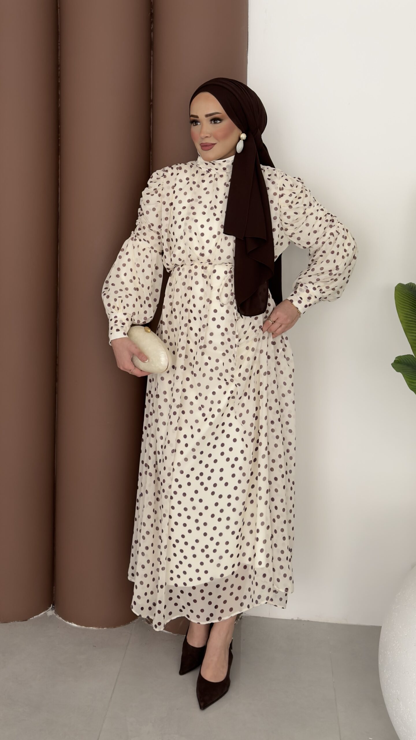 Puanteli Şifon Elbise - Kahverengi