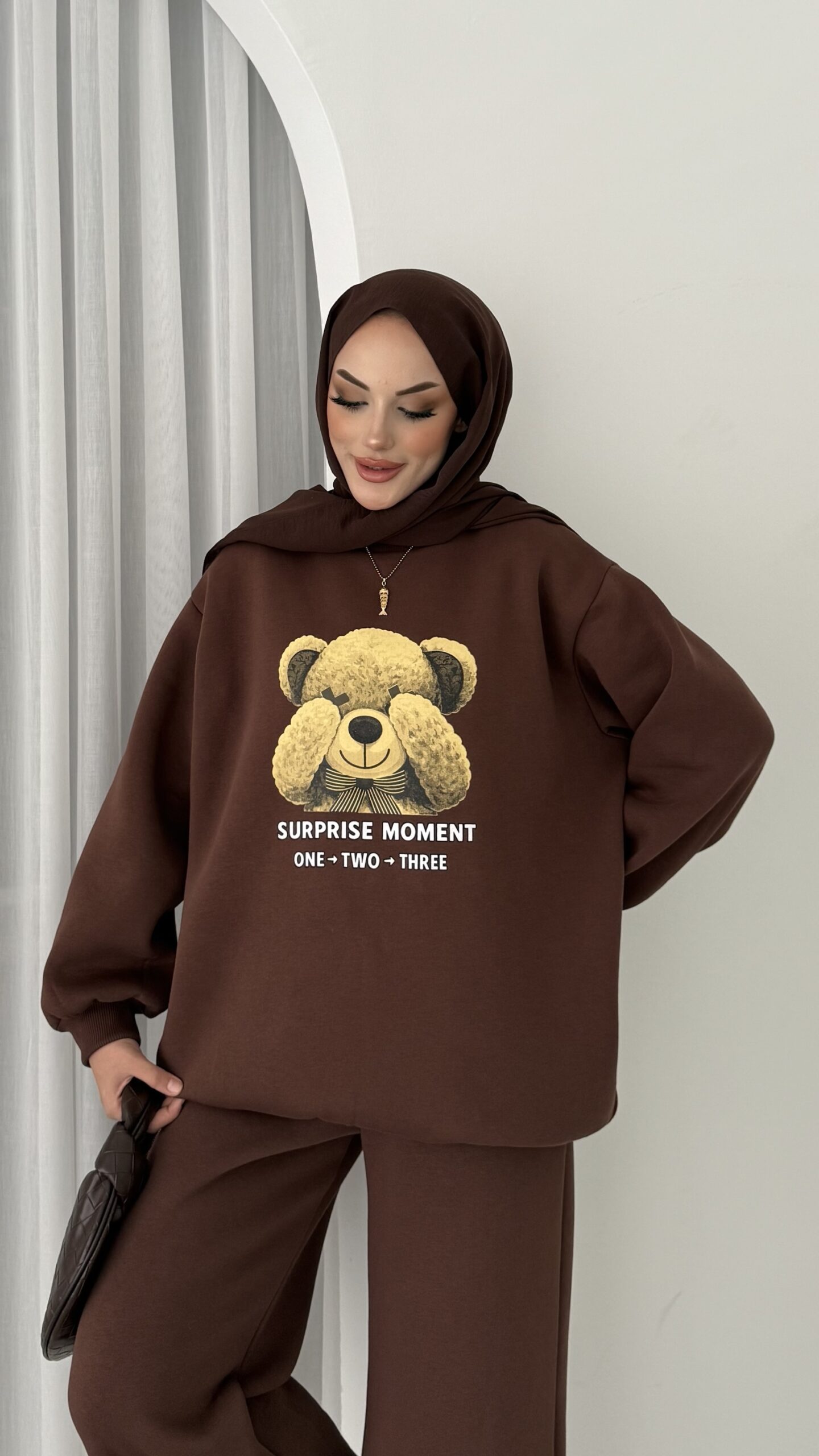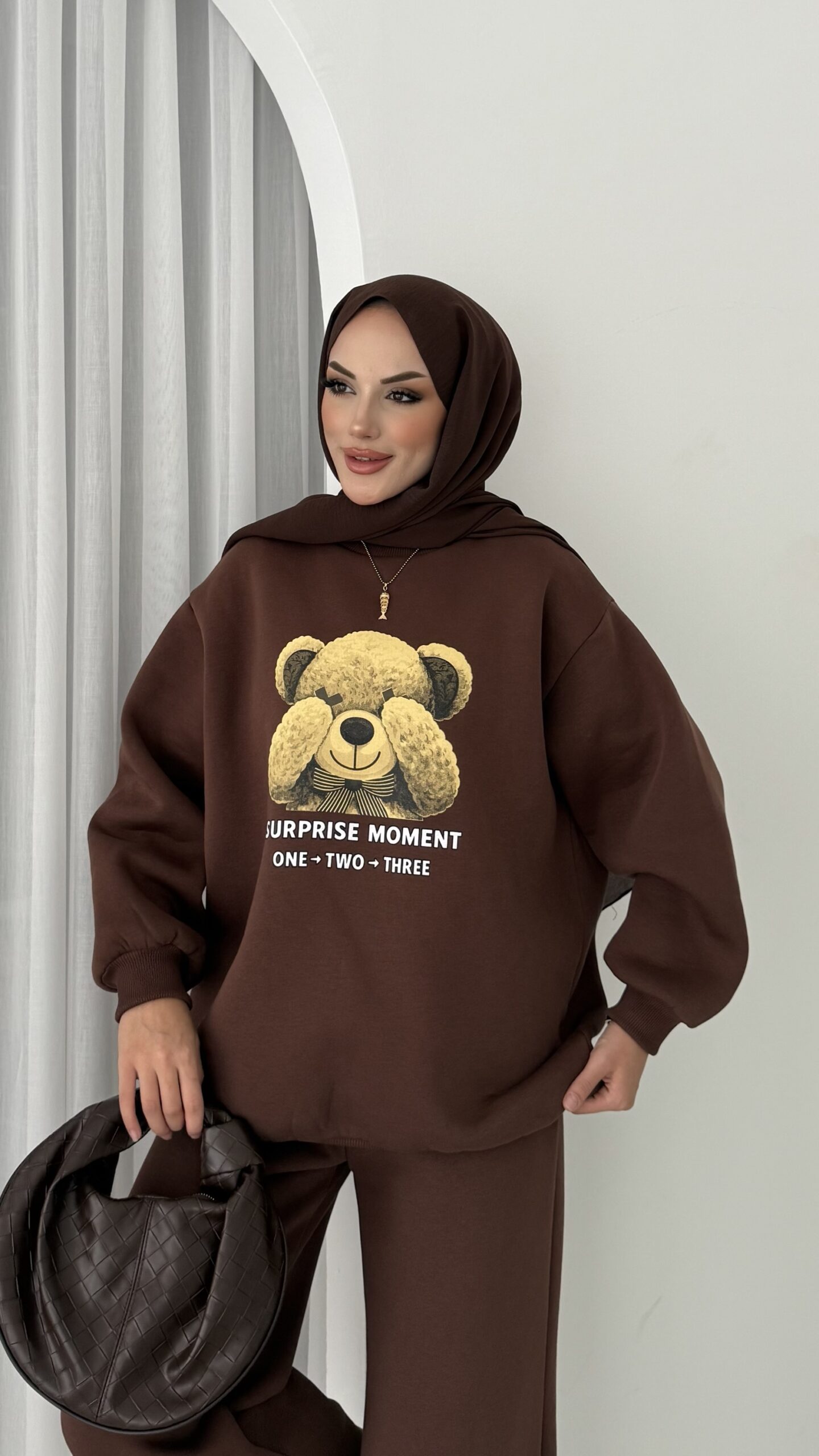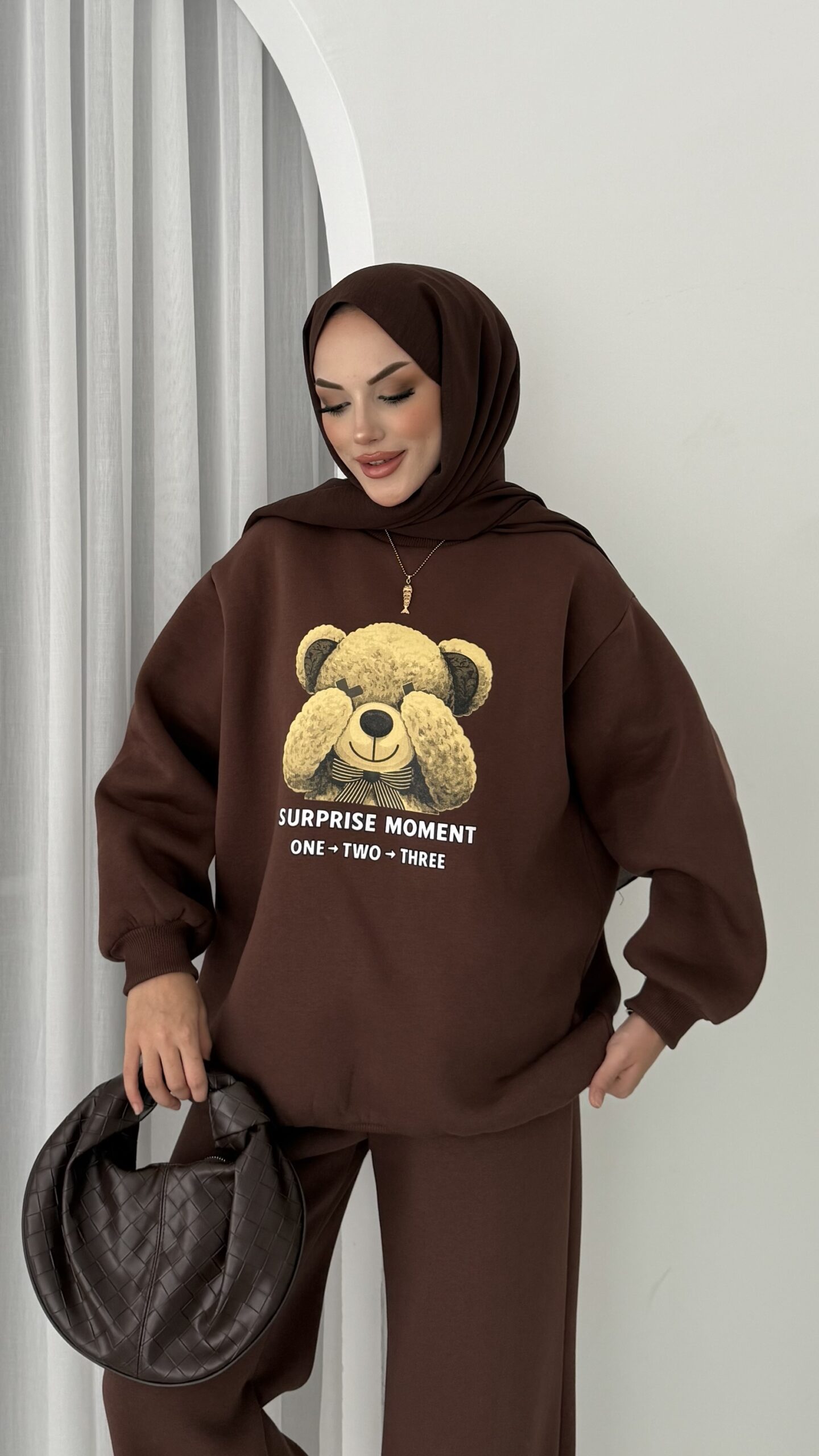Ayıcık Baskılı Şardonlu Sweat – Kahverengi