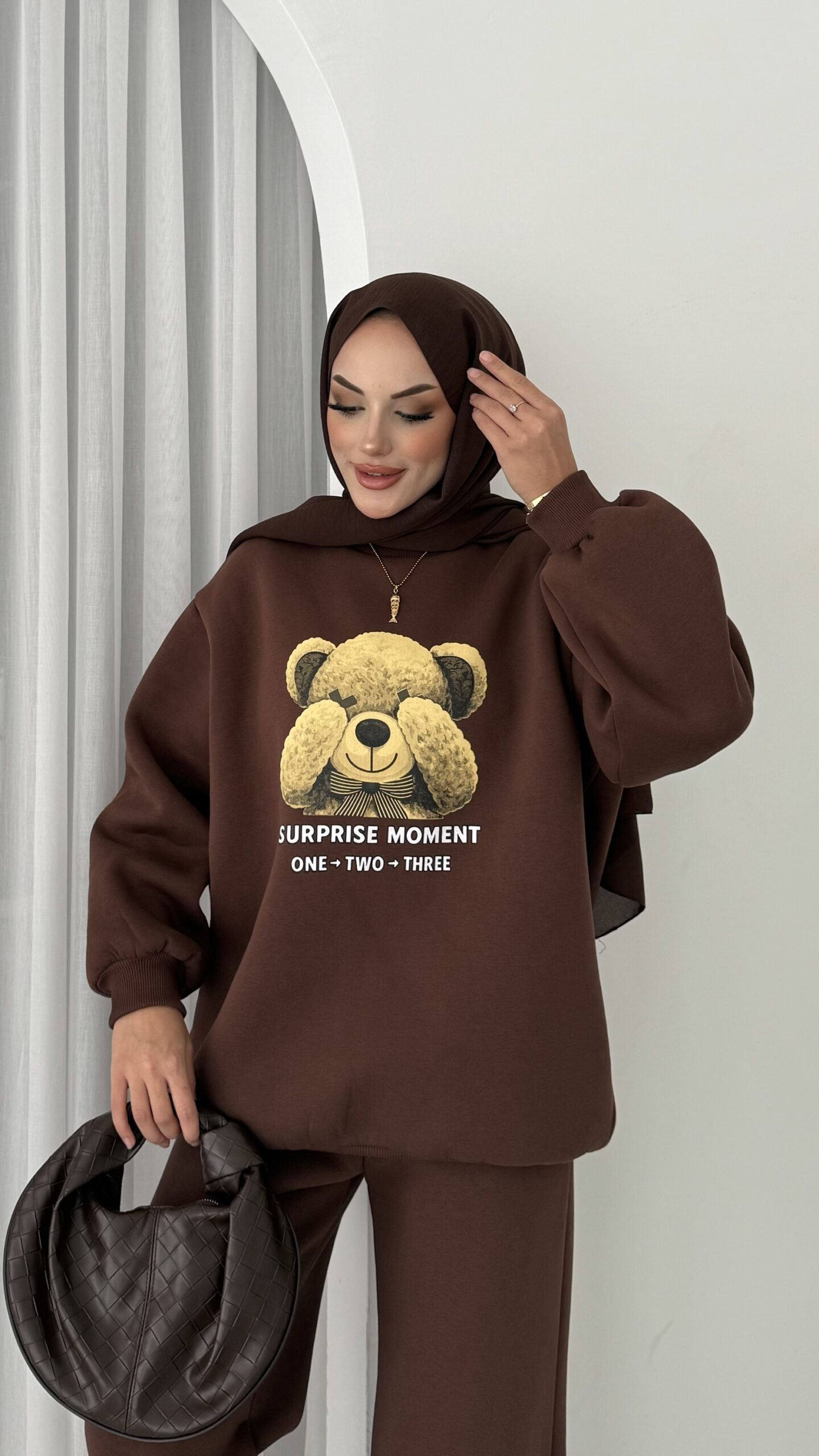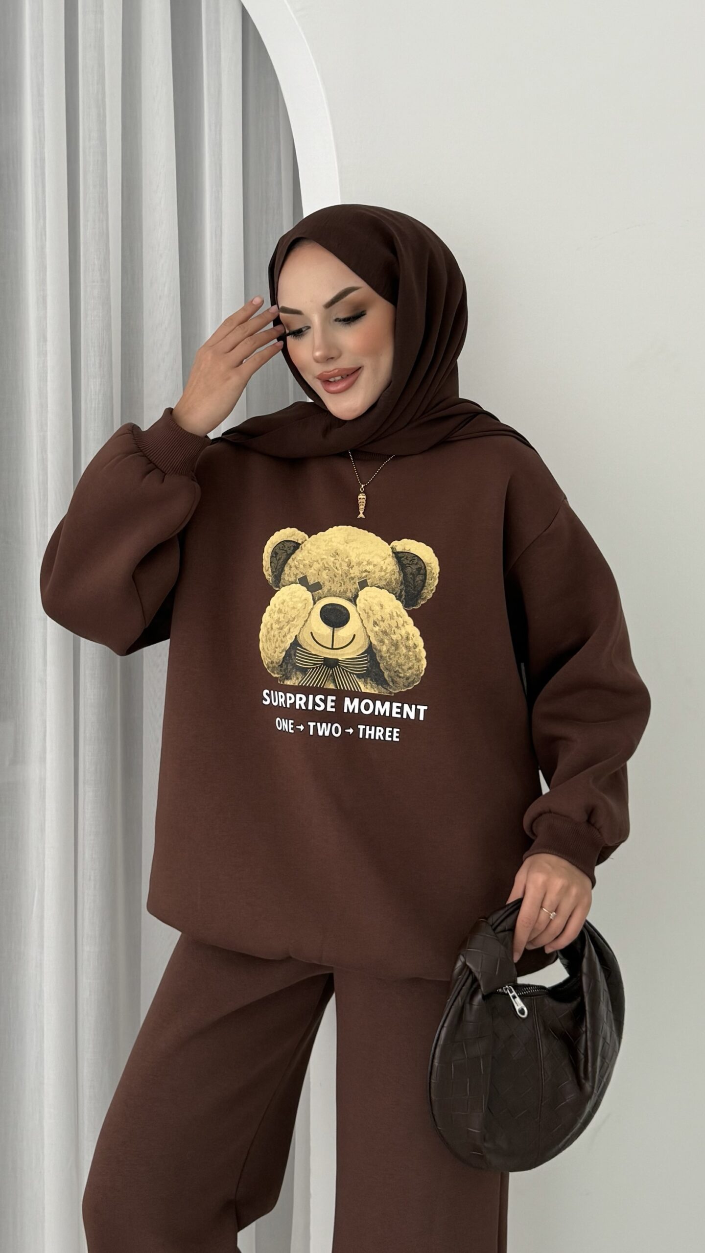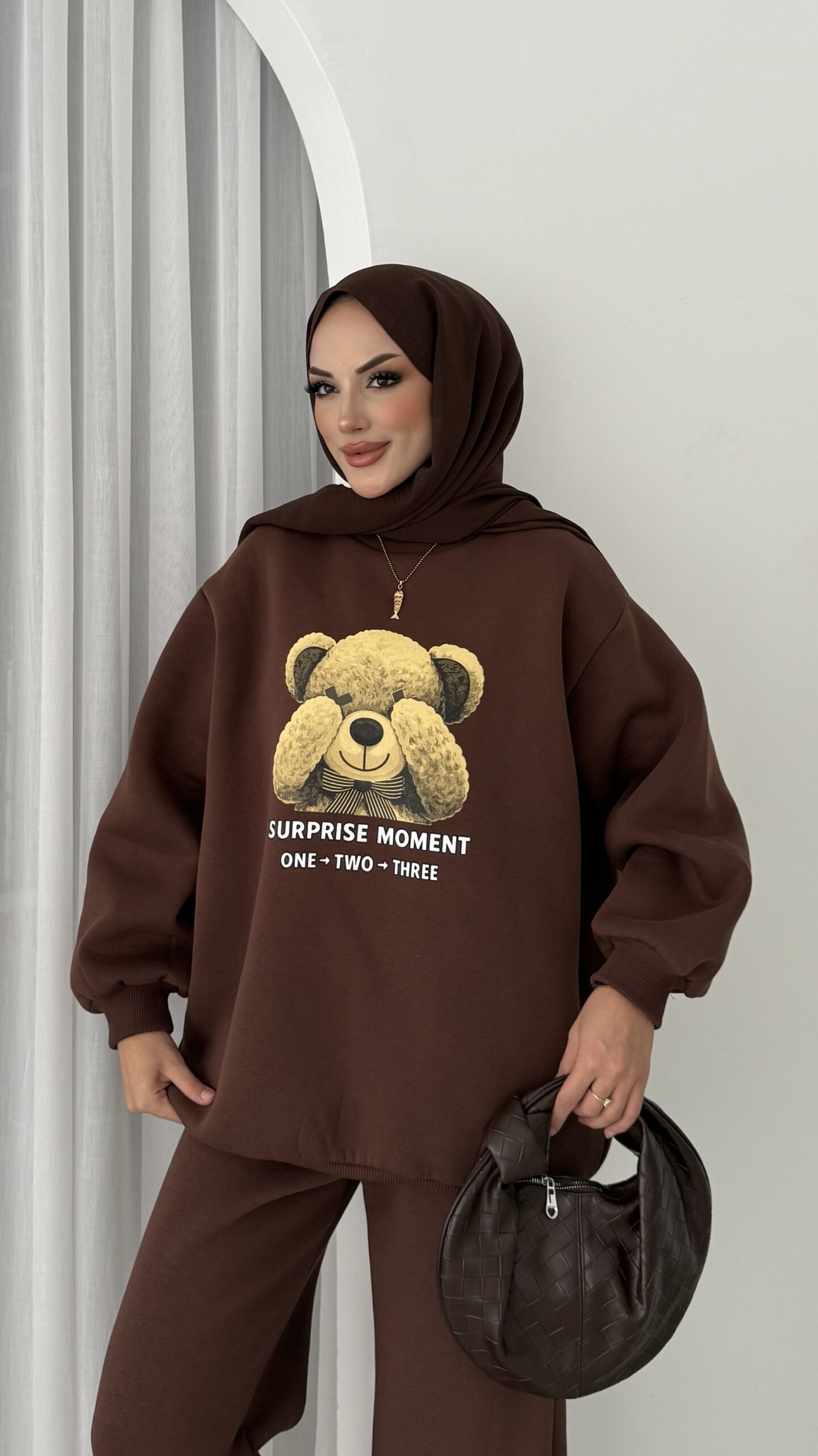 Ayıcık Baskılı Şardonlu Sweat – Kahverengi
