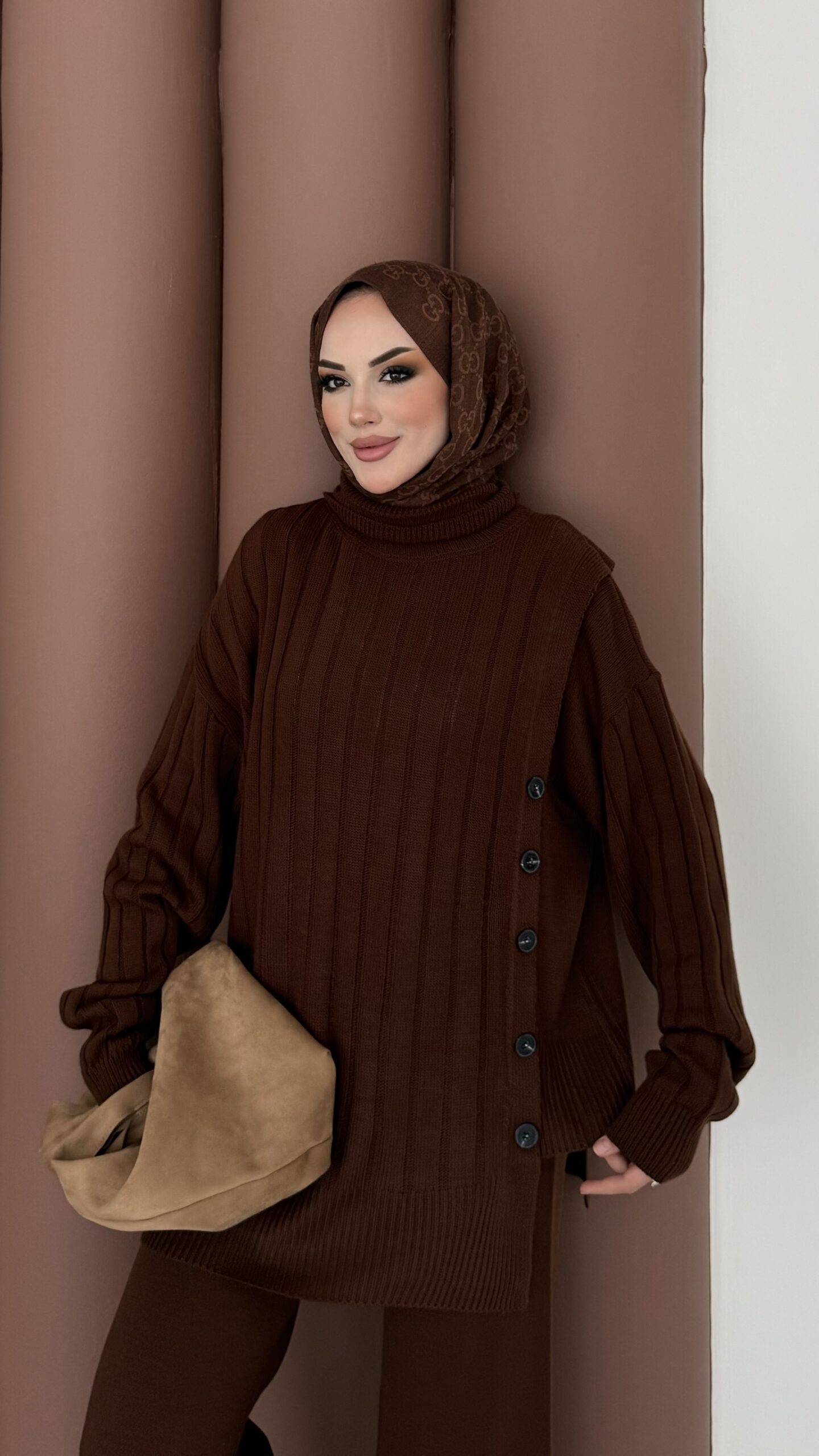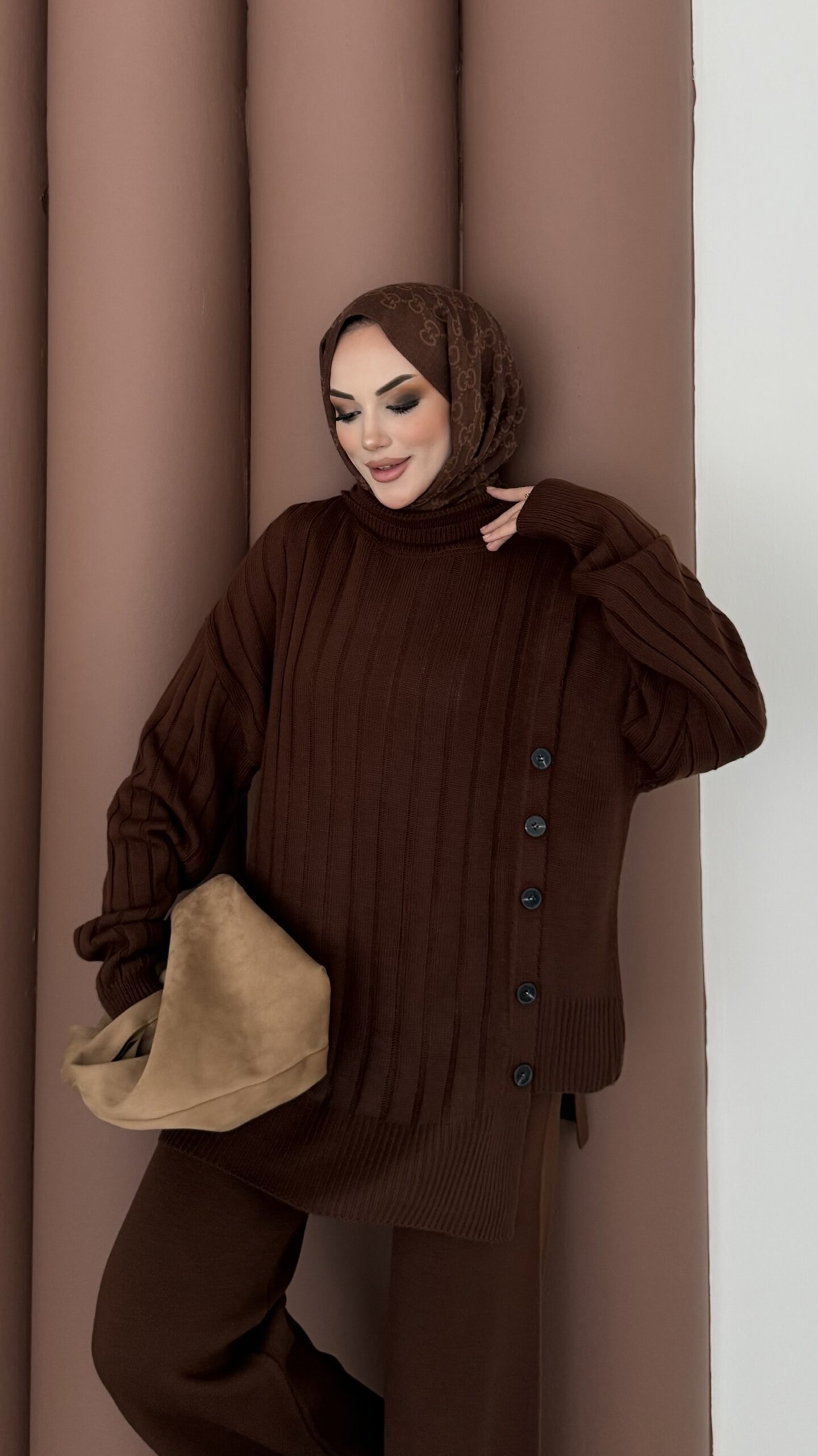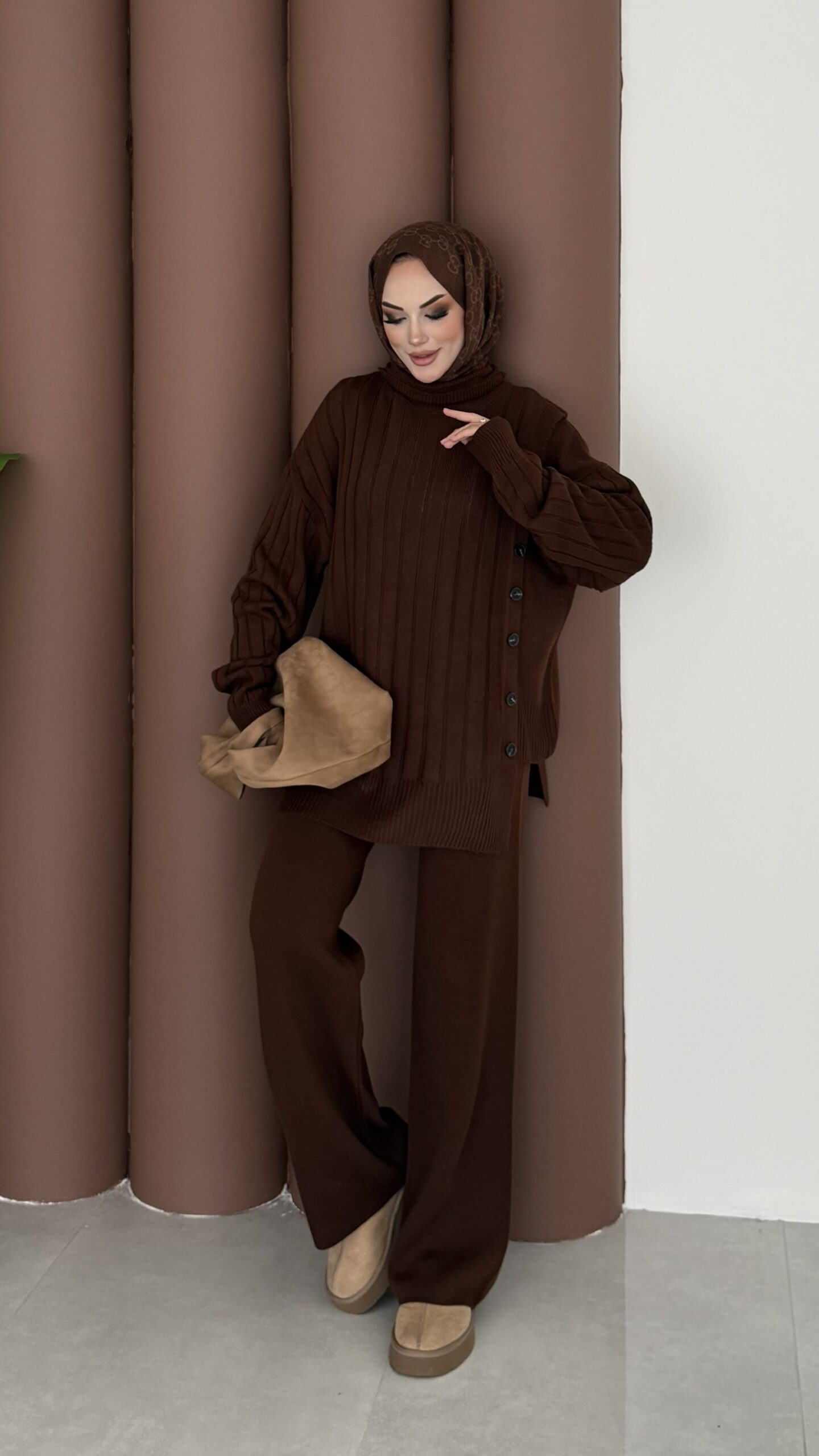 Sık Örme Fitilli Triko Takım – Kahverengi