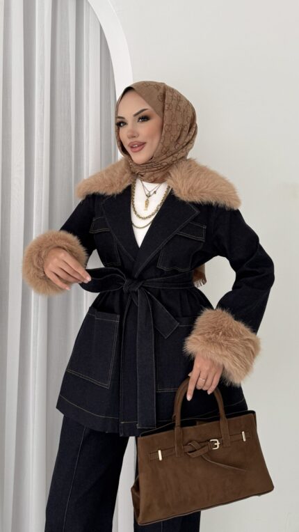 Luxury Kürklü Denim İkili Takım – Koyu Mavi