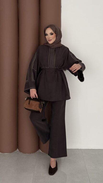 Bloom Nakışlı Modal İkili Takım – Kahverengi