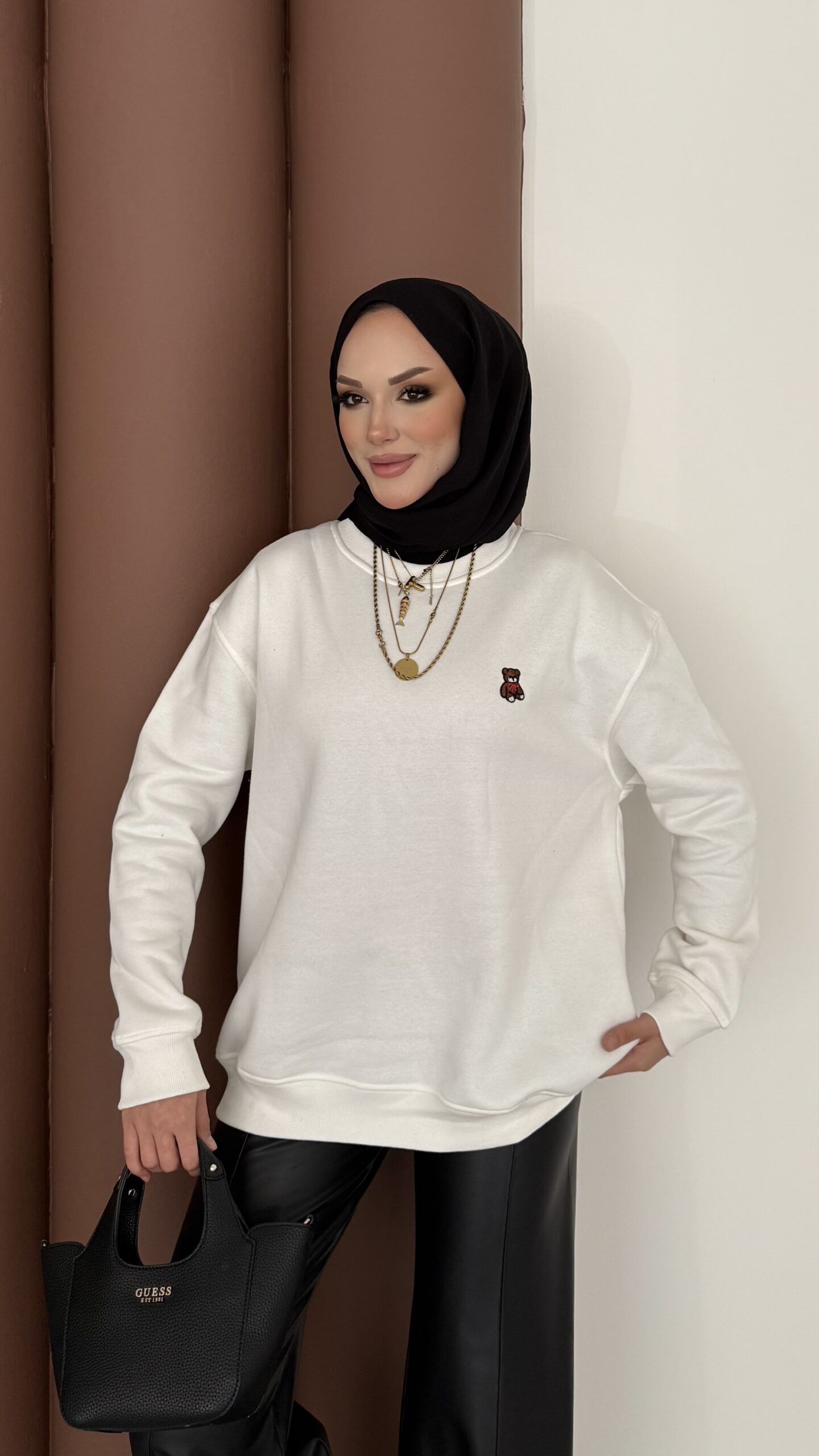 Ayıcık Baskılı Şardonlu Sweat – Beyaz