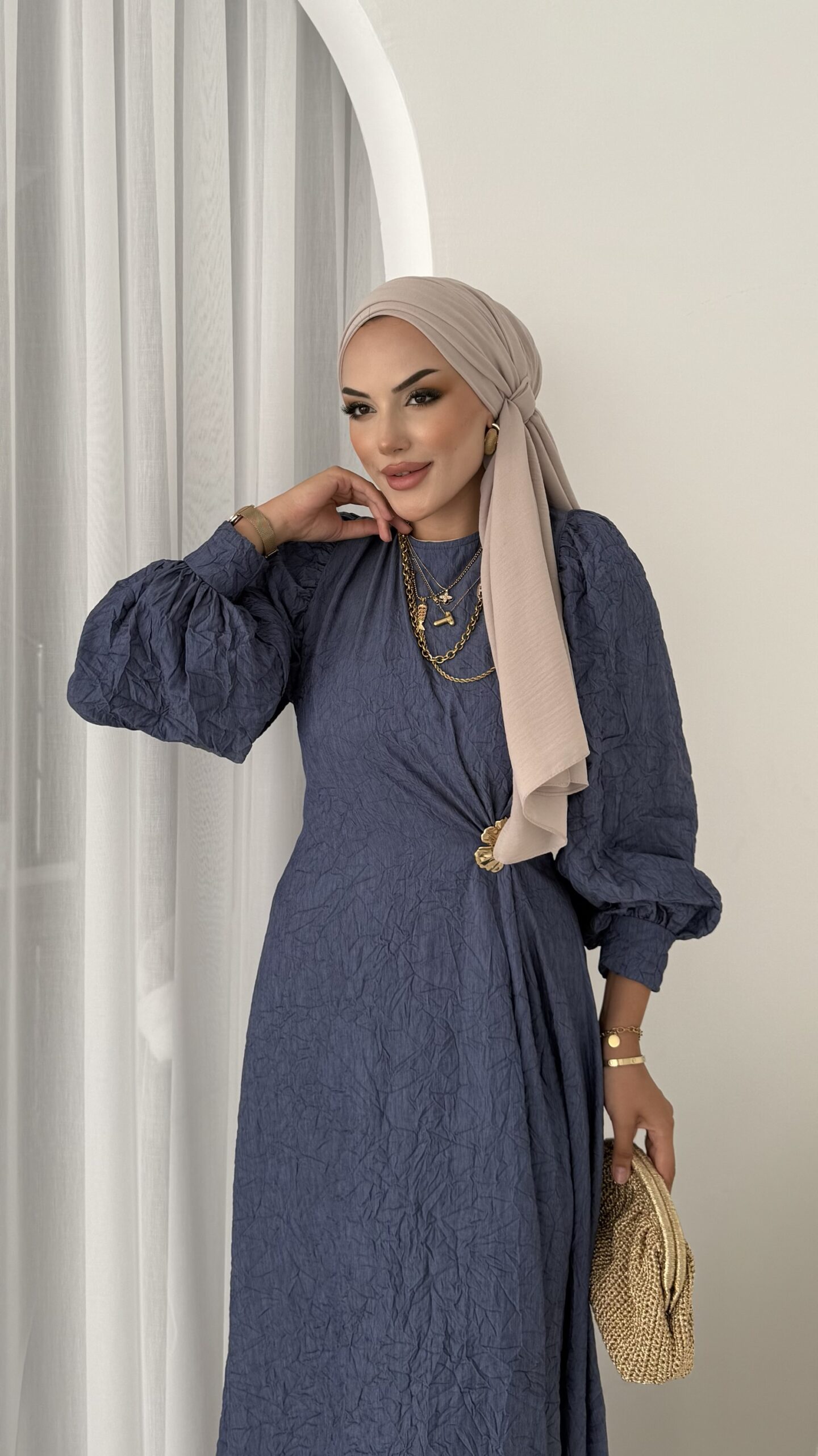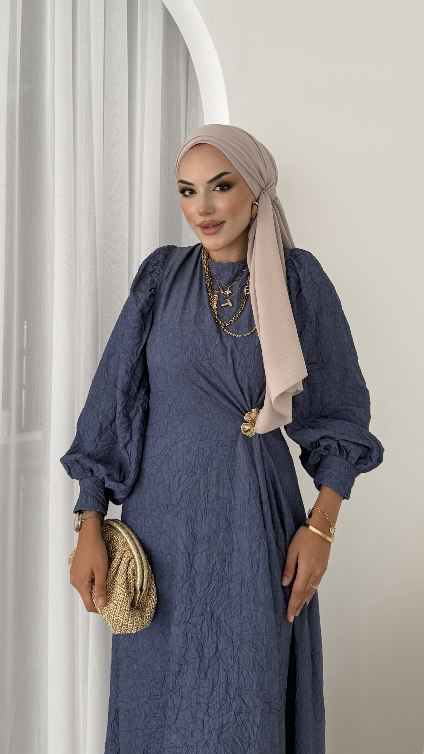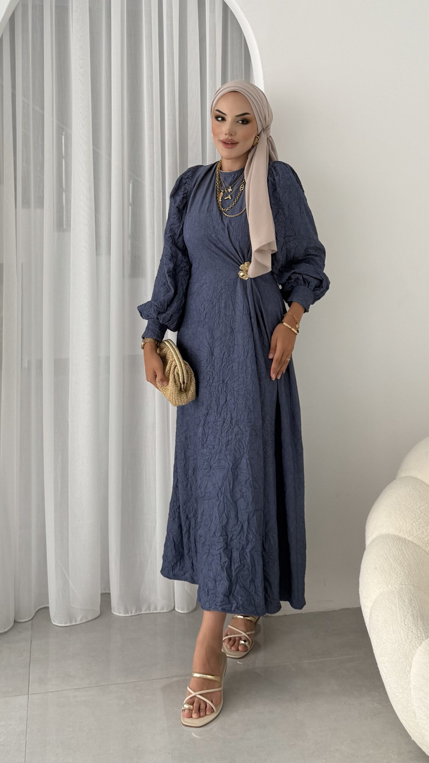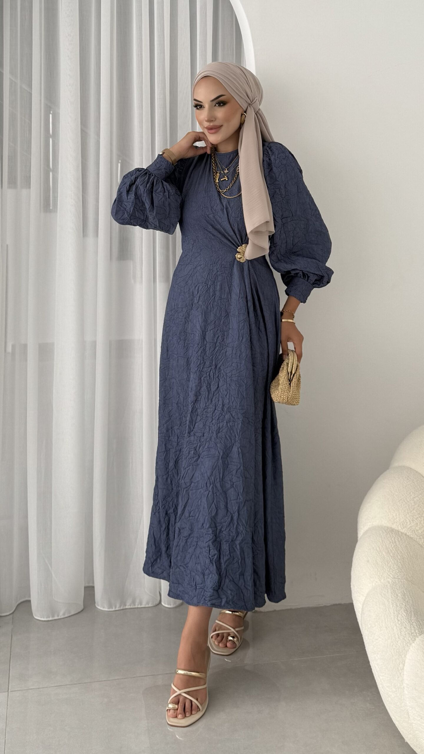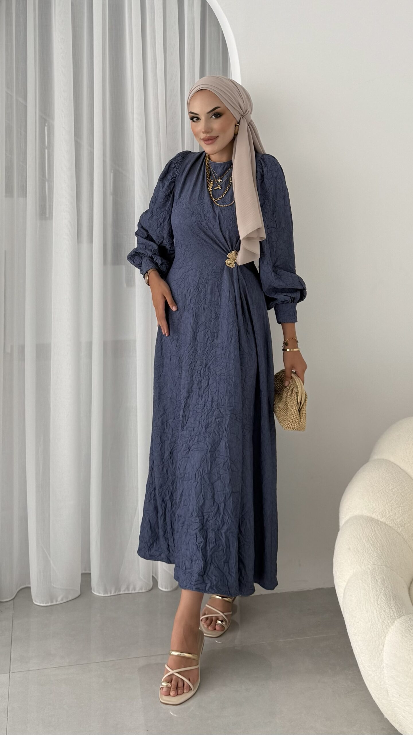 Rose Boncuk Kemerli Kot Elbise – Kahverengi
