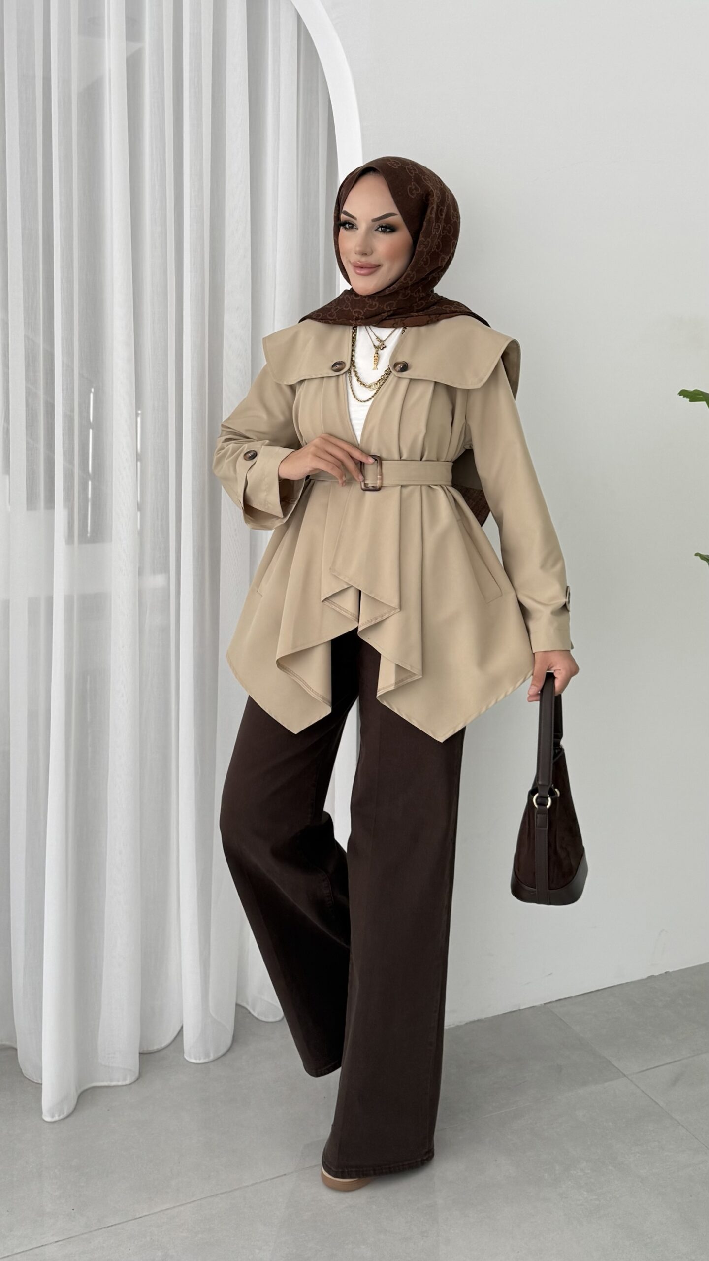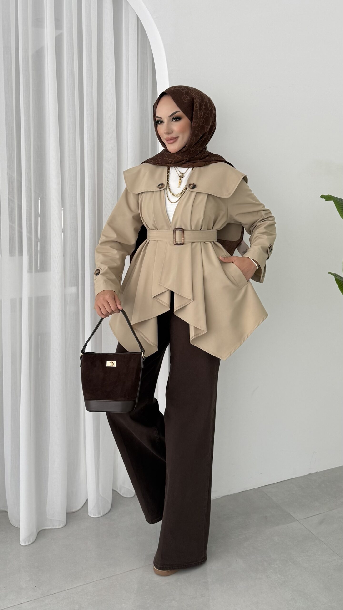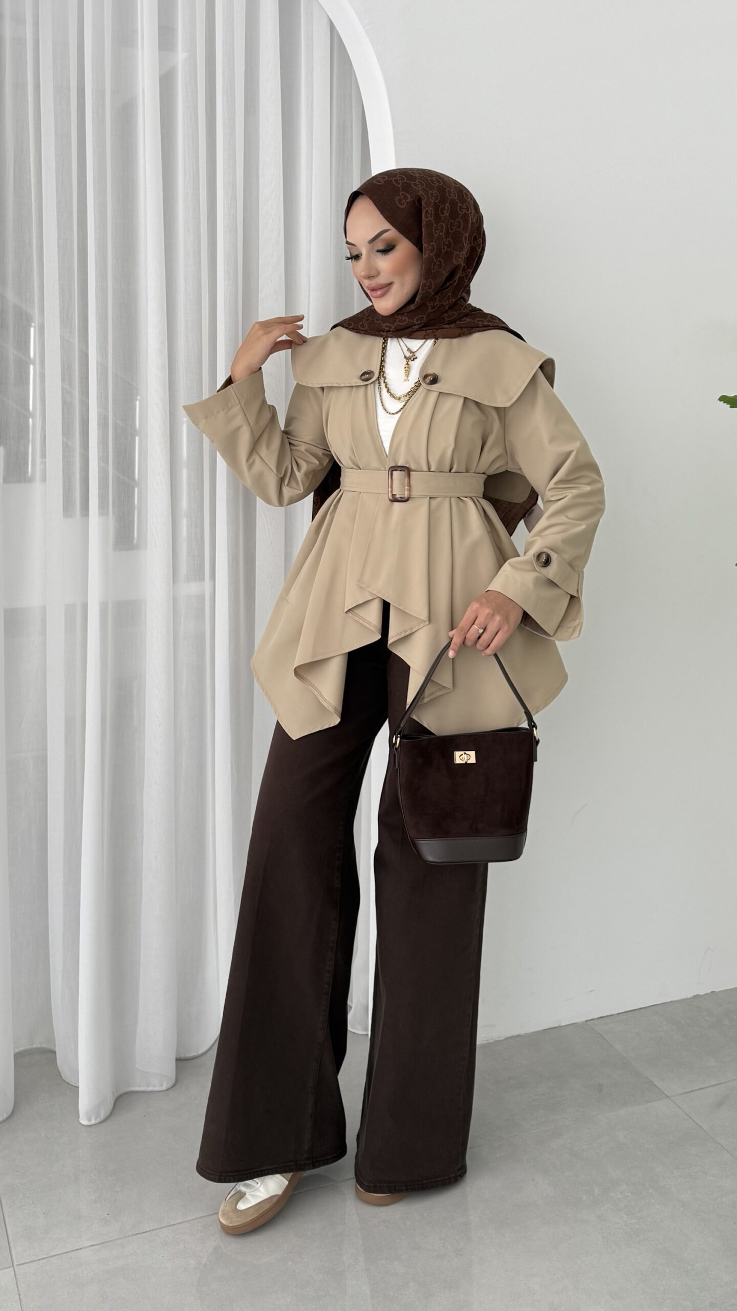 Maxi Tasarım Kemerli Trençkot – Bej