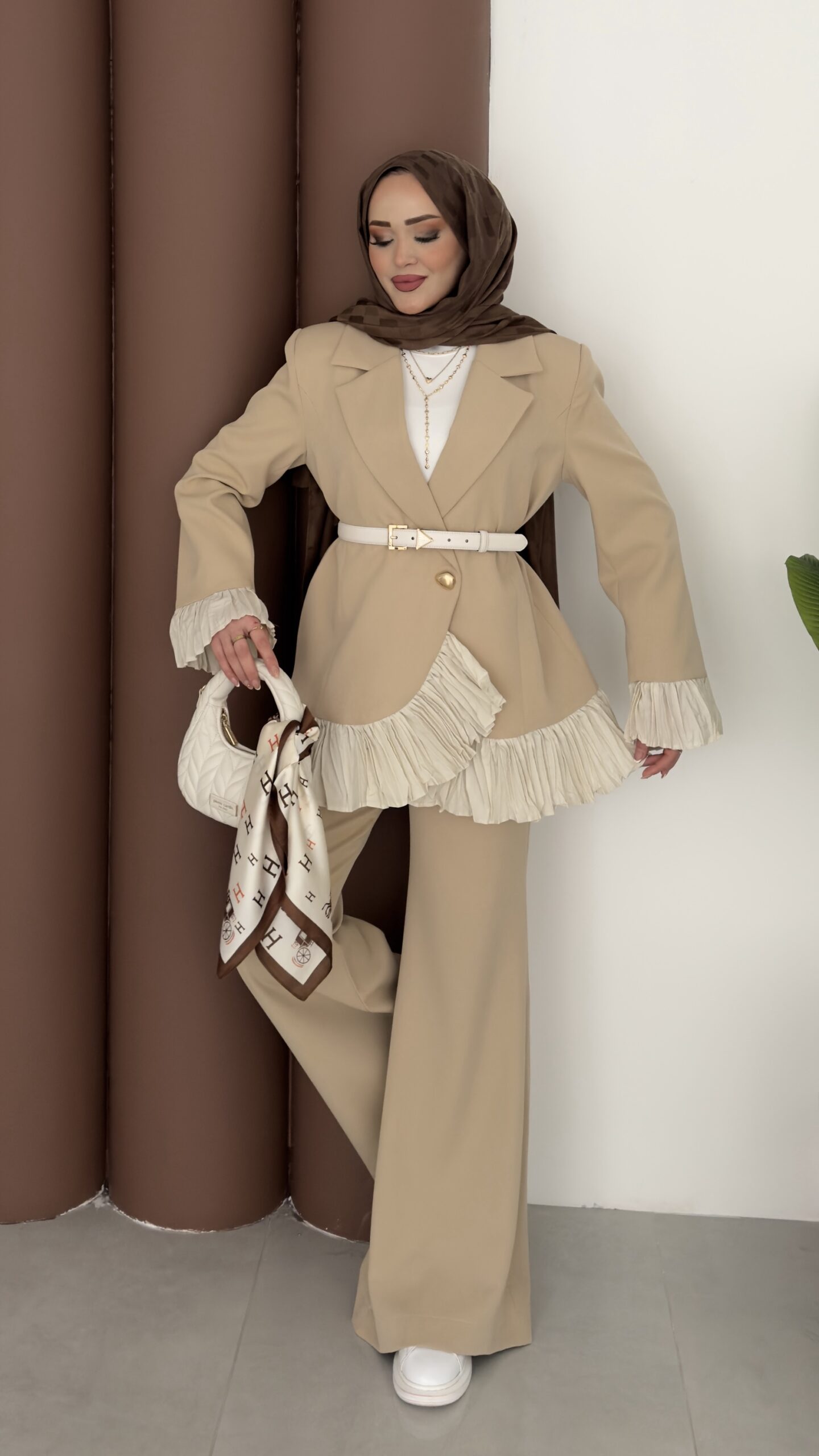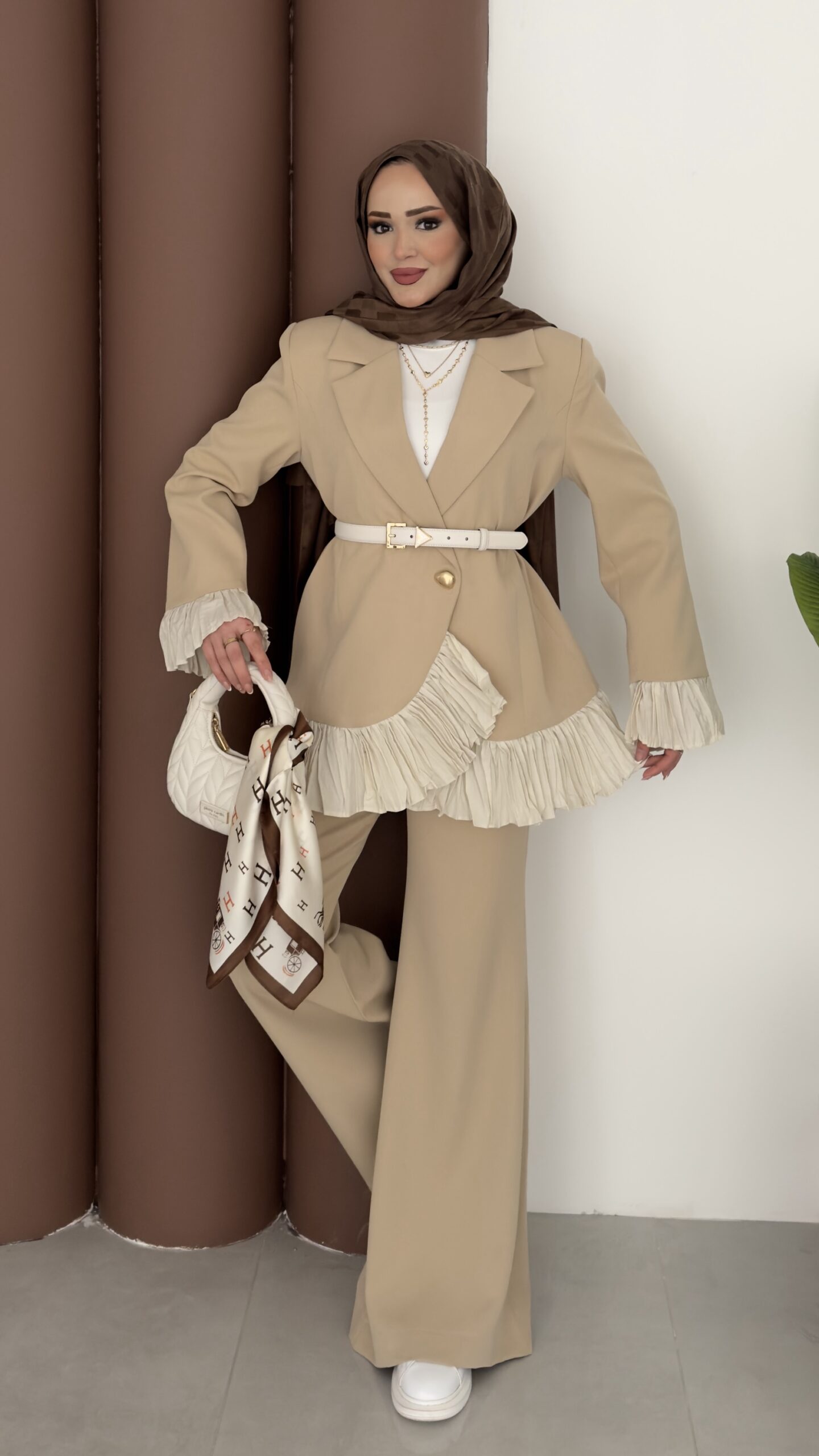 Violet Piliseli Double Blazer İkili Takım – Bej