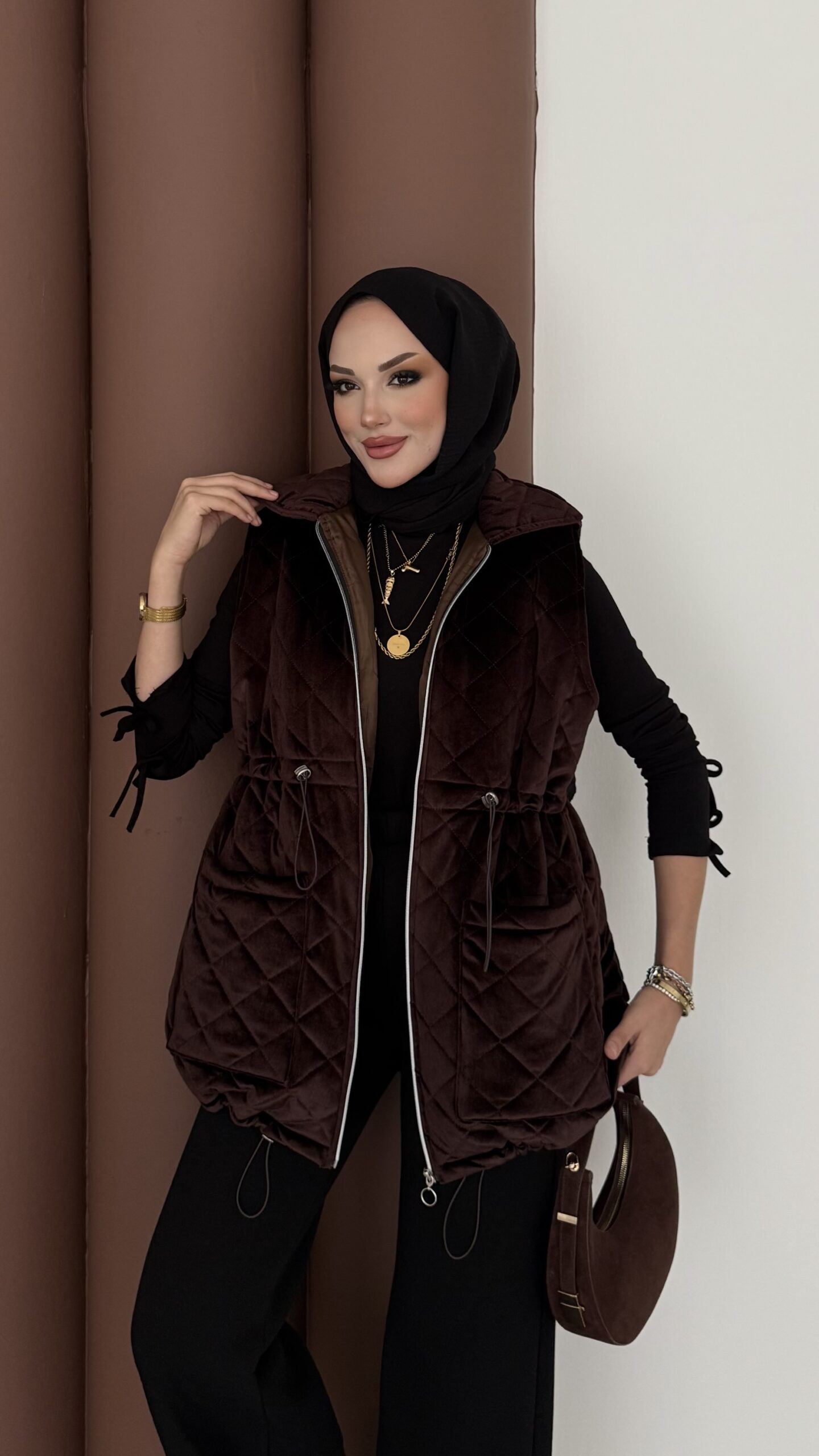 Kapitoneli Kadife Şişme Yelek – Kahverengi