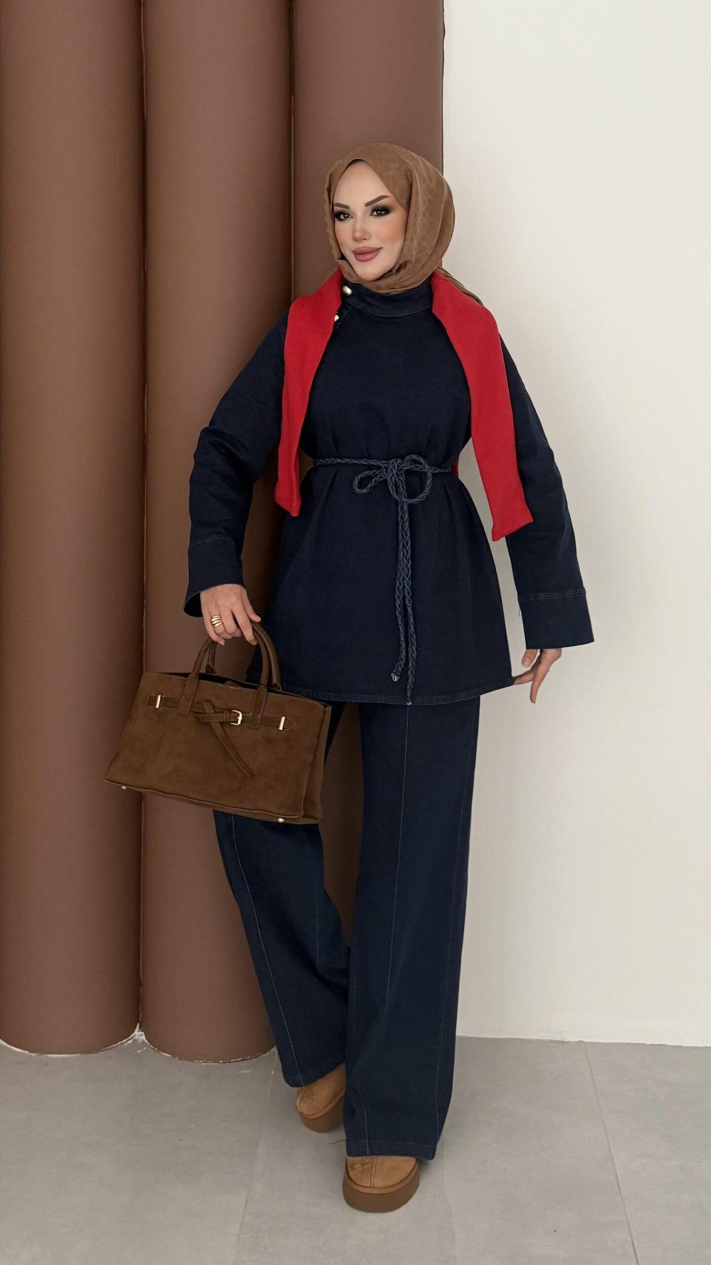 ZRA Muadil Örgü Kemerli Denim Takım – Koyu Mavi